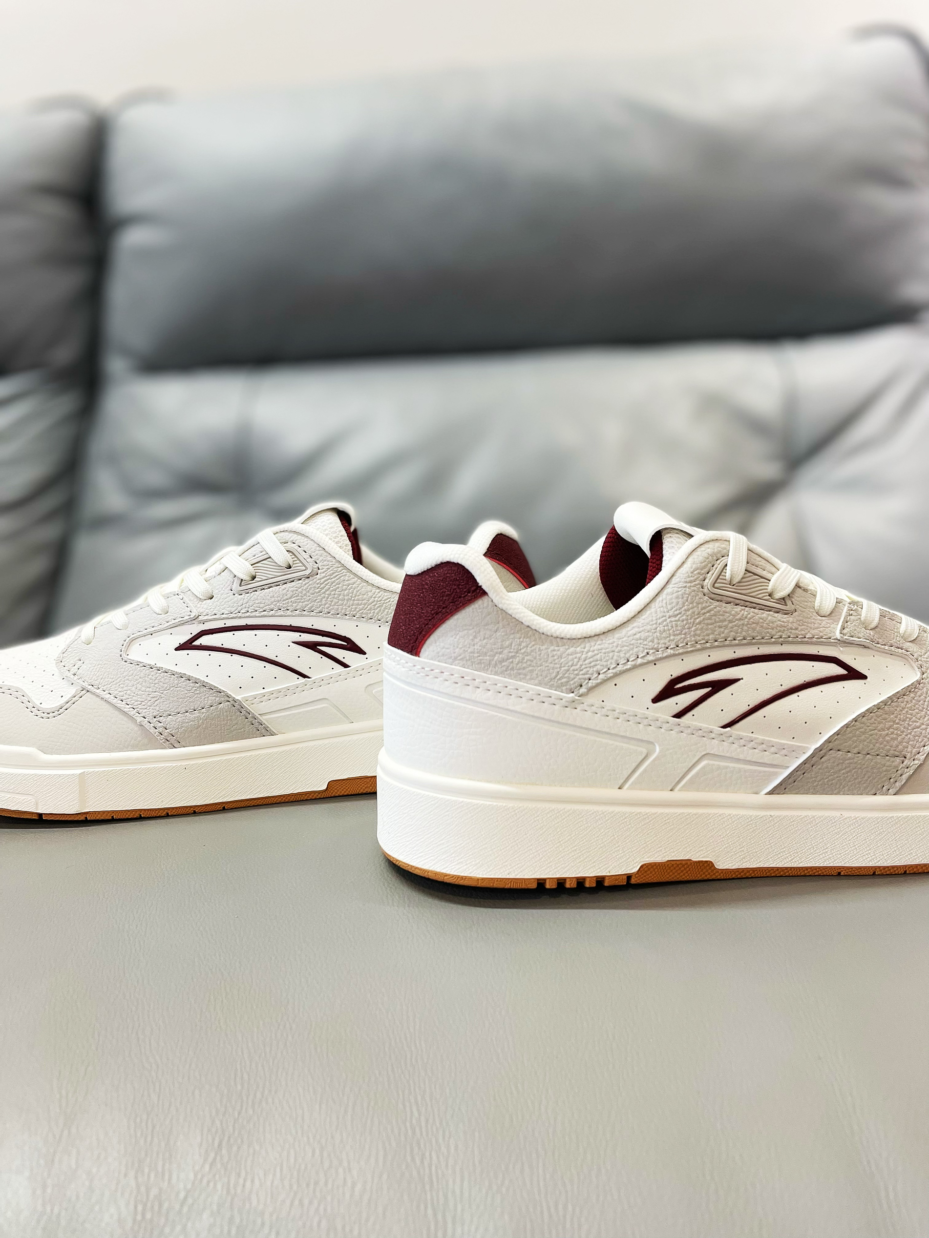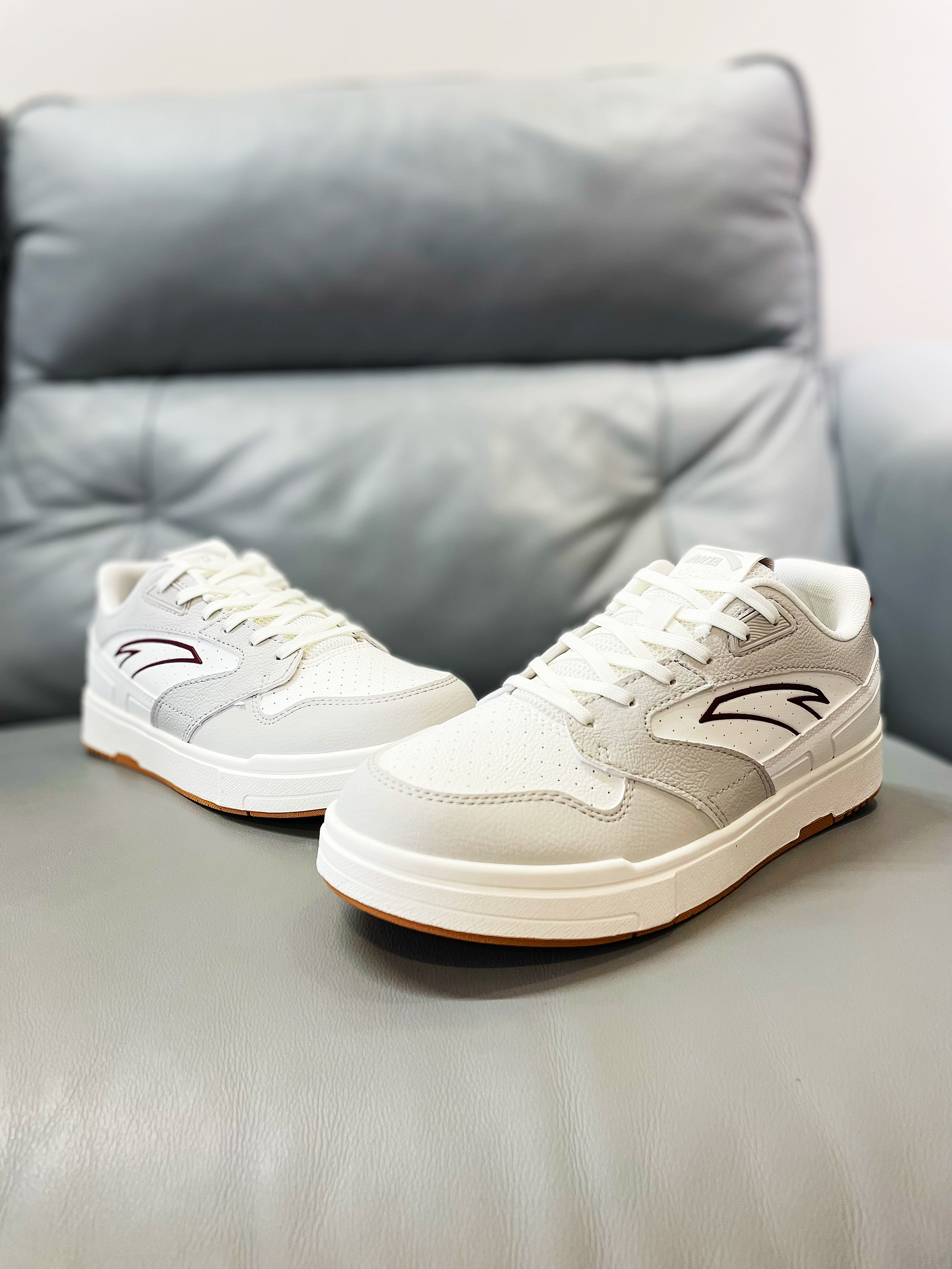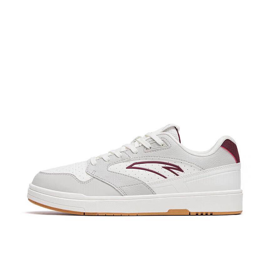 安踏设计的产品真的是越来越哇塞了,颜值和价位都是杠杠的!尤其是现在这几款板鞋,真的是抓住了很多人的心。 💖鞋面材质选用了合成革材质,橡胶底,多纹路。白灰的配色,枣红色的点缀,使得整款鞋颜色搭配完美好看,很清新。 💞颜值简直超级高,良好的脚感,出众的设计,非常好看的上脚效果,再加上很低的价位,简直所有的优点人全都被它一个占领了!超级百搭的属性,注定了它是一款非常热销的鞋。