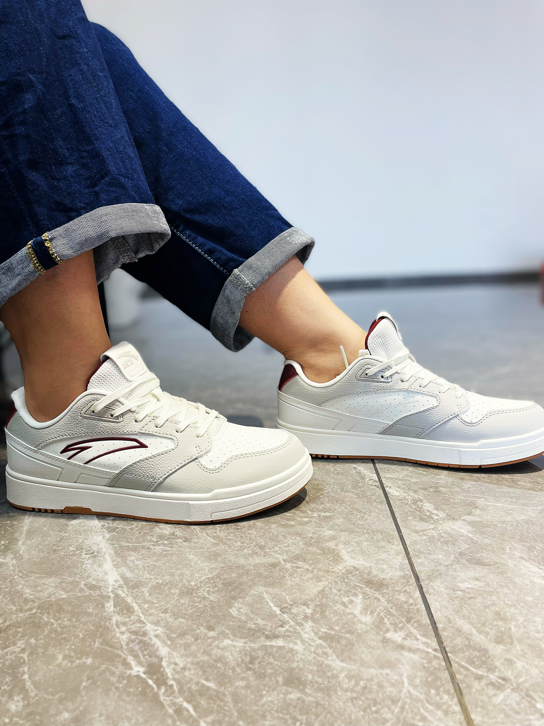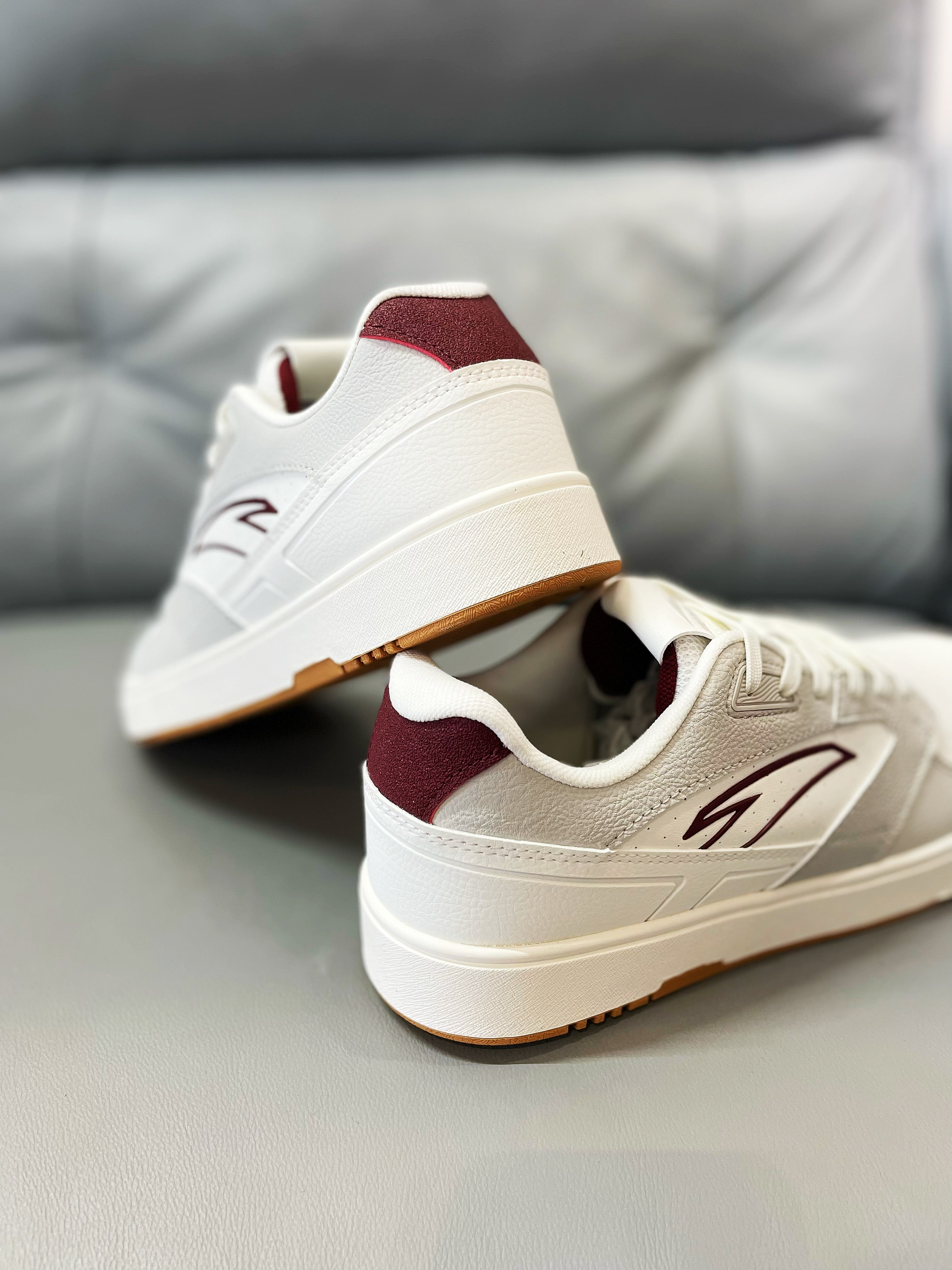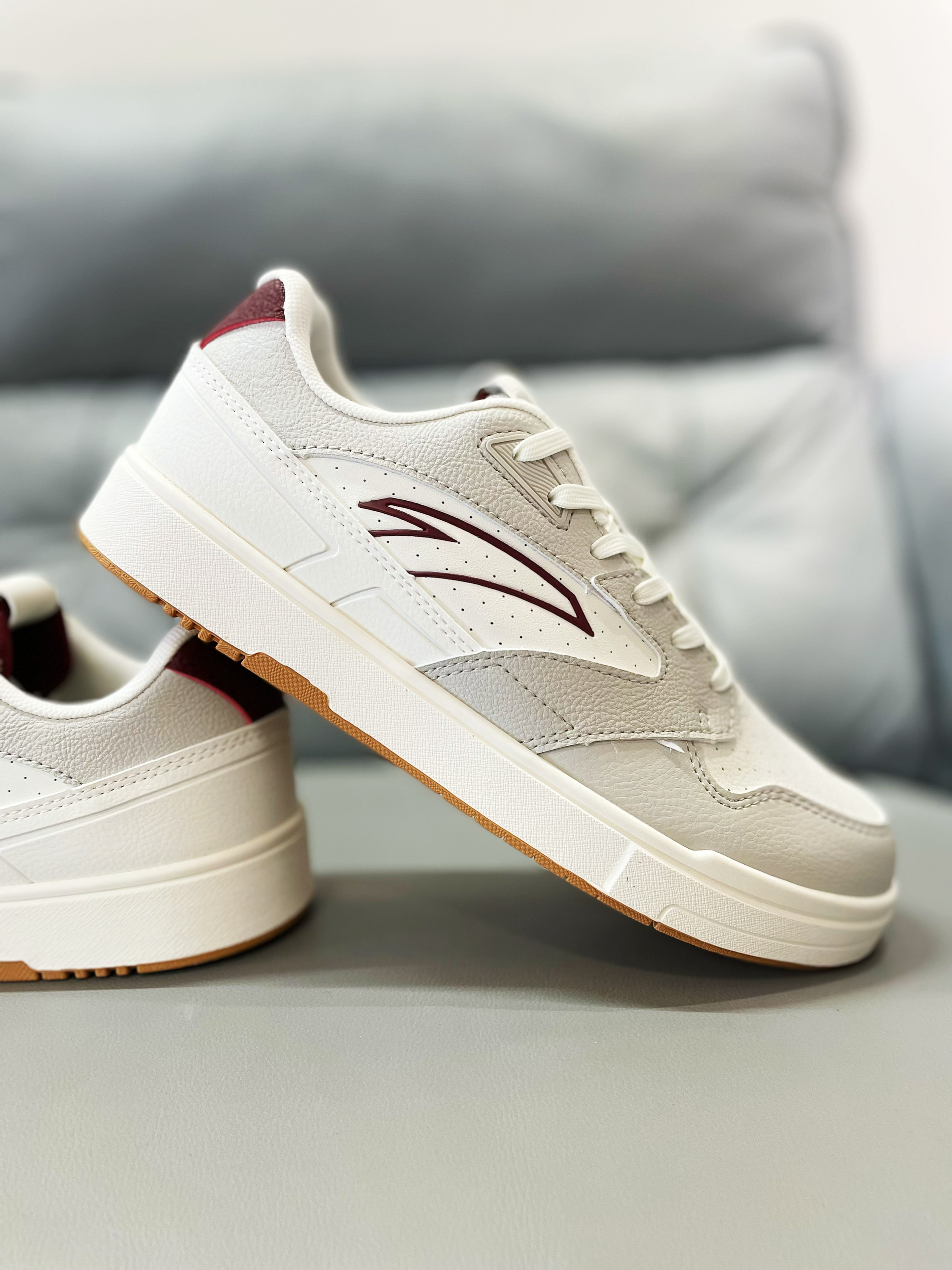 安踏设计的产品真的是越来越哇塞了,颜值和价位都是杠杠的!尤其是现在这几款板鞋,真的是抓住了很多人的心。 💖鞋面材质选用了合成革材质,橡胶底,多纹路。白灰的配色,枣红色的点缀,使得整款鞋颜色搭配完美好看,很清新。 💞颜值简直超级高,良好的脚感,出众的设计,非常好看的上脚效果,再加上很低的价位,简直所有的优点人全都被它一个占领了!超级百搭的属性,注定了它是一款非常热销的鞋。