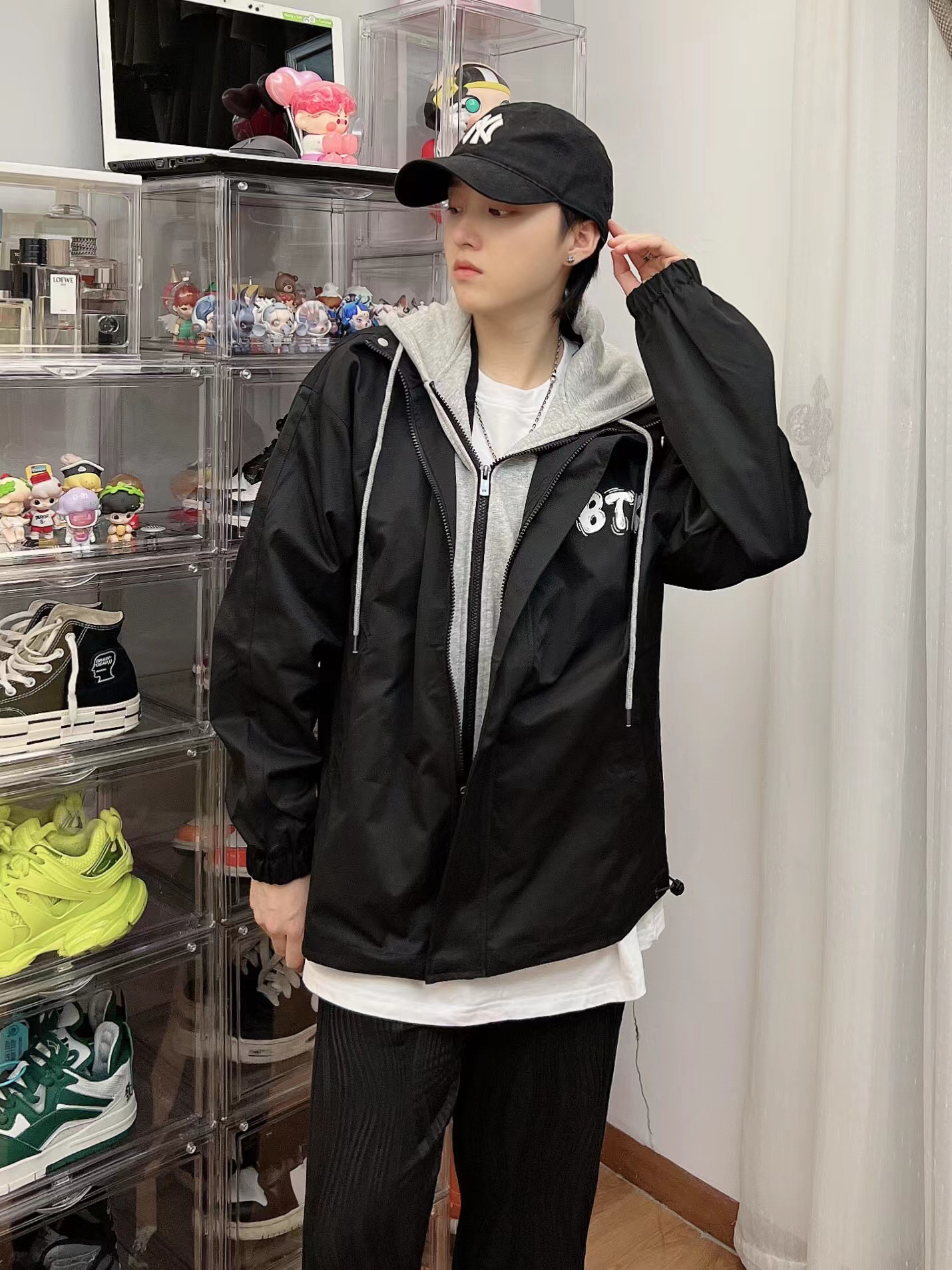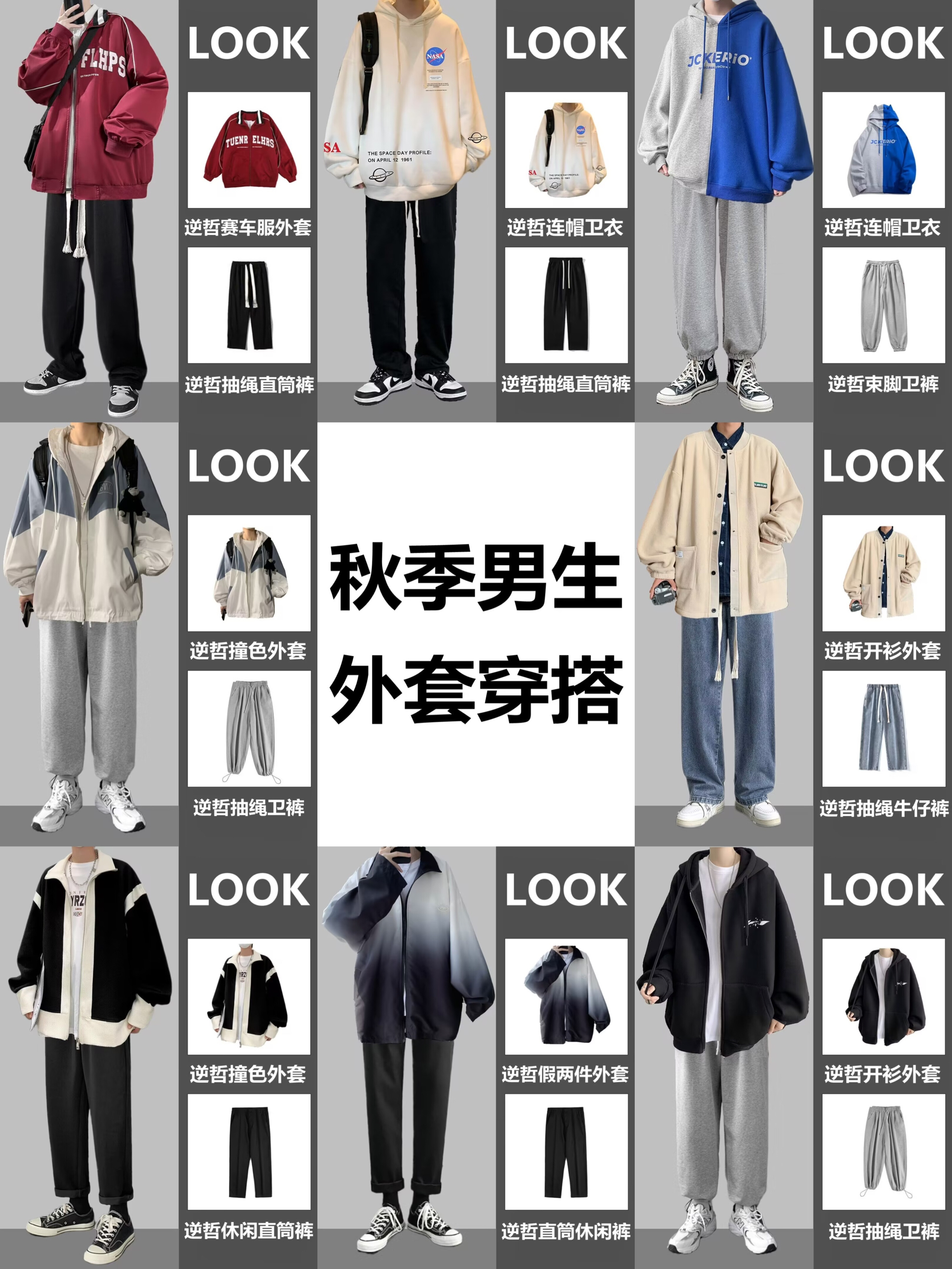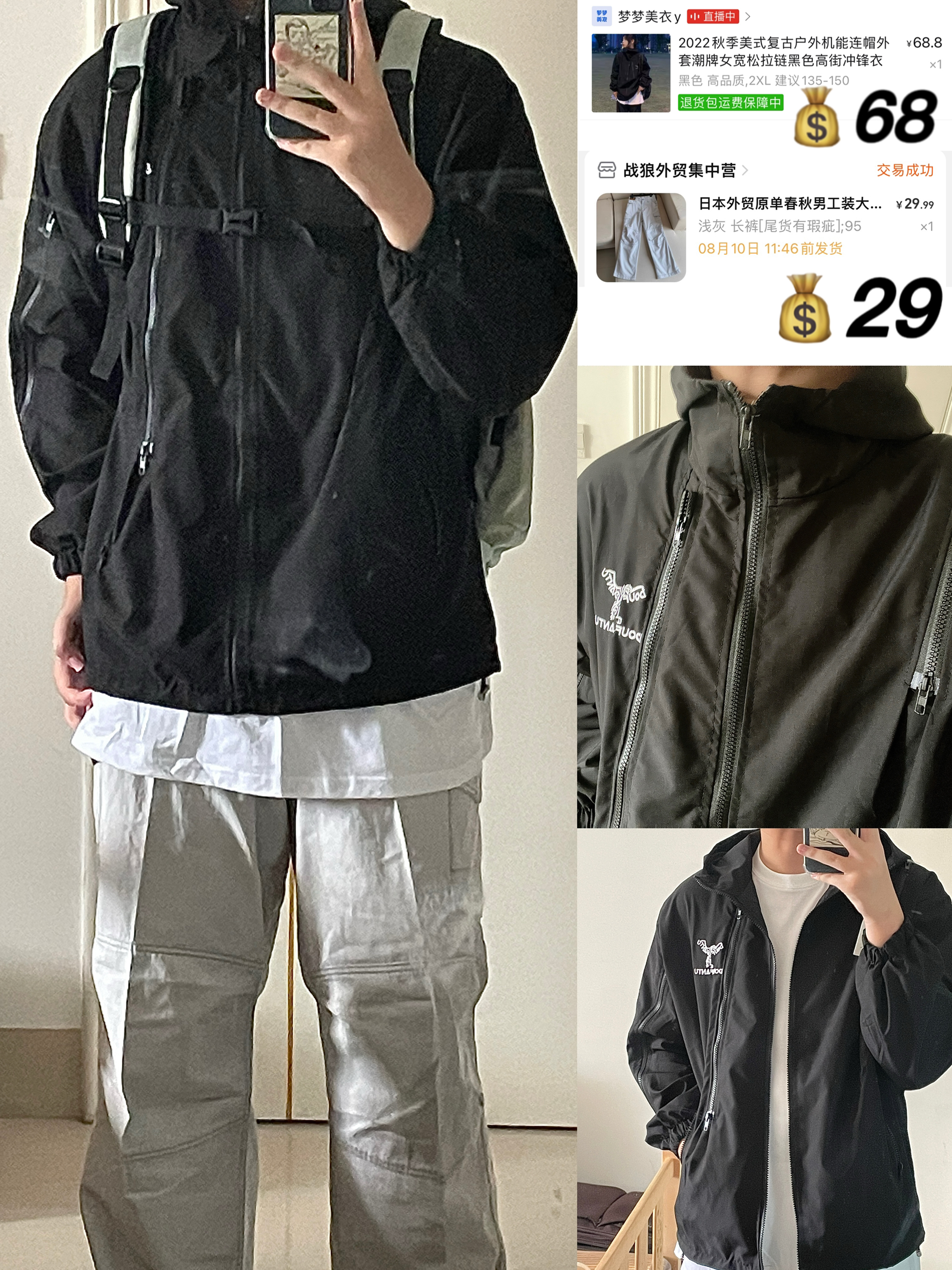 百变的你应该拥有这件连帽夹克 忍不住入假两件夹克,既有叠穿的层次感,又不会显得臃肿 经典的黑灰配色简洁大方 整体版型真的超级棒,细节和质感真的是值得点赞,后背印花太好看了,下半身搭配黑裤子,就好啦,!男女同款,也可情侣装哦!