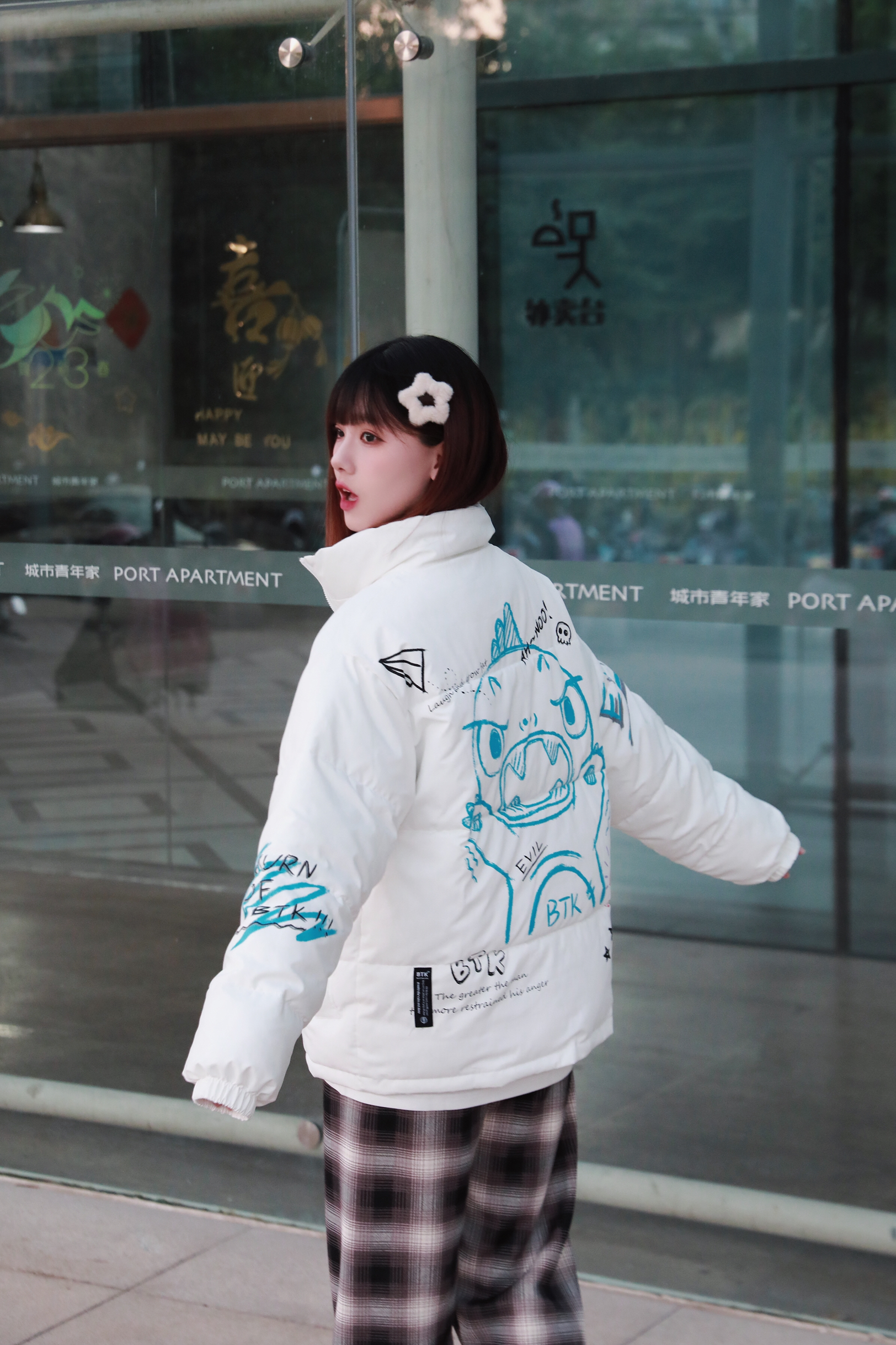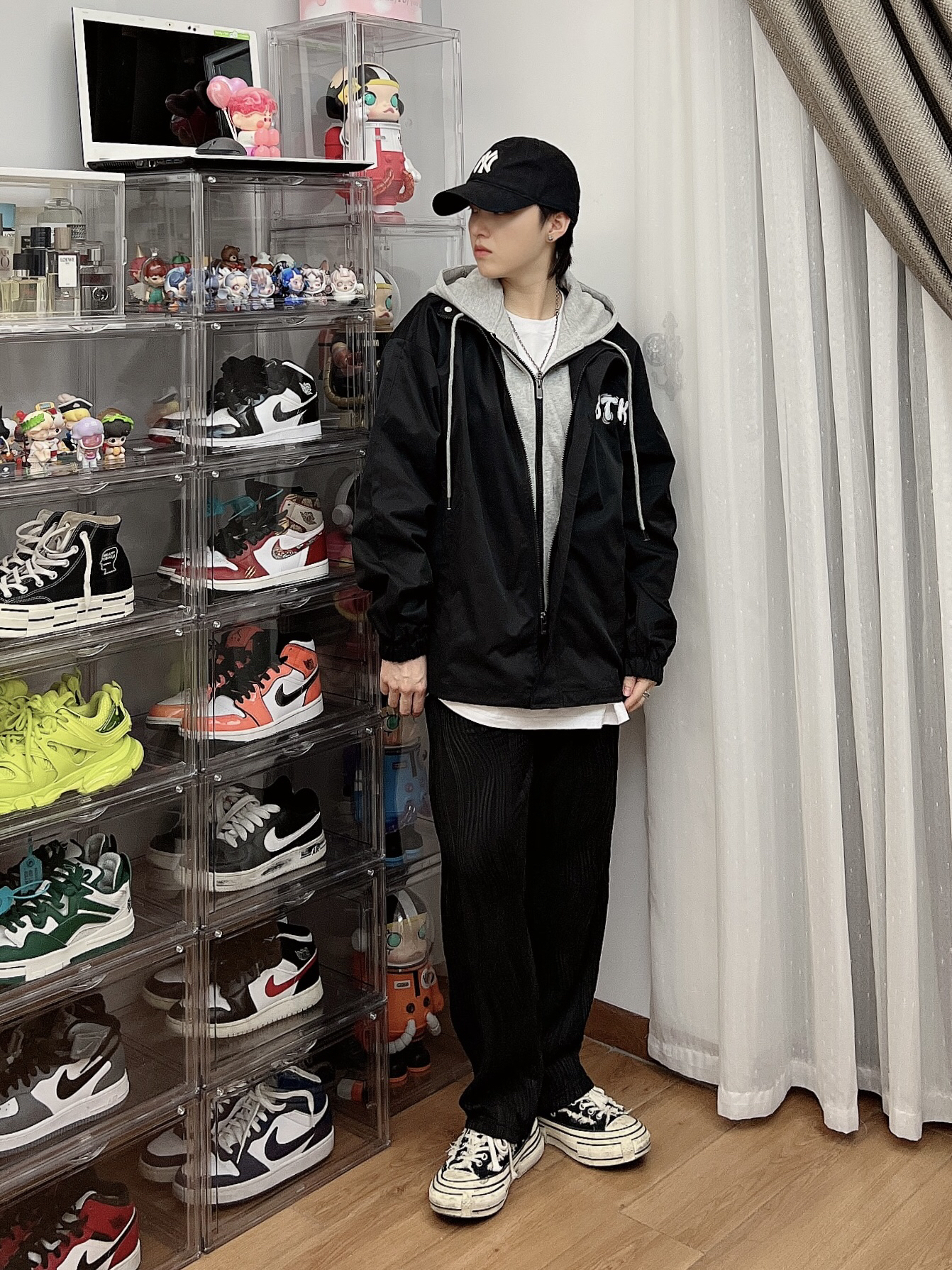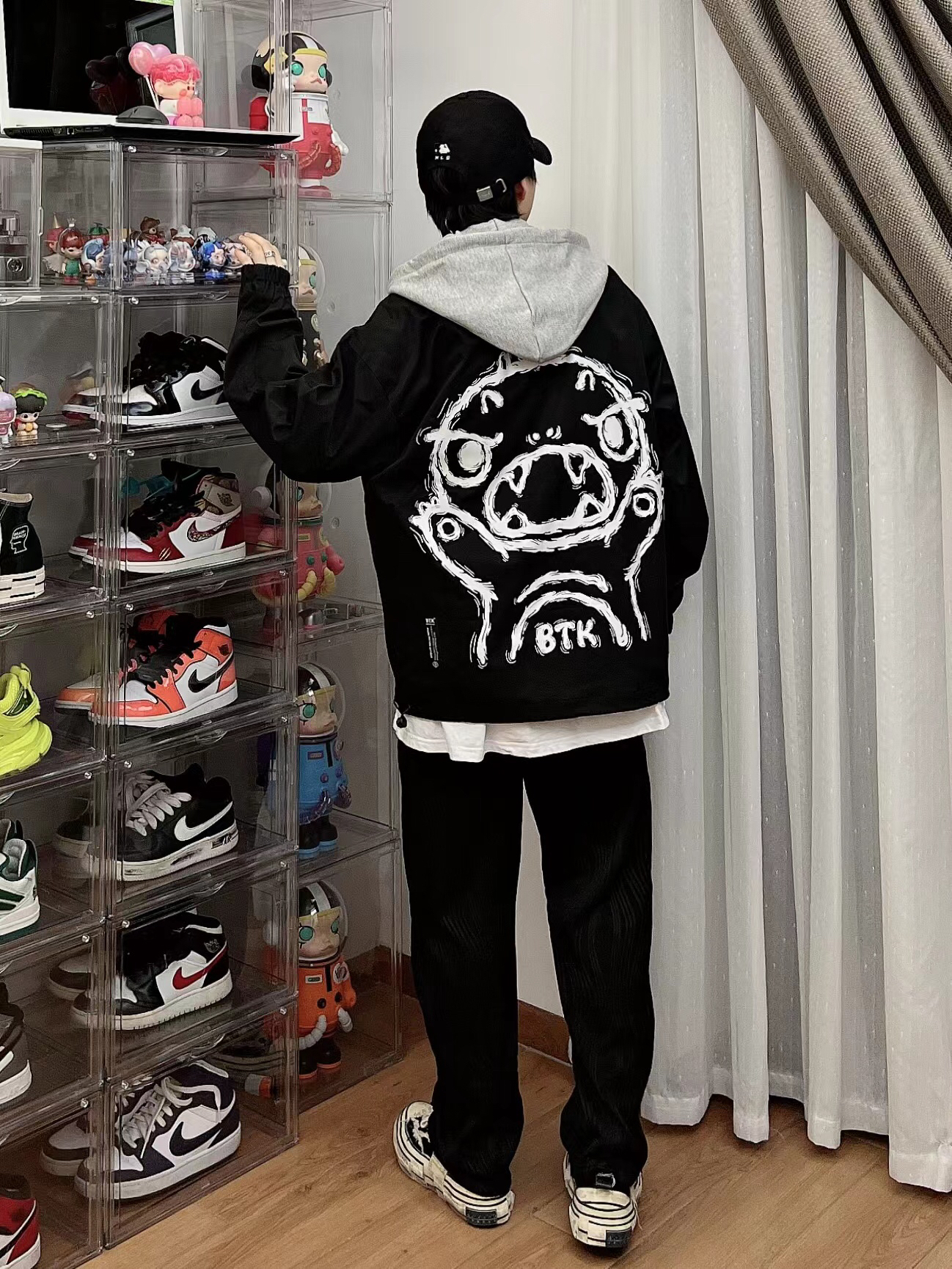 百变的你应该拥有这件连帽夹克 忍不住入假两件夹克,既有叠穿的层次感,又不会显得臃肿 经典的黑灰配色简洁大方 整体版型真的超级棒,细节和质感真的是值得点赞,后背印花太好看了,下半身搭配黑裤子,就好啦,!男女同款,也可情侣装哦!
