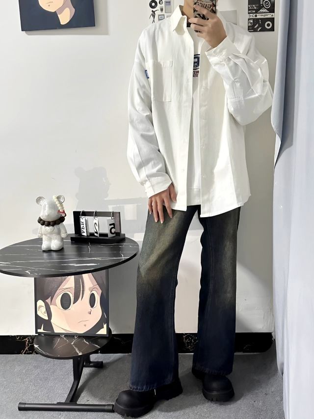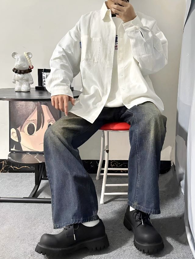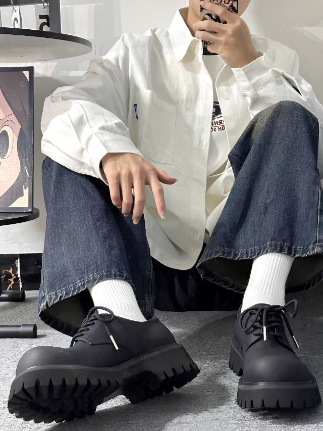 阳光少年范穿搭 白衬衫外套内搭白色卫衣+一条锈士色的牛仔裤子 穿搭一双德比鞋,纯黑的配色,小众高级,二层牛皮的鞋面质感很赞,微微对叠感很帅,大厚鞋底,上脚穿搭舒适,鞋子轻薄一点也不厚重的感觉,穿搭没有负重感,还有增高效果,通勤中性风 干净的校园男孩穿搭