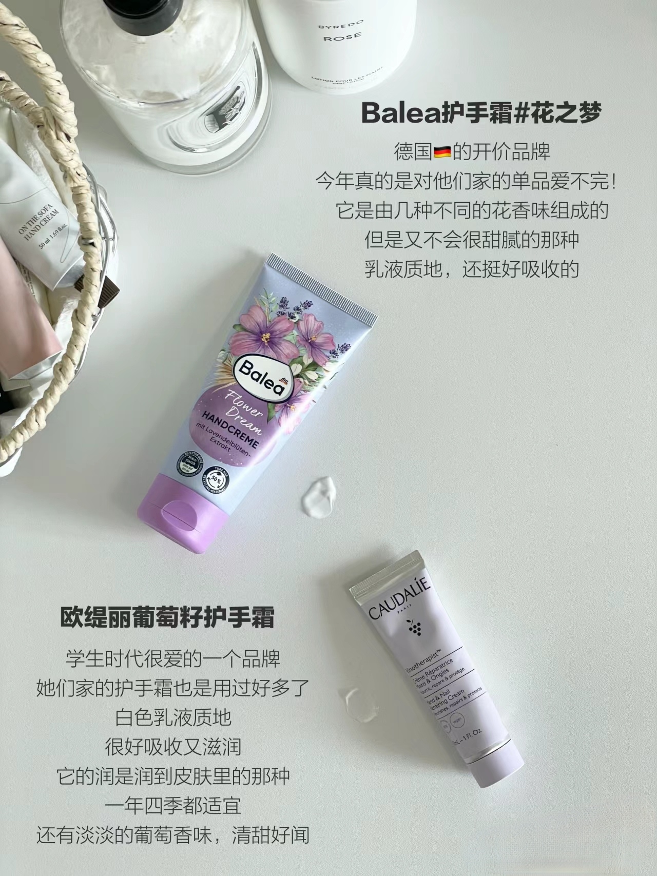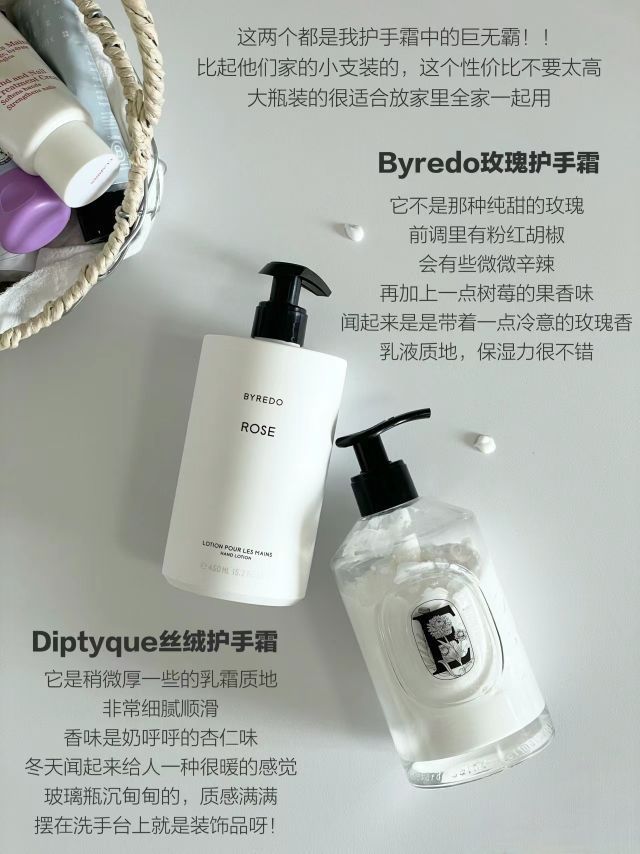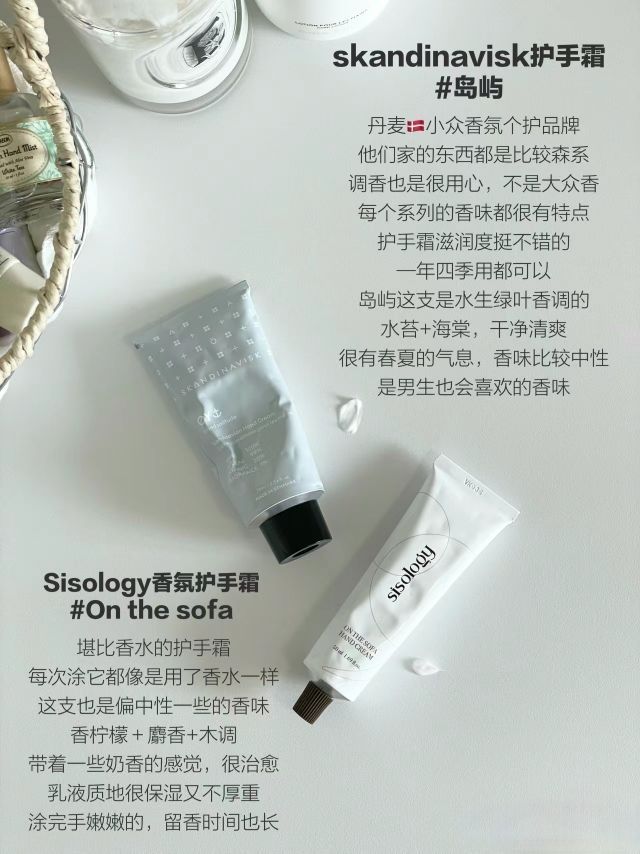 干手星人真的一年到头都离不开护手霜 这些都是最近经常在用的 滋润养护小手手的同时 还能拿捏住高级感伪体香呢 inn 护手霜 Byredo 玫瑰护手霜 Diptyque 丝绒护手霜 Sabon 护手霜#夏日出逃 Sabon 护手喷雾#白茶 Lelabo 护手霜#罗勒 LA Bruket 护手霜#接骨木花 skandinavisk 护手霜#岛屿、 Sisology 香氛护手霜# On the sof...