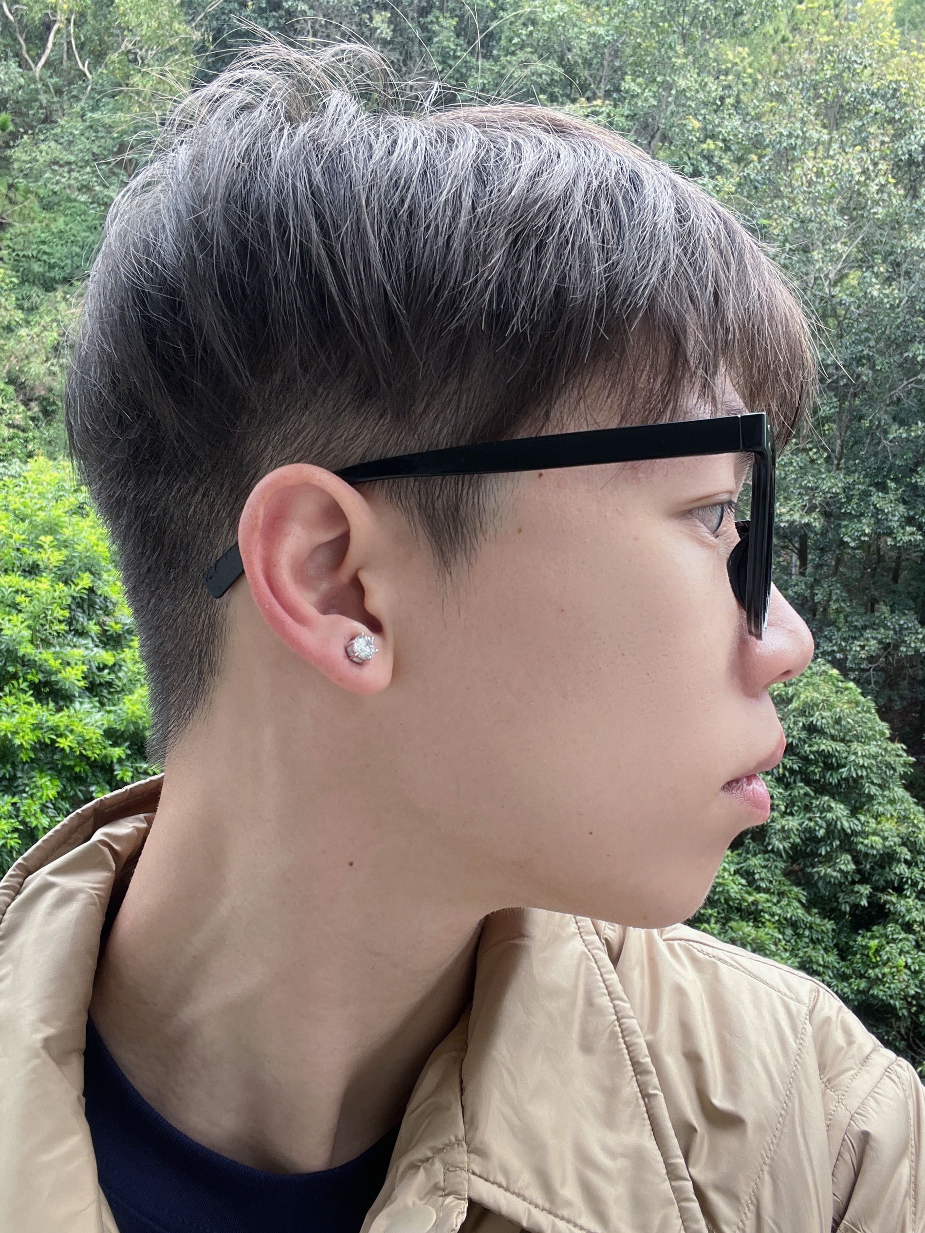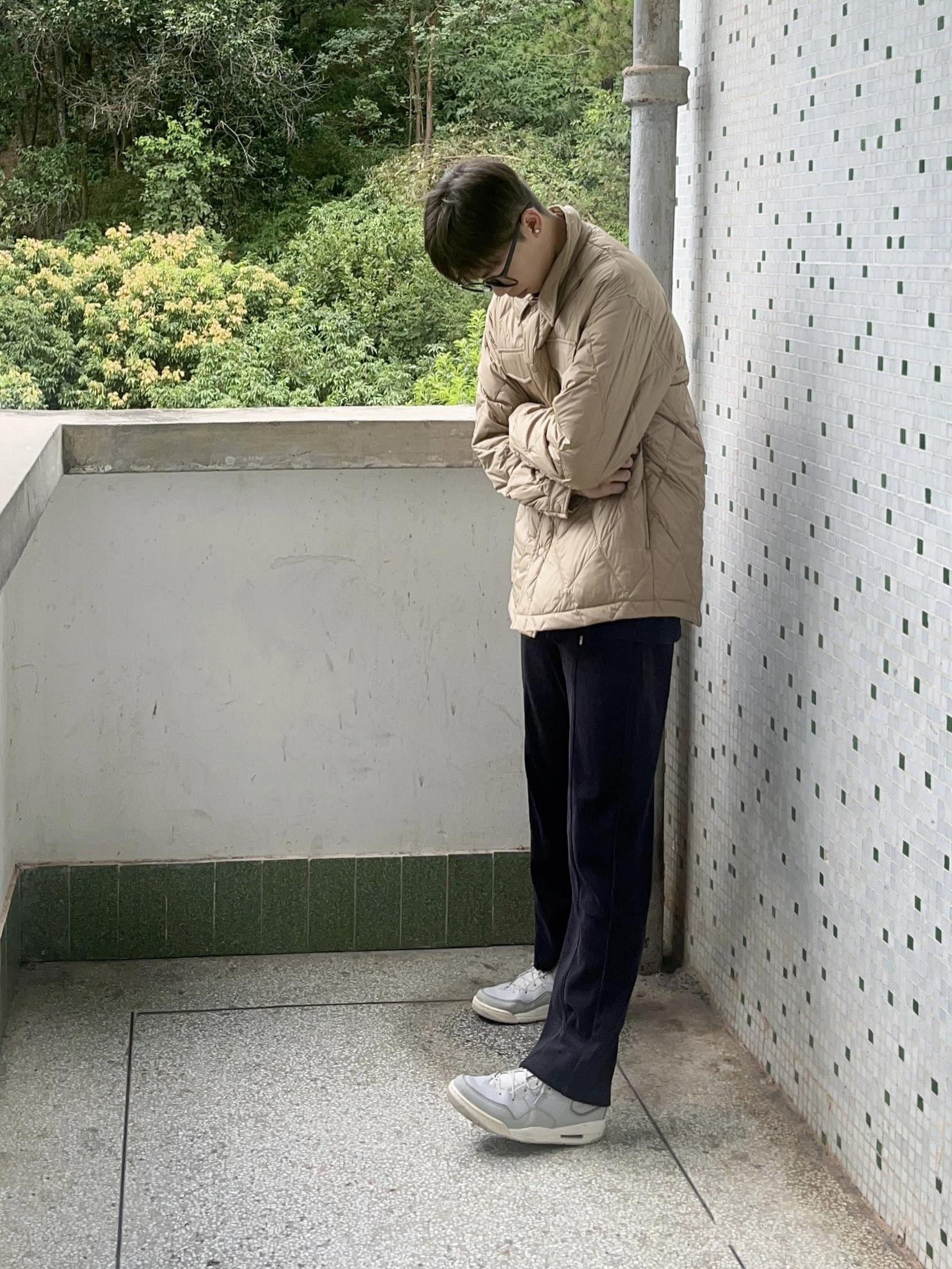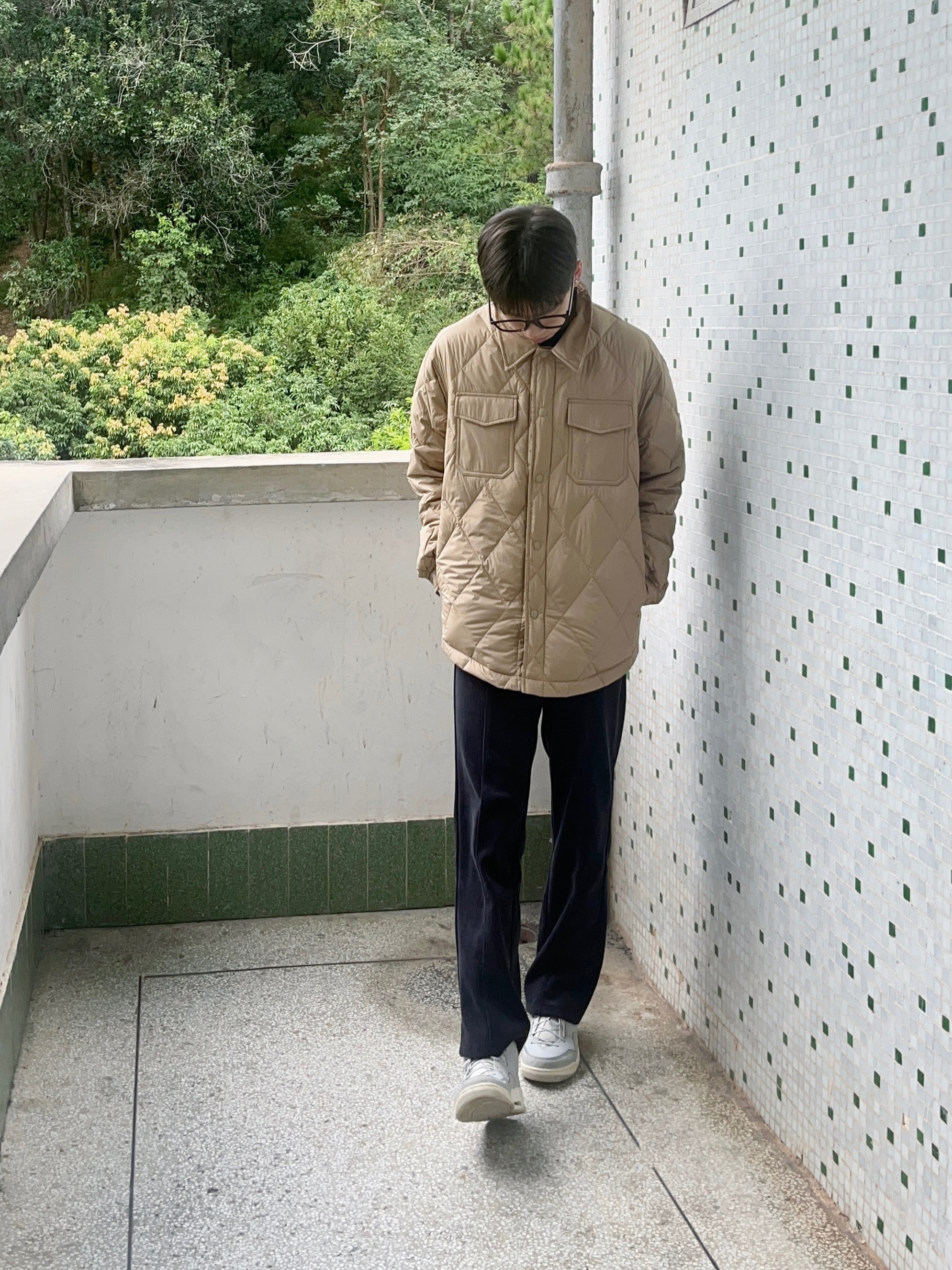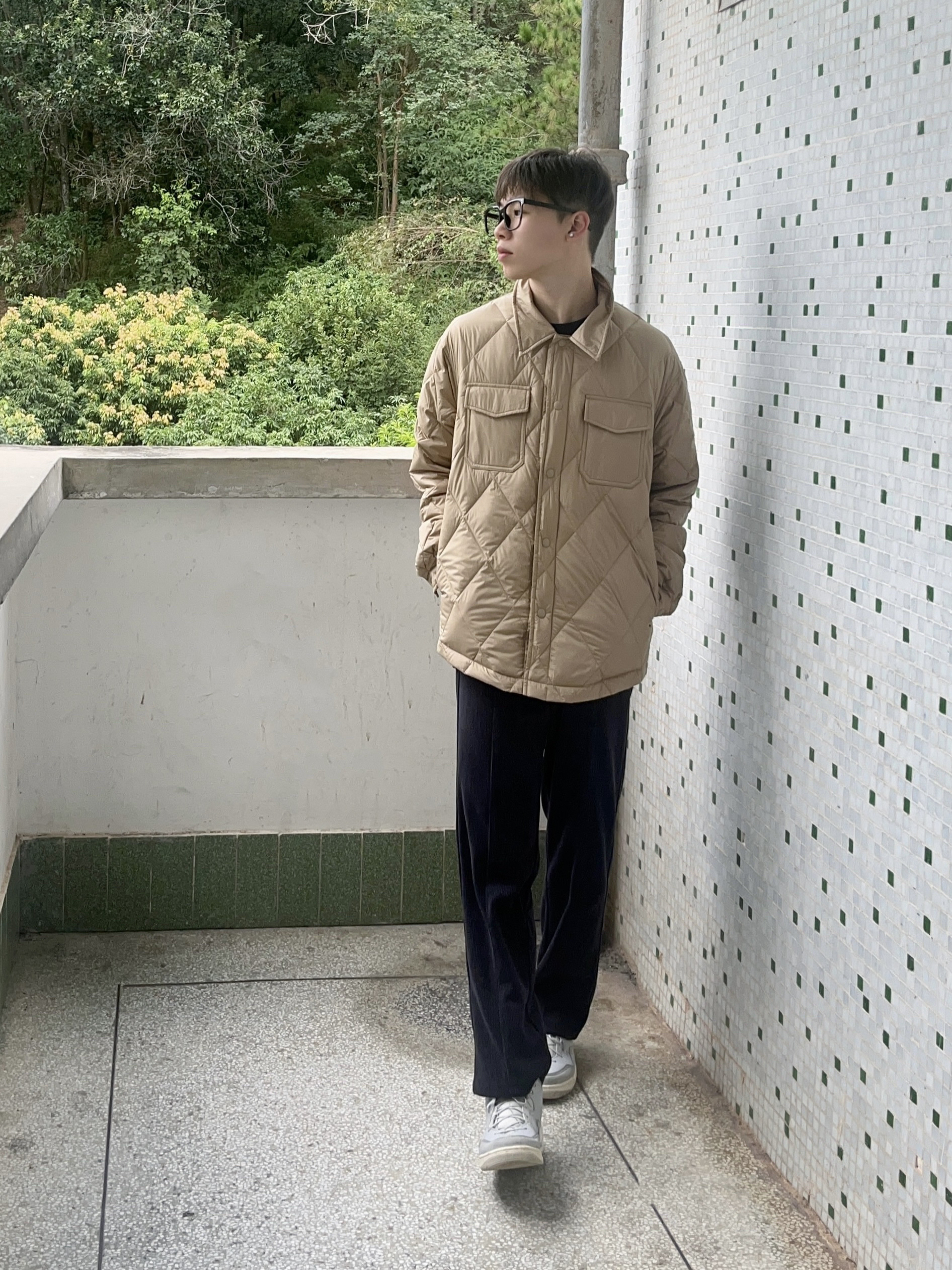 今天的穿搭简简单单 衣服是卡其色的薄款羽绒外套 落肩菱形设计简约时尚 山系风满满 裤子是深灰色的日系直筒裤 灯芯绒面料质感十足 显瘦显腿型一绝 再戴上 iGT 家的莫桑石磁吸款耳钉点缀 上脚一双灰色百搭板鞋 真的很难不爱
