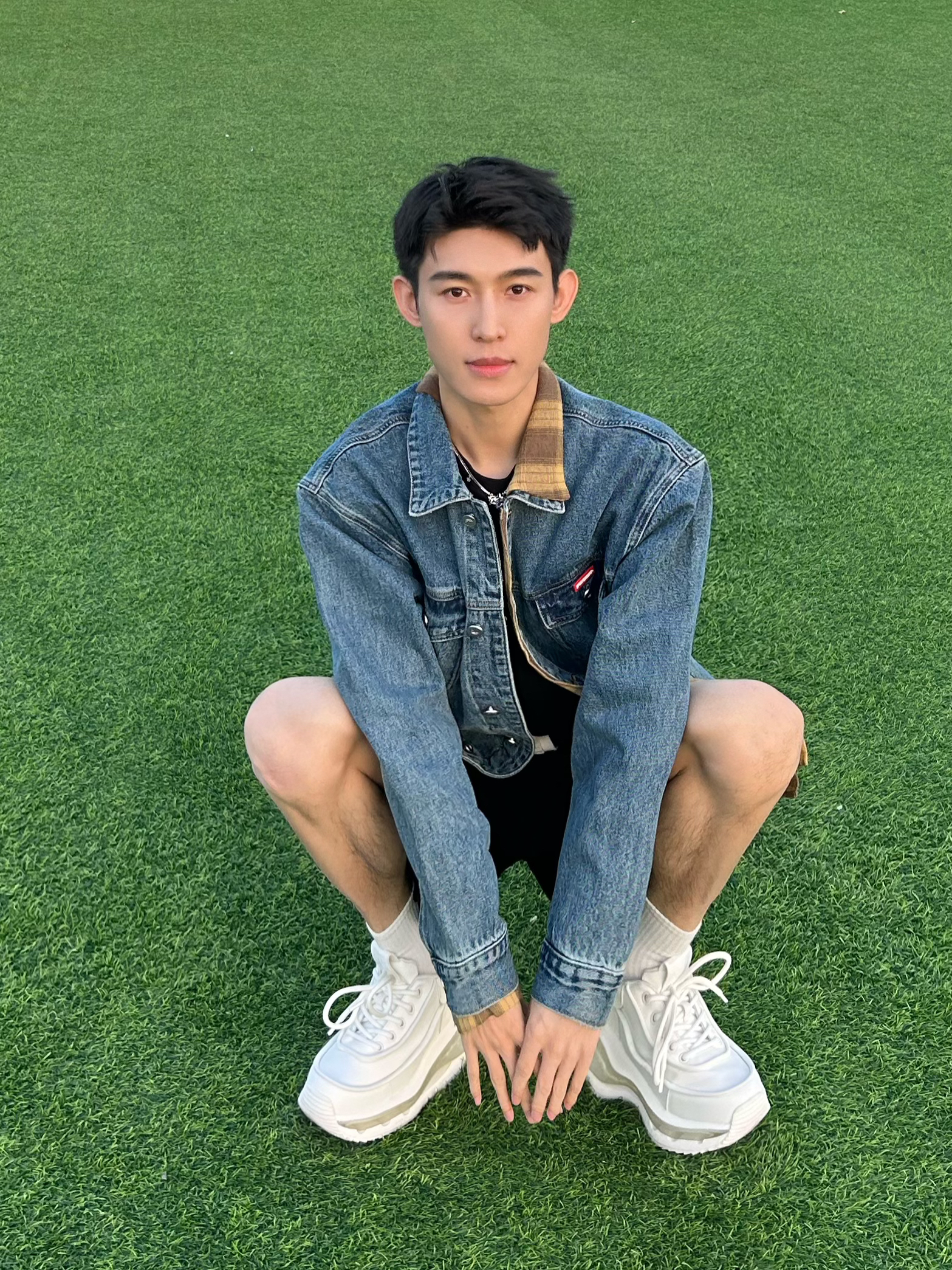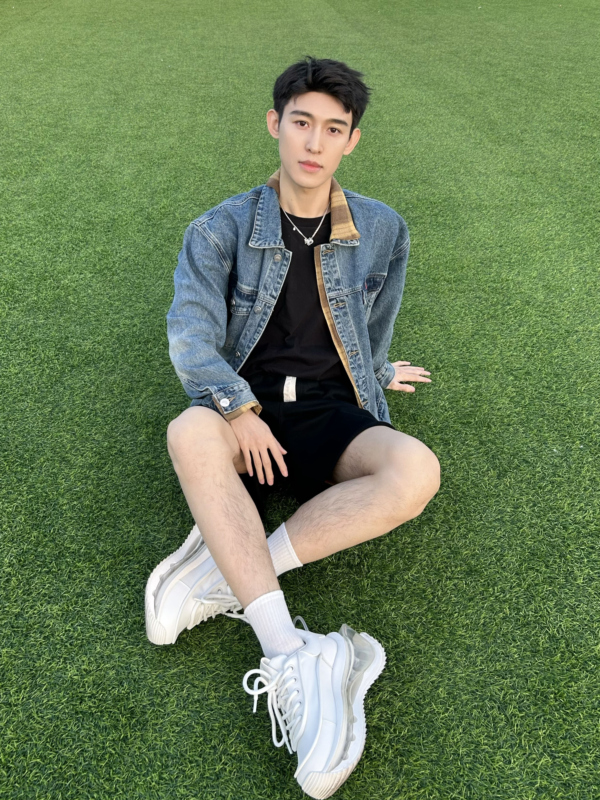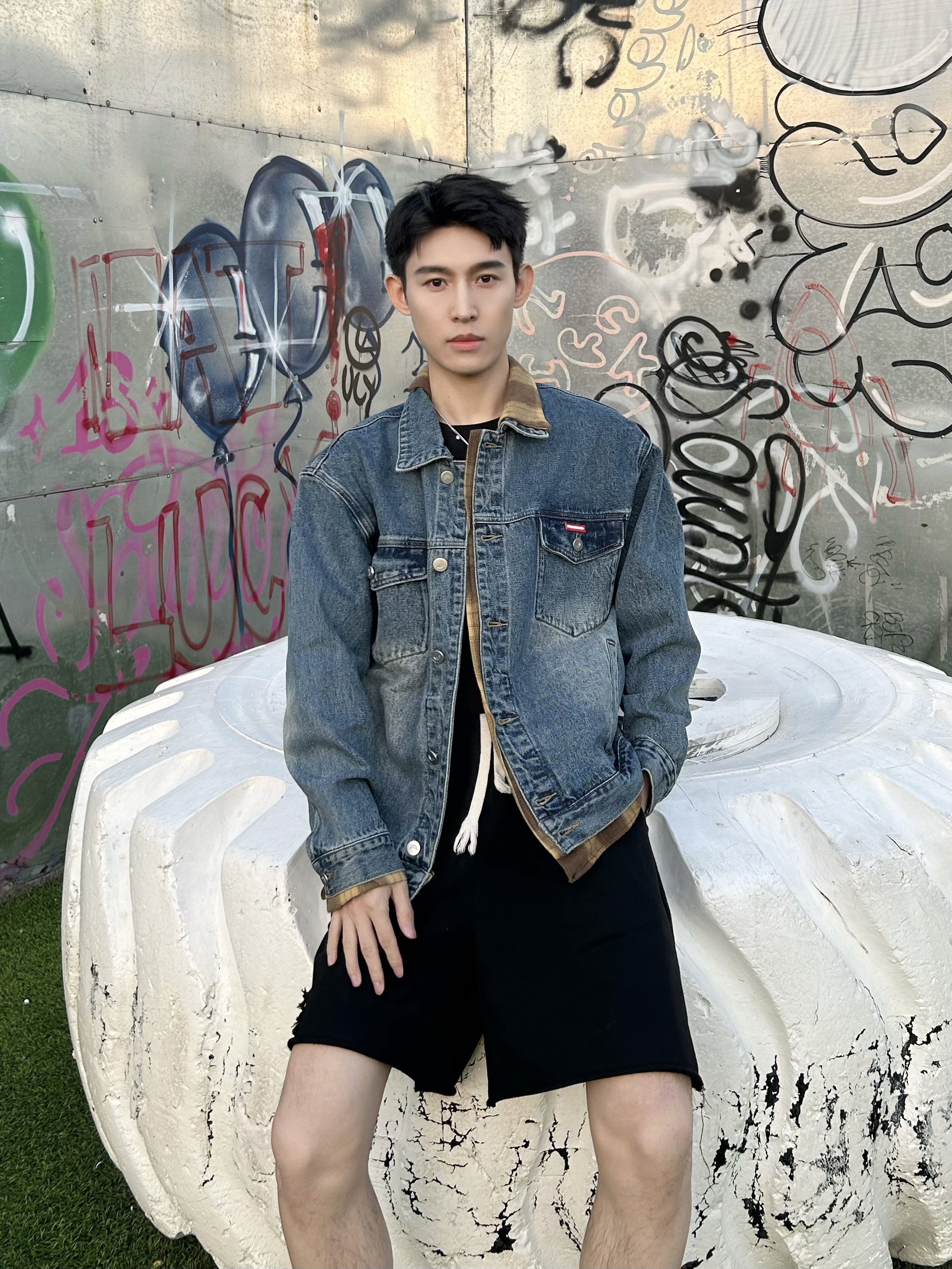 今日是185男大学生出行拍照📷 西点记忆就在高碑店 不过交通不是很方便 但是景点拍照真的好好看 今日穿搭假两件复古牛仔外套 搭配纯色宽松短裤🩳 白袜搭配厚底小白鞋👟 整个人有少年感也有时尚感