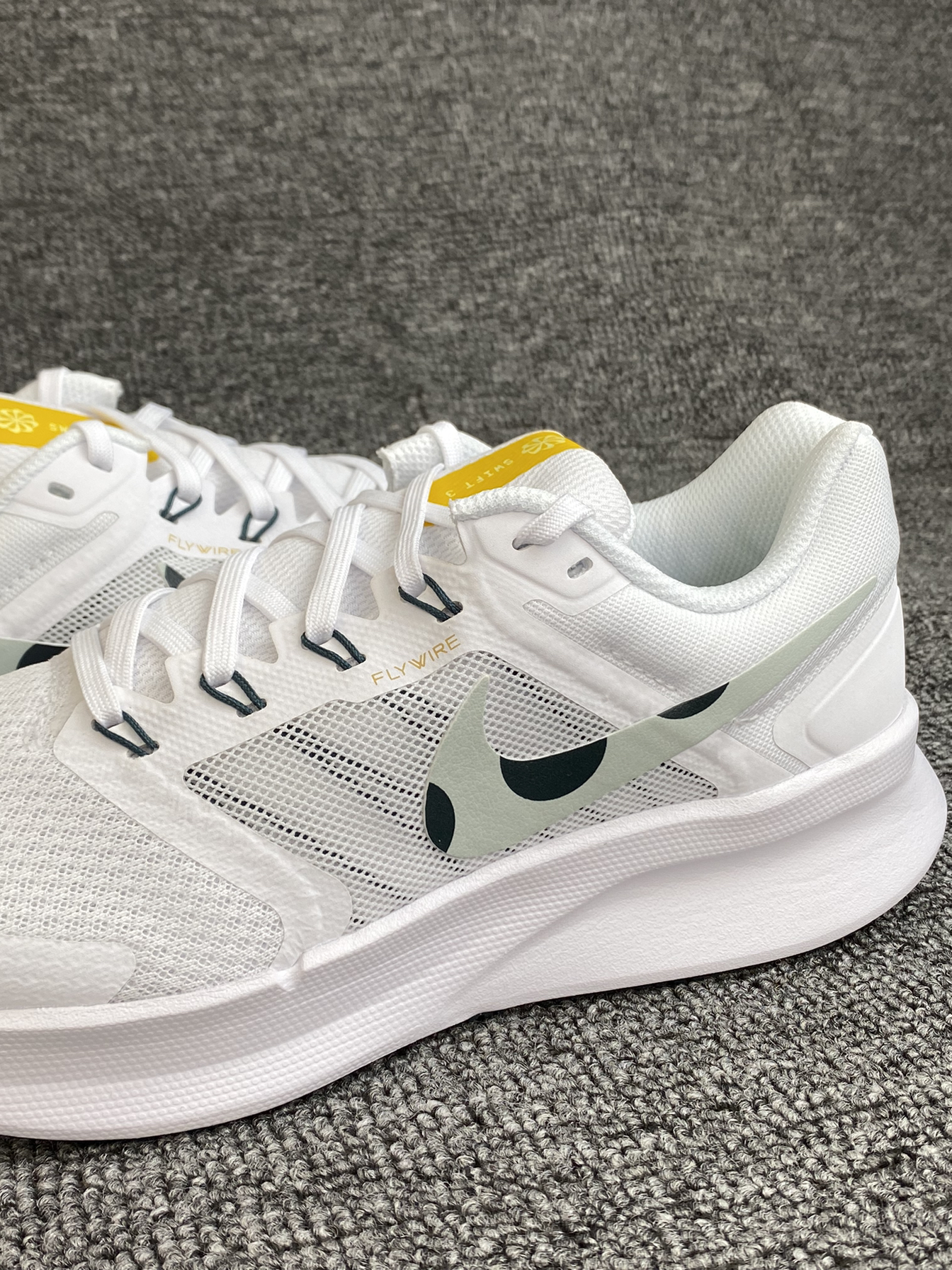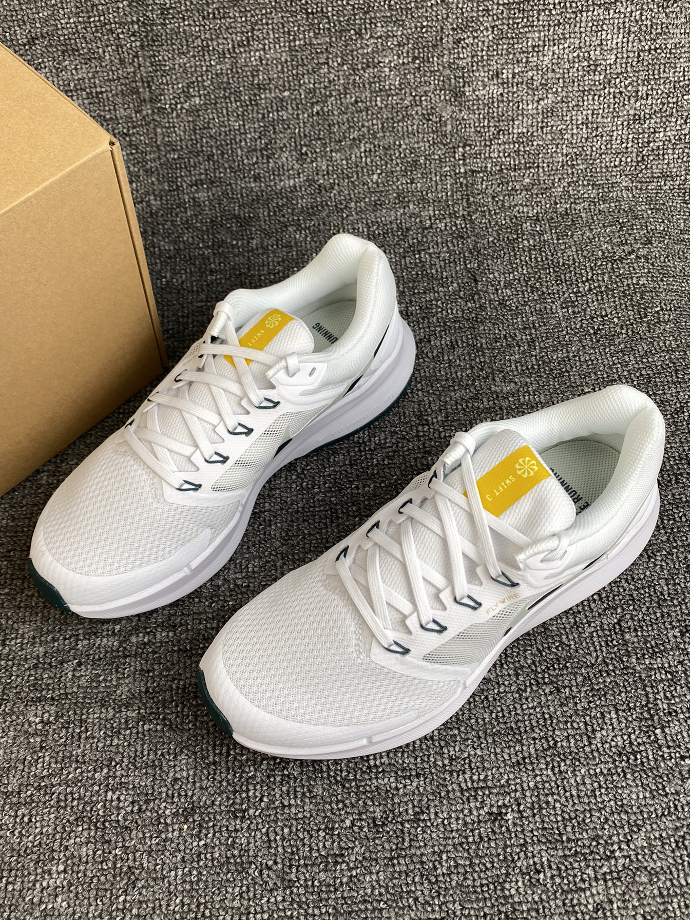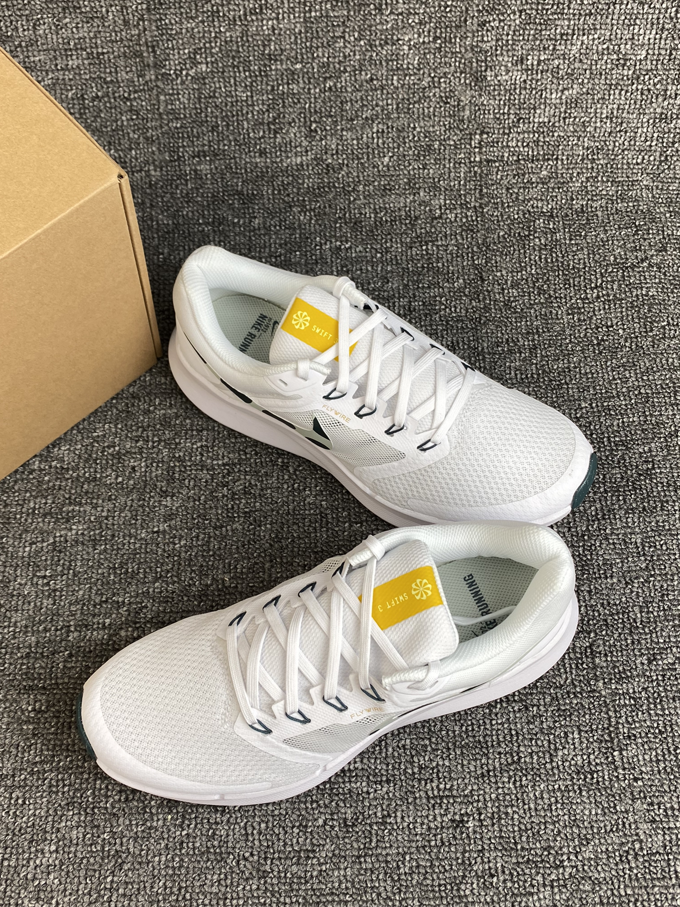 分享一下Nike的Run Swift 3 跑鞋 鞋子整体是很经典的白色,百搭且清爽 鞋侧的Swoosh为绿色点缀 加上鞋舌处的亮黄色,很有活力😆 鞋面是织物材质,透气性不错 就算在夏天穿着也没有压力 中底的泡棉材质带来了很好的回弹缓震感 上脚很舒适,缓震感也能感受到👍 尺码方面按平常穿的选择就好啦~没有偏码