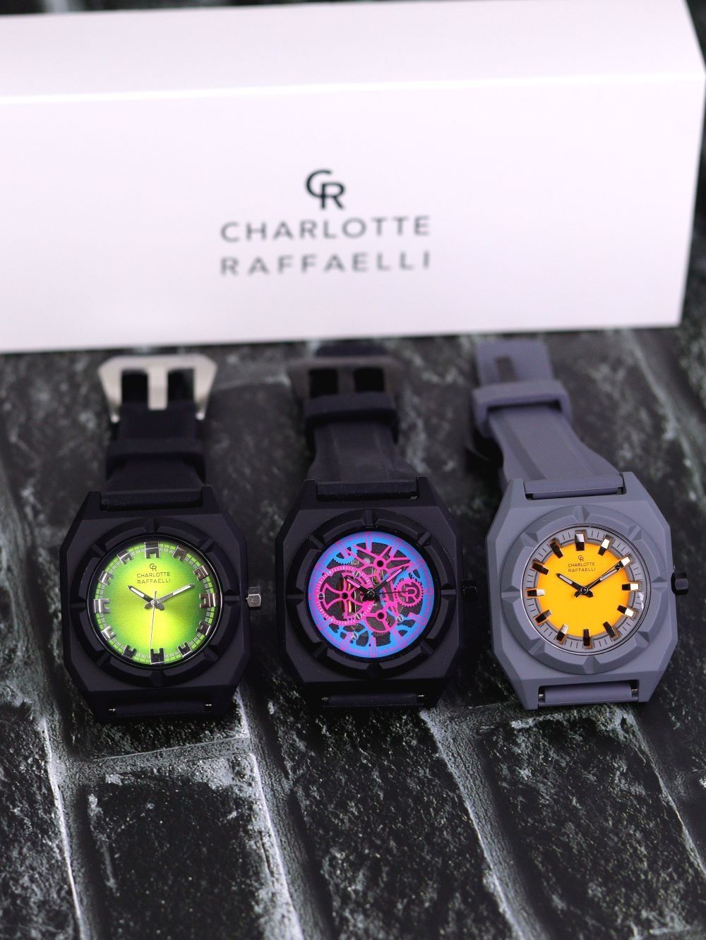 多巴胺色你觉得你更适合哪个颜色? 我个人喜欢手表的颜色是鲜艳一点的 所以今天也给大家看看夏洛特.拉斐利家的手表 三个颜色紫、绿、橙 也是我平时出场率挺高的手表 我喜欢的地方 一个是配色、一个是硅胶表带平时戴也很舒服不出汗 最后一个是真的轻快一点都不重 三色已经到位!