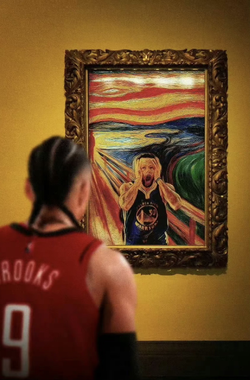 今日勇士vs火箭的比赛中,斯蒂芬·库里在两次晃过狄龙·布鲁克斯后命中三分,随后的庆祝动作😆 《呐喊》库里版哈哈哈😆😜 世界名画创作者:库里