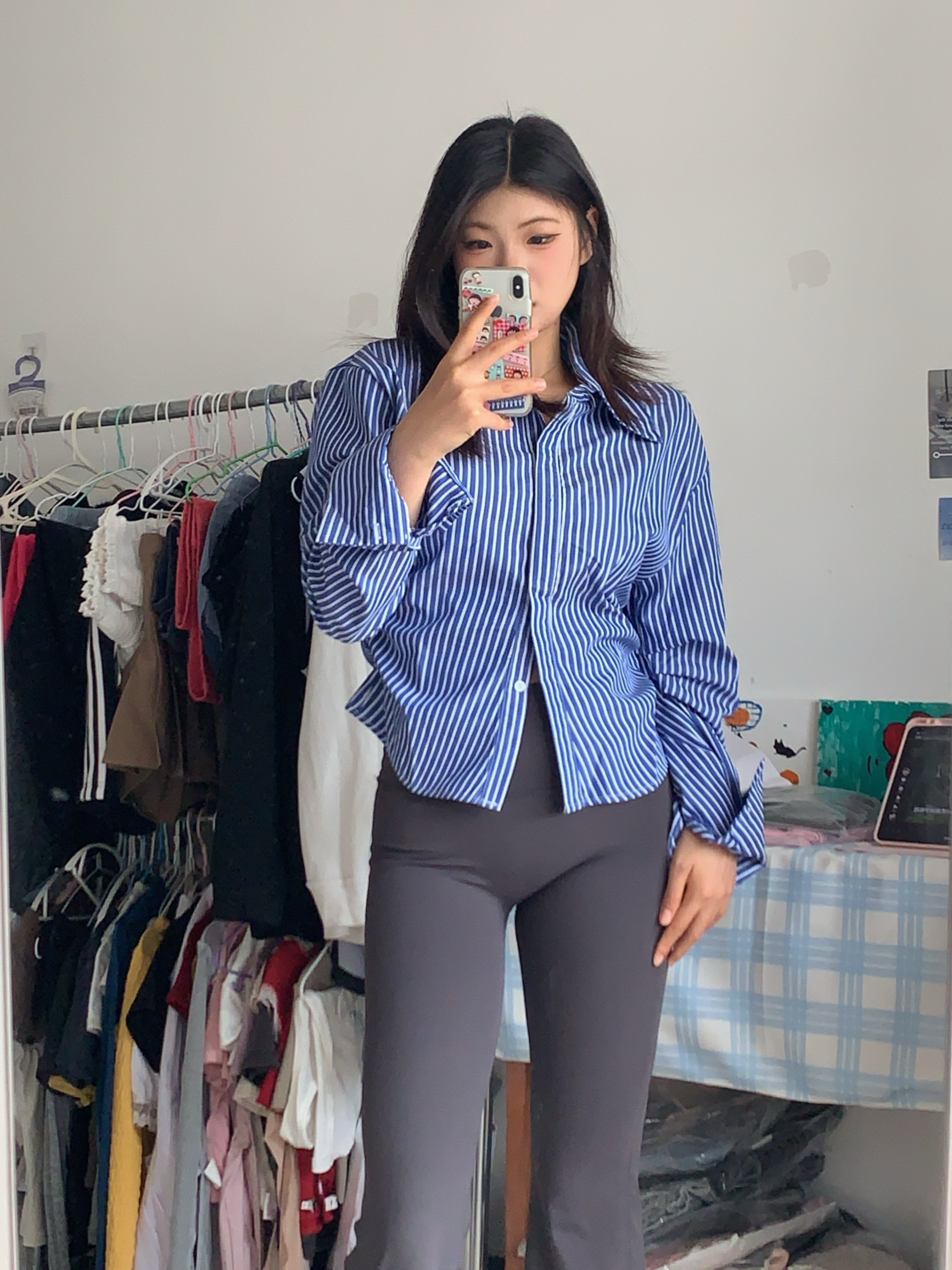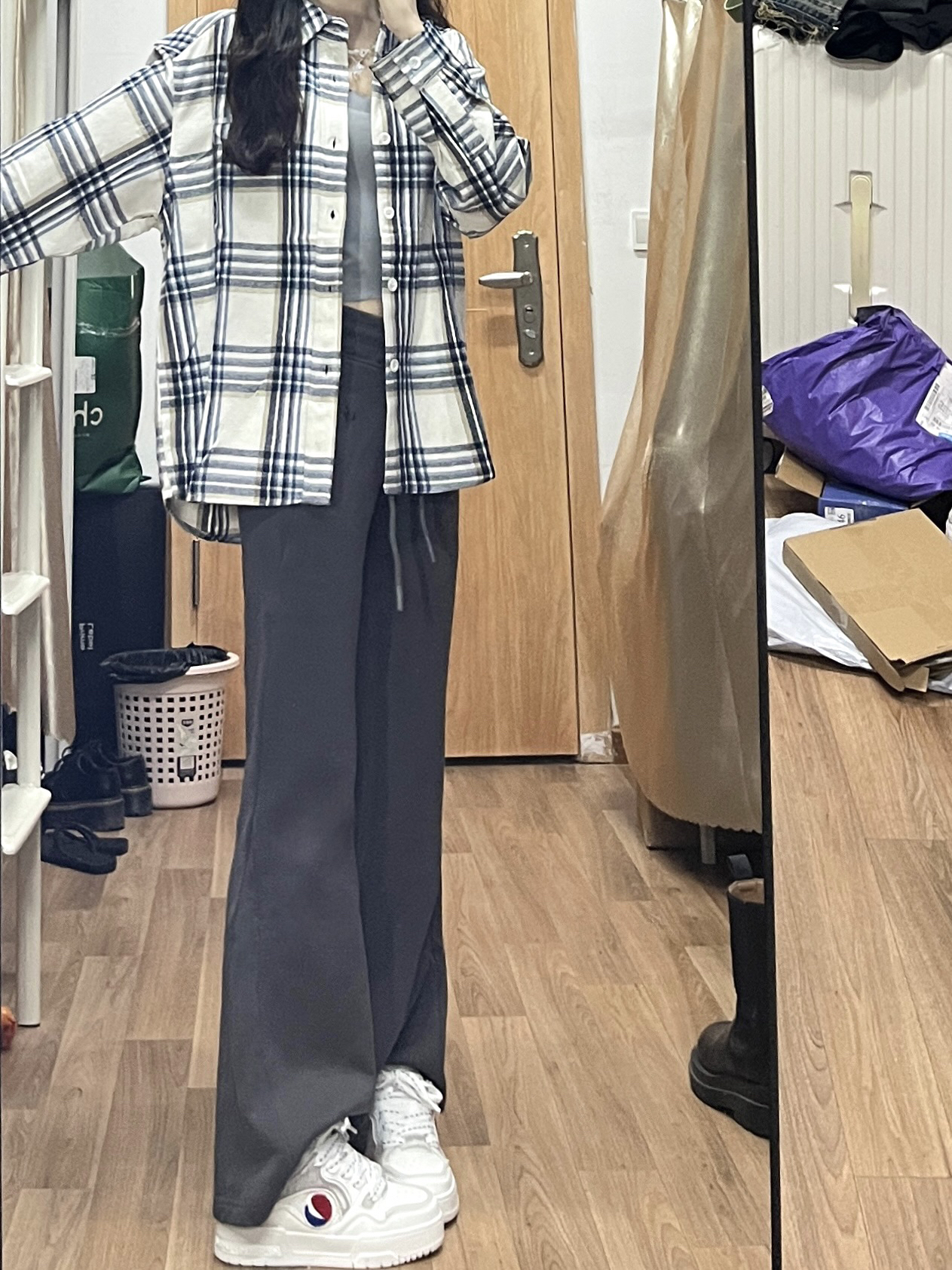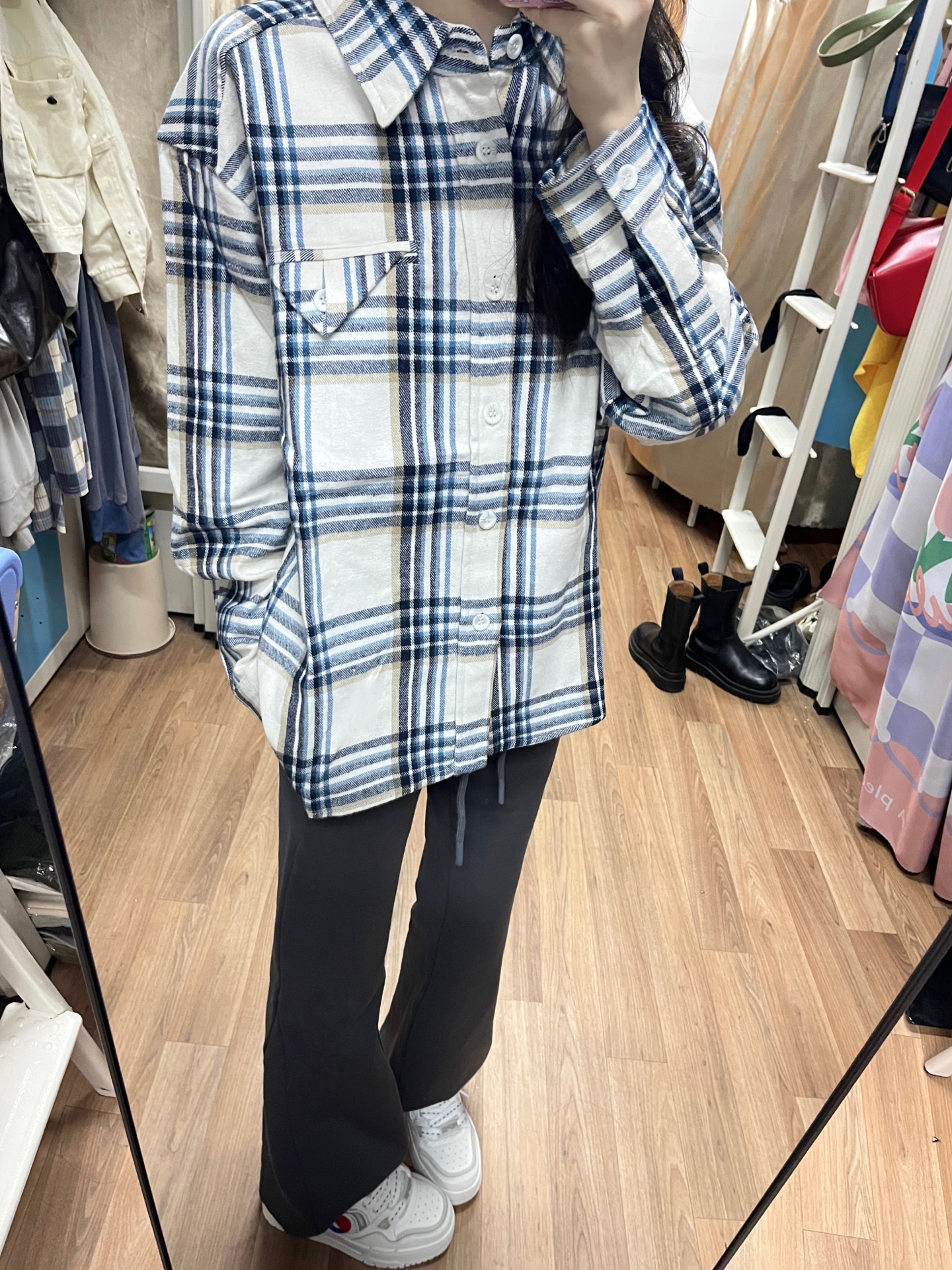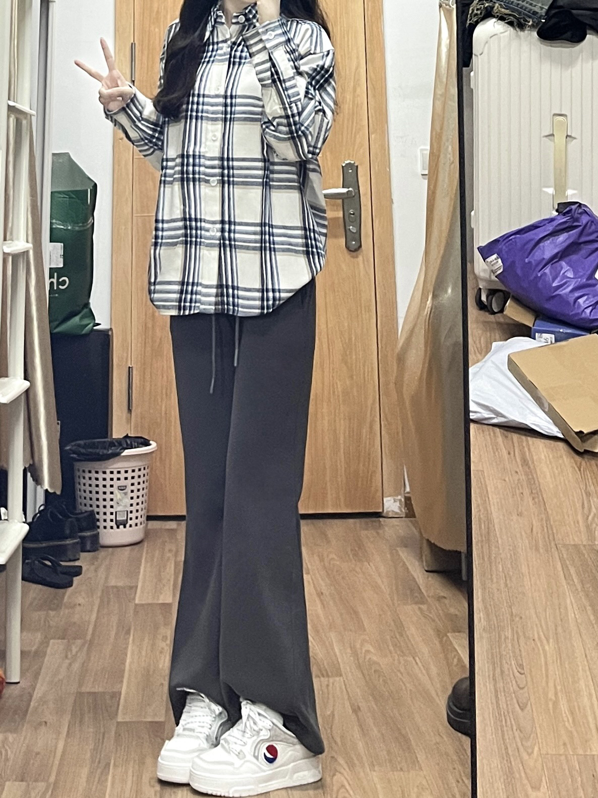 ootd|初秋衬衫➕微喇裤也太好看噜!! 又到了可以穿衬衫的季节了! 蓝白配色显得人很有活力哦 档内搭or外穿都很好看 是那种比较厚实的质感 版型很正! 搭配微喇卫裤真的很好看 鞋鞋是百事的板鞋 白色板鞋➕百事小logo好百搭好看 增高效果对小个子很友好哦 舒适感满分穿着一点都不累脚 #学生党双十一囤货攻略 #初秋衬衫穿搭 #开始期待秋天的穿搭了 #早秋衬衫式外套分享 #双十一什么值得囤