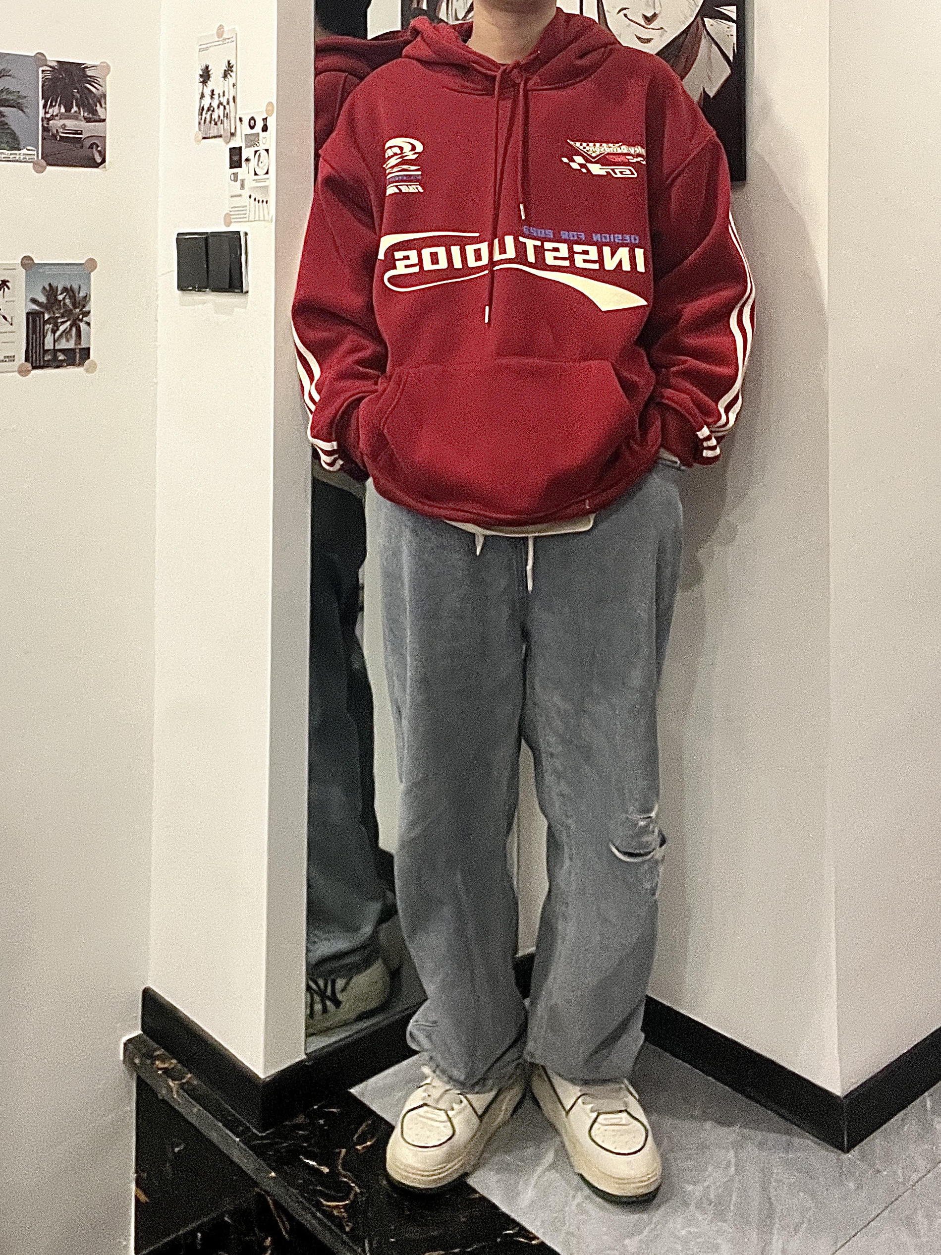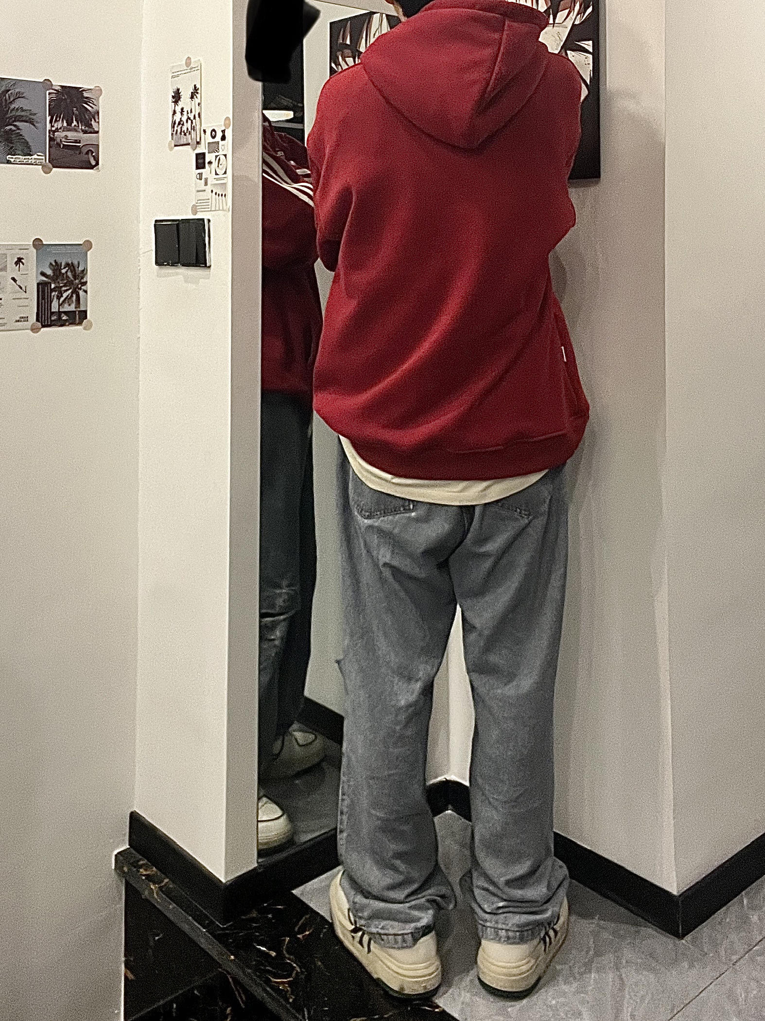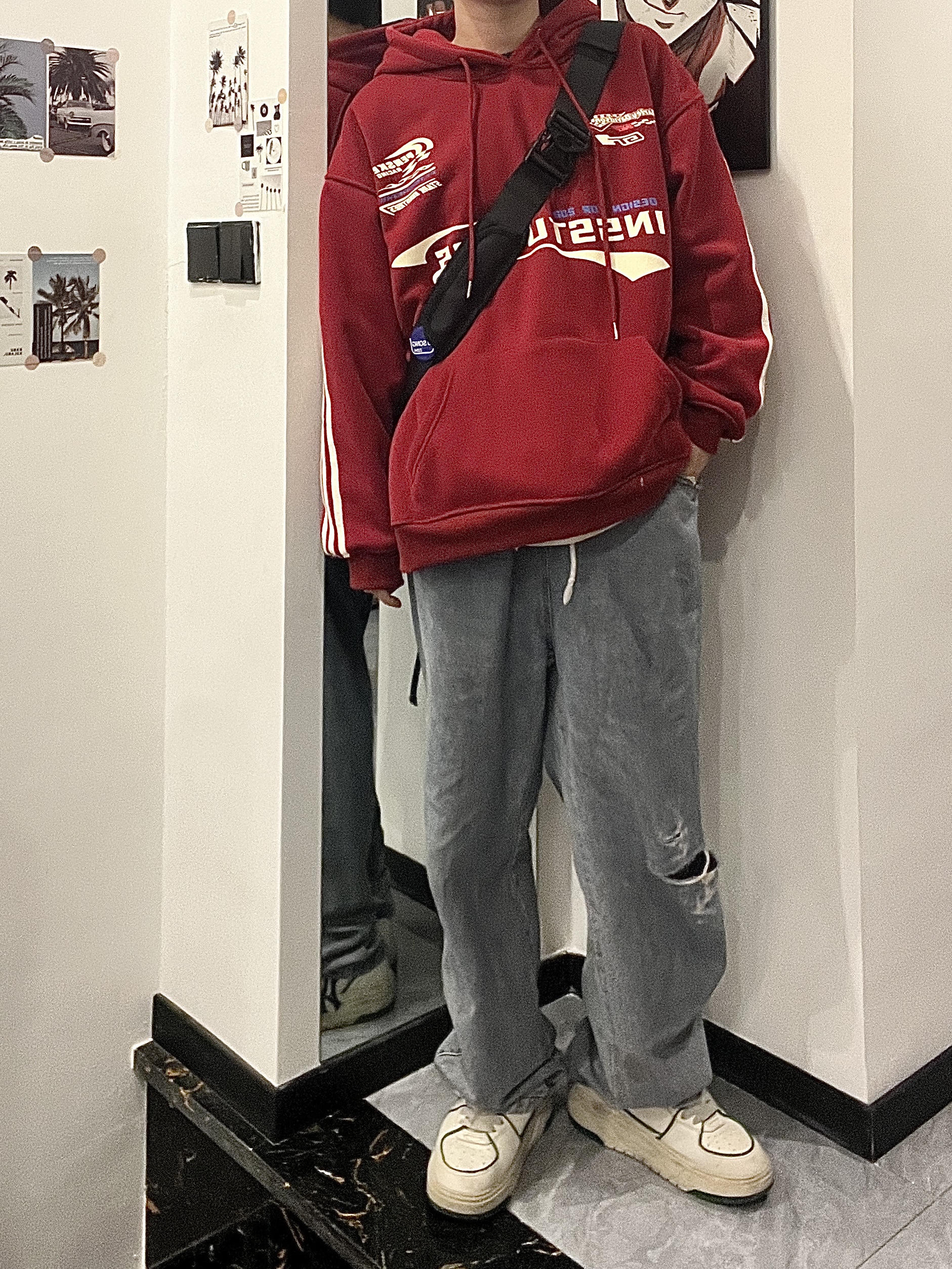偶尔尝试美式大红卫衣➕白色板鞋➕破洞牛仔裤 拍照真的好看! 很适合矮个子男生,喜欢的兄弟可以冲啦!