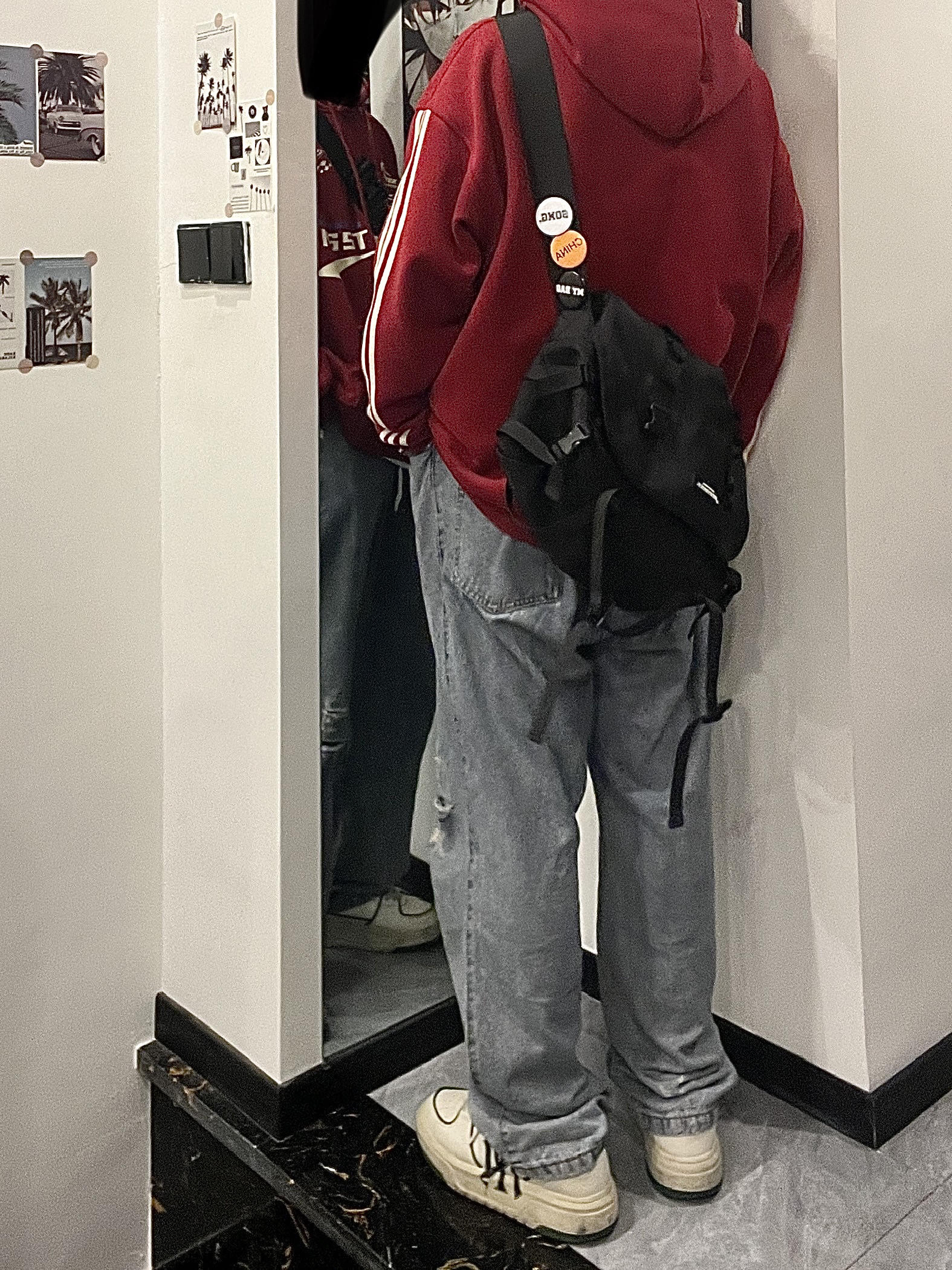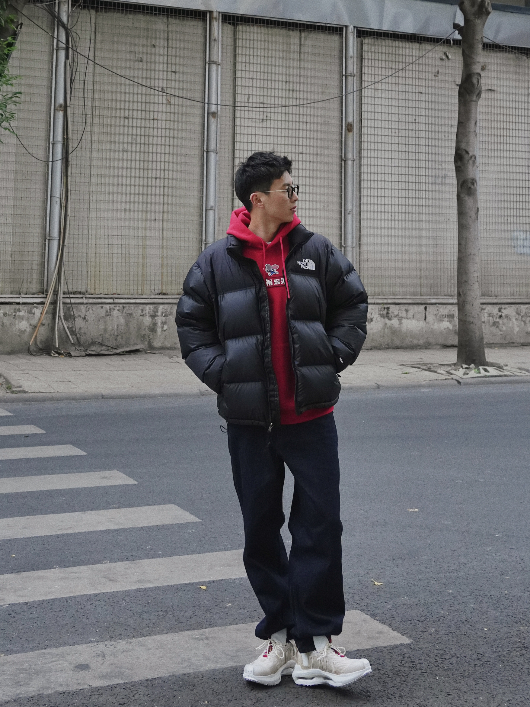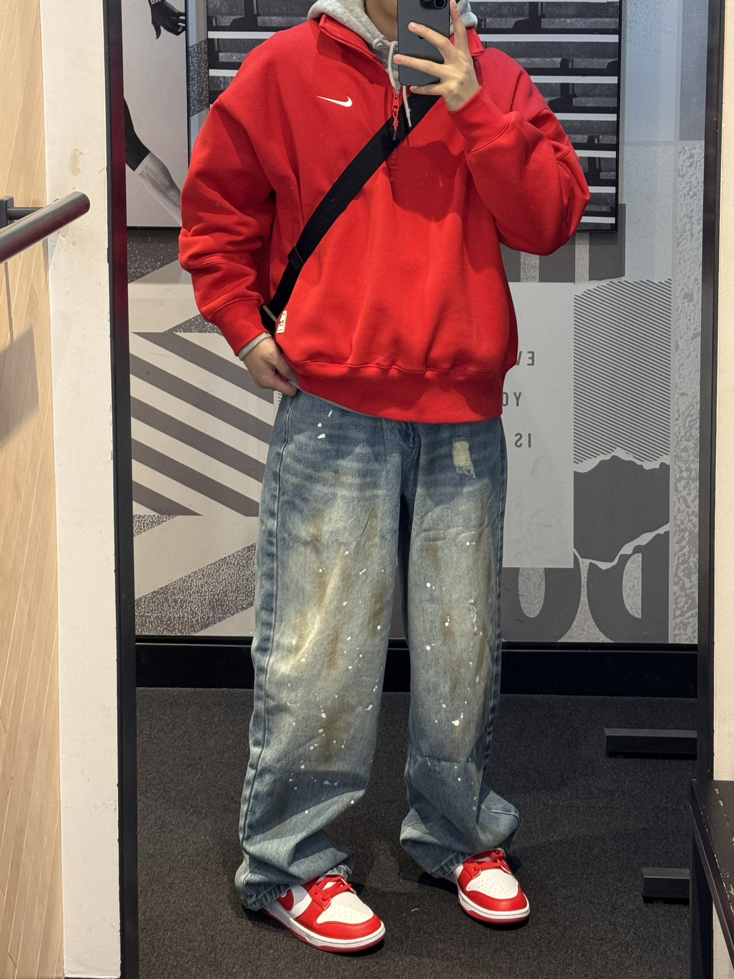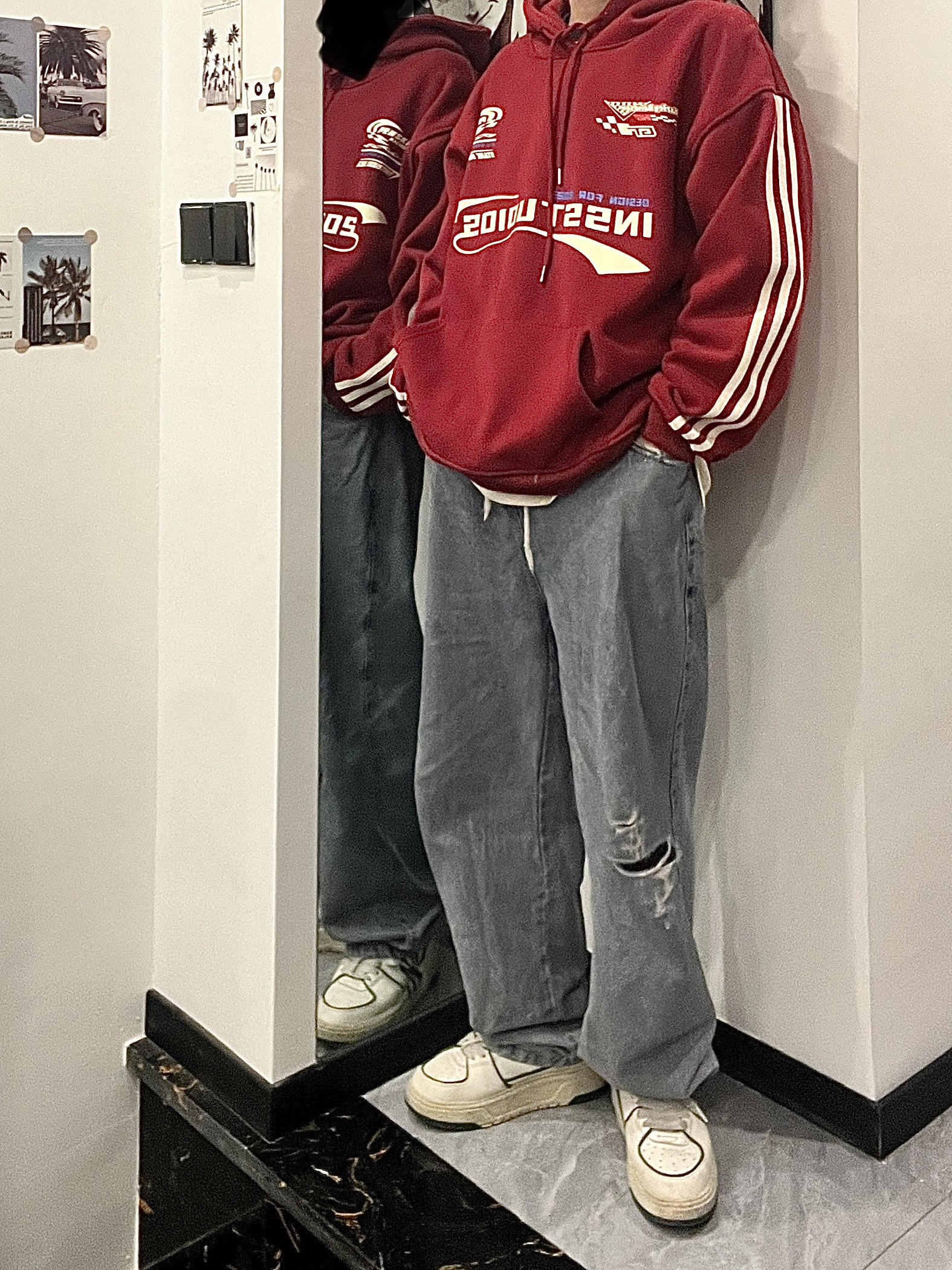 偶尔尝试美式大红卫衣➕白色板鞋➕破洞牛仔裤 拍照真的好看! 很适合矮个子男生,喜欢的兄弟可以冲啦!