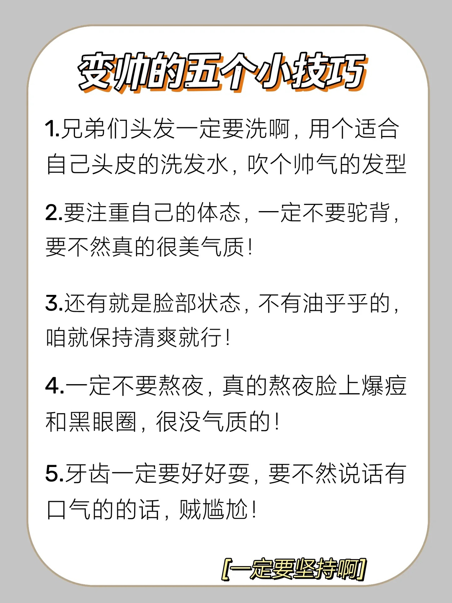 这么神奇只要坚持就能变帅?我倒要看看|||男生变帅岂不是手拿把掐的,我整理了一份关于男孩变帅的五个小技巧,希望能帮到大家!😄 ✨ 头发要清爽,不要顶着大油头 ✨ 体态一定要重视起来,不要驼背 ✨ 学习如何穿搭 ✨ 脸上要清爽,不要油乎乎的 ✨ 还有就是口腔管理,好好刷牙