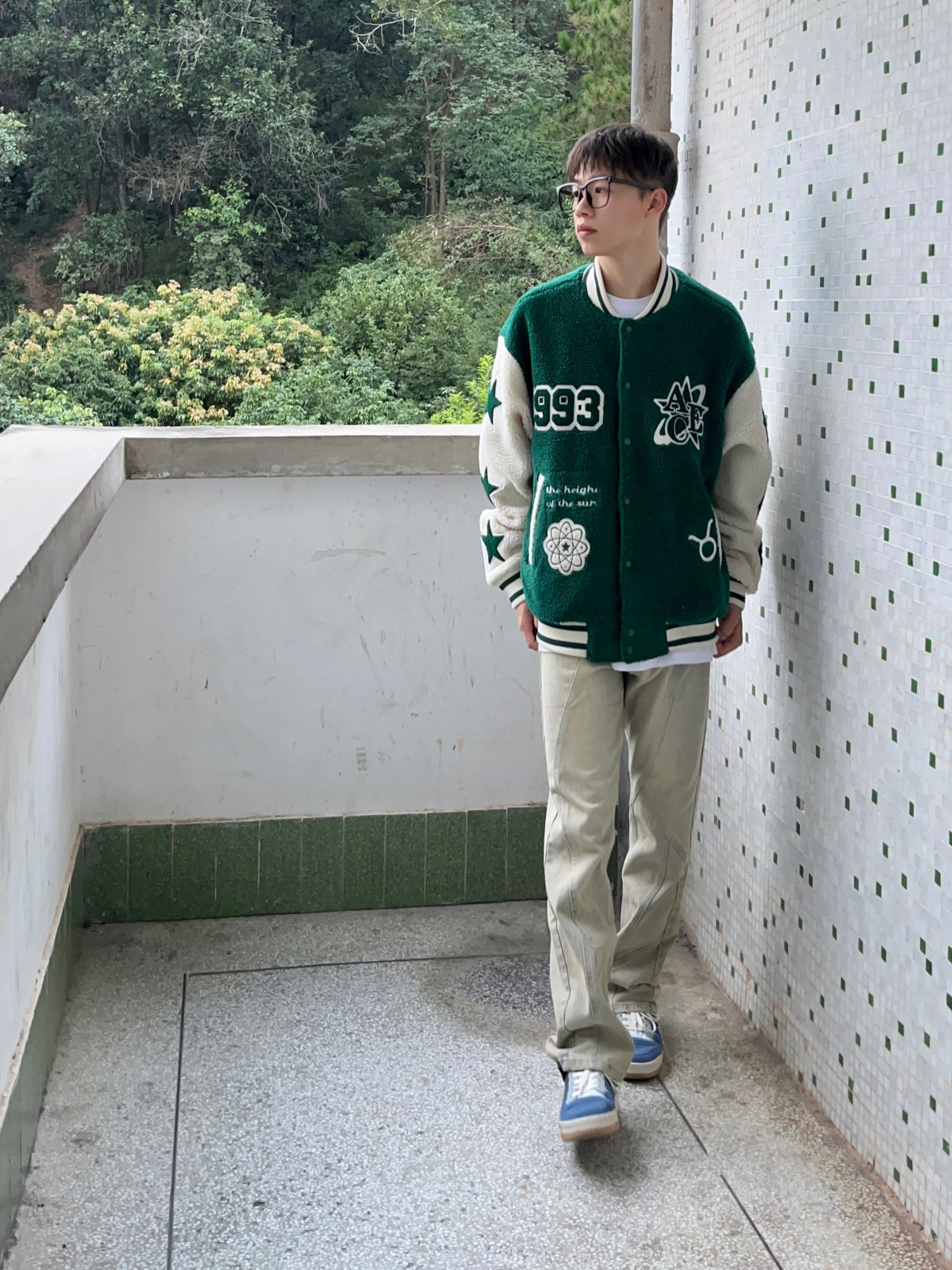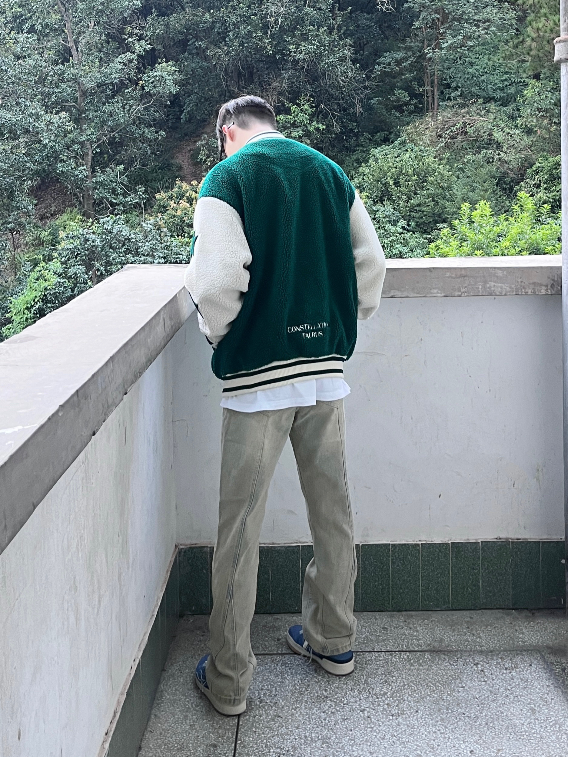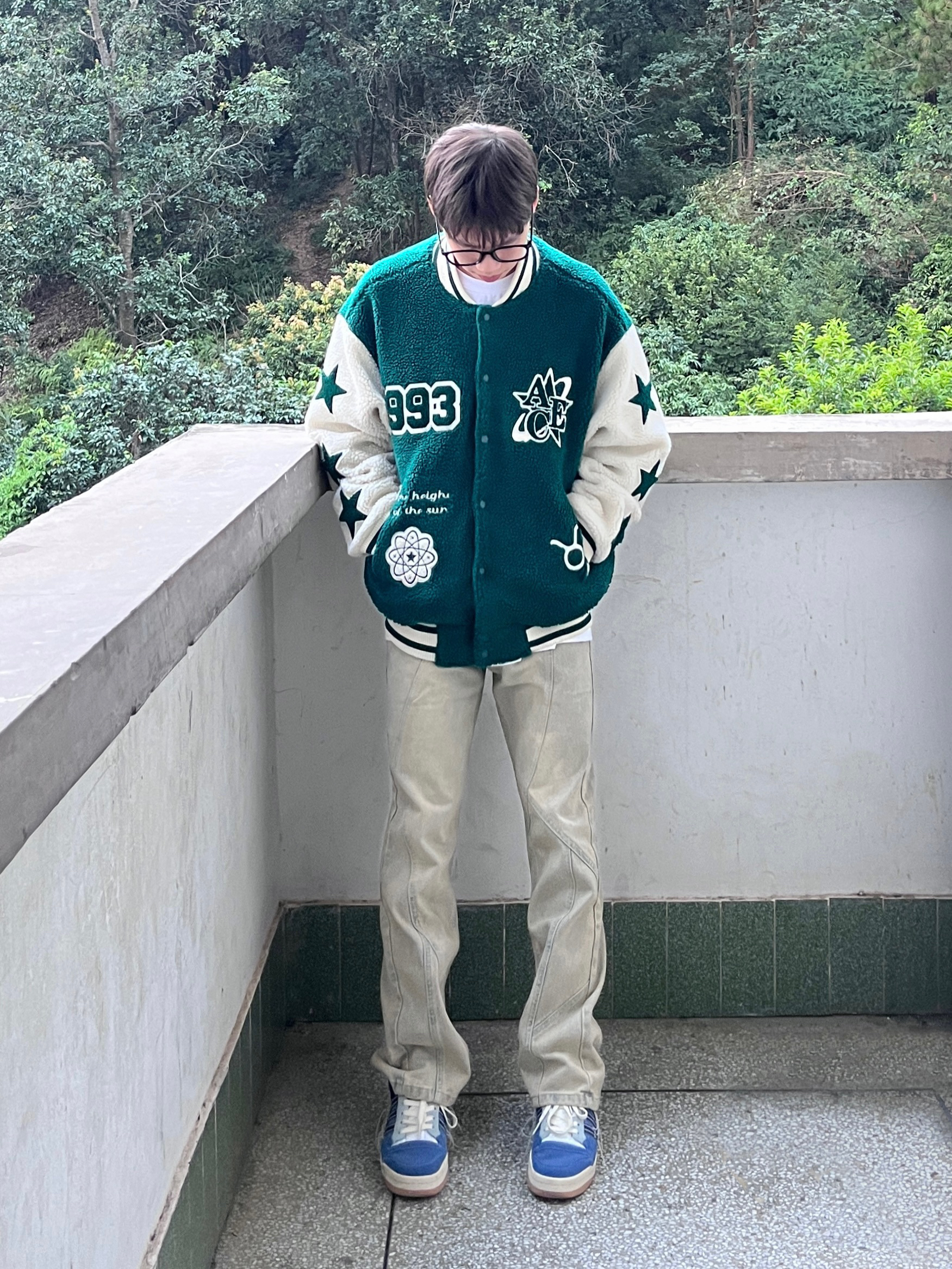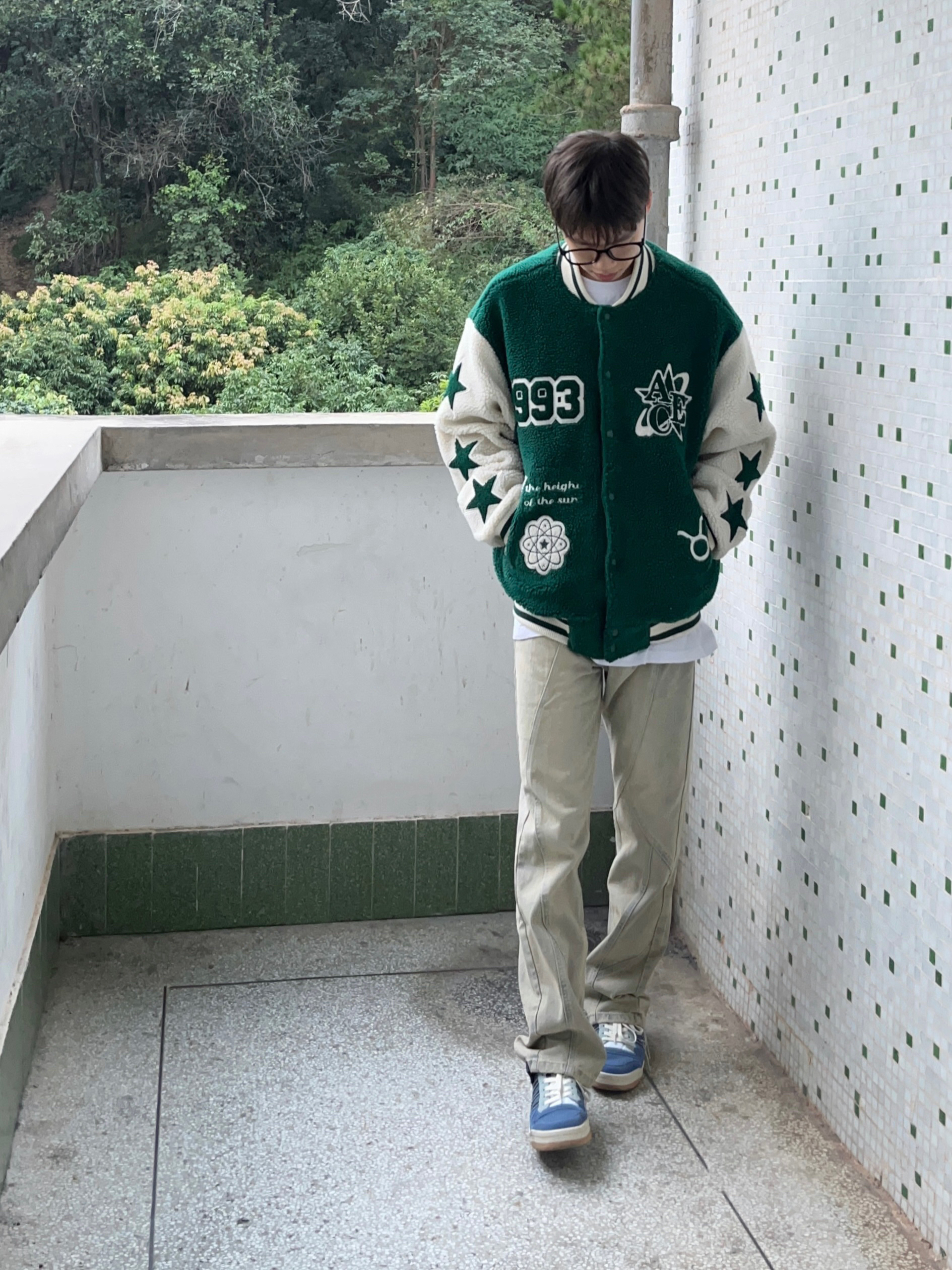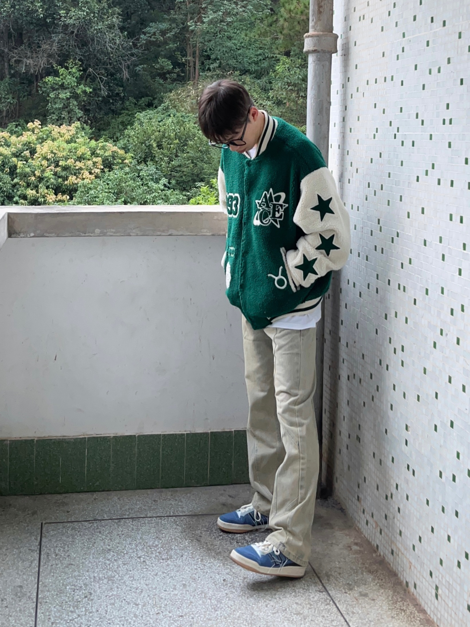 今日份穿搭look✔️ 衣服是 YK&YB 家的森林绿棒球服 撞色拼接设计颜值很顶 刺绣星星印花图案潮流时尚 采用羊羔绒面料保暖厚实 还是黄子韬同款哦 裤子是 URS GGON 的黄泥色做旧牛仔裤 立体解构拼接设计 美式风拉满 版型宽松显腿型 再上脚一双阿迪forum系列百搭板鞋点缀 颜值很顶