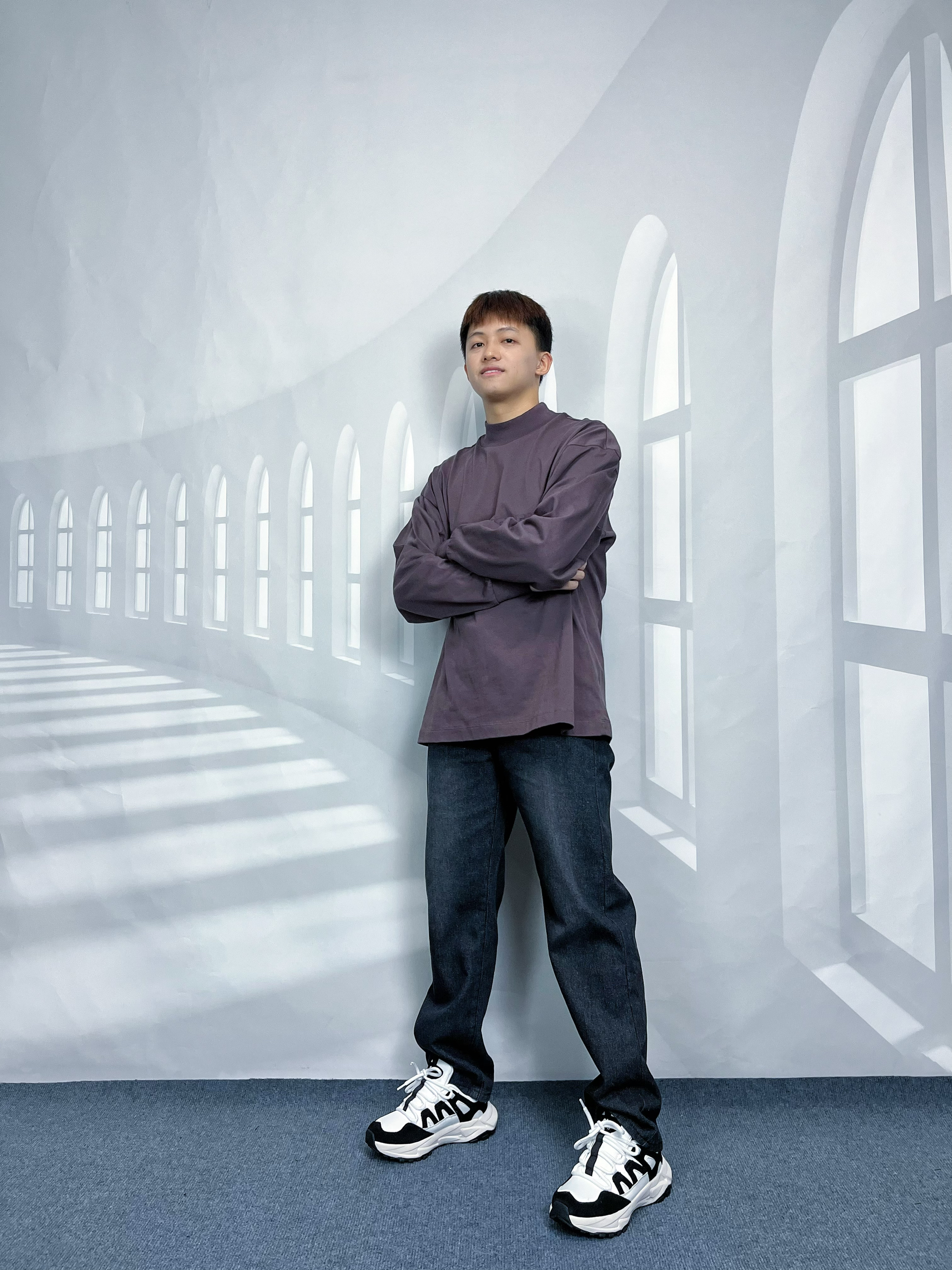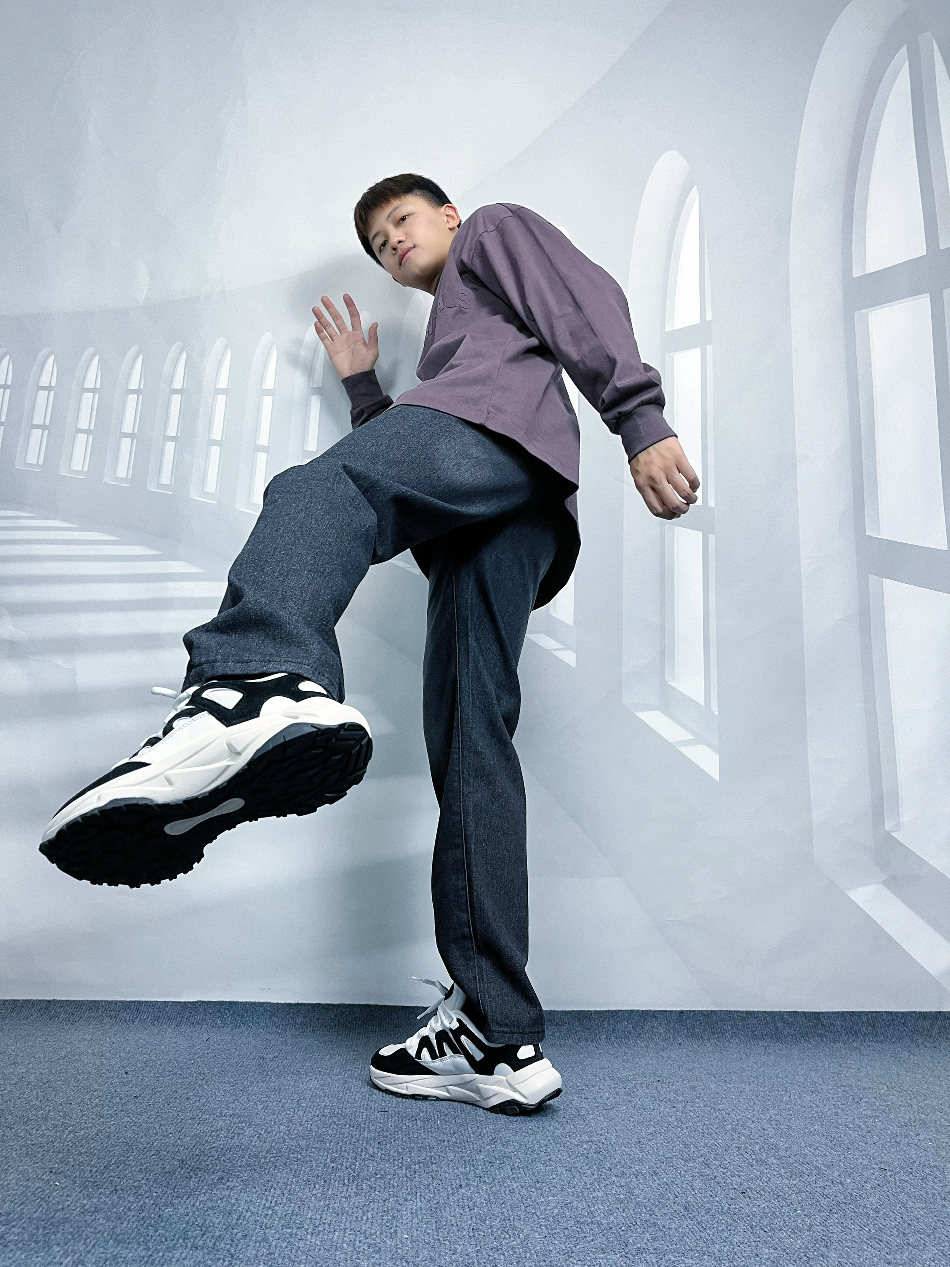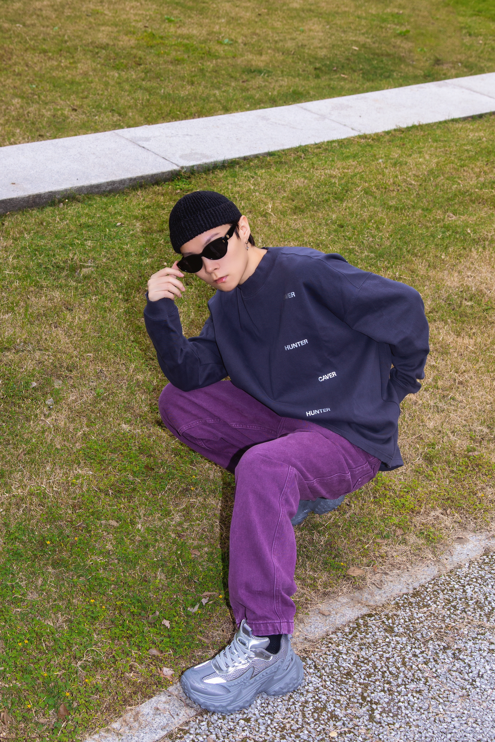 梅紫色的圆领卫衣😉 黑色系宽松阔腿牛仔裤😋 山系户外防滑厚底休闲鞋🤫 从头往下,深色系包装,适合秋季跟你去爬山🤫