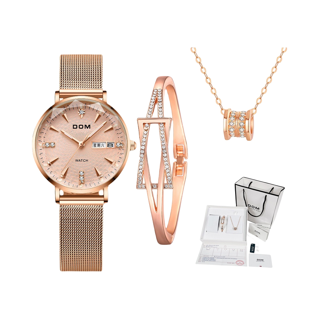 本篇笔记关联了DOM/多姆 轻奢镶钻精钢表带防水石英女士手表 【三件套礼盒】钢带玫金壳 G-1676G-9M等商品,为用户提供真实的使用体验和购买参考。