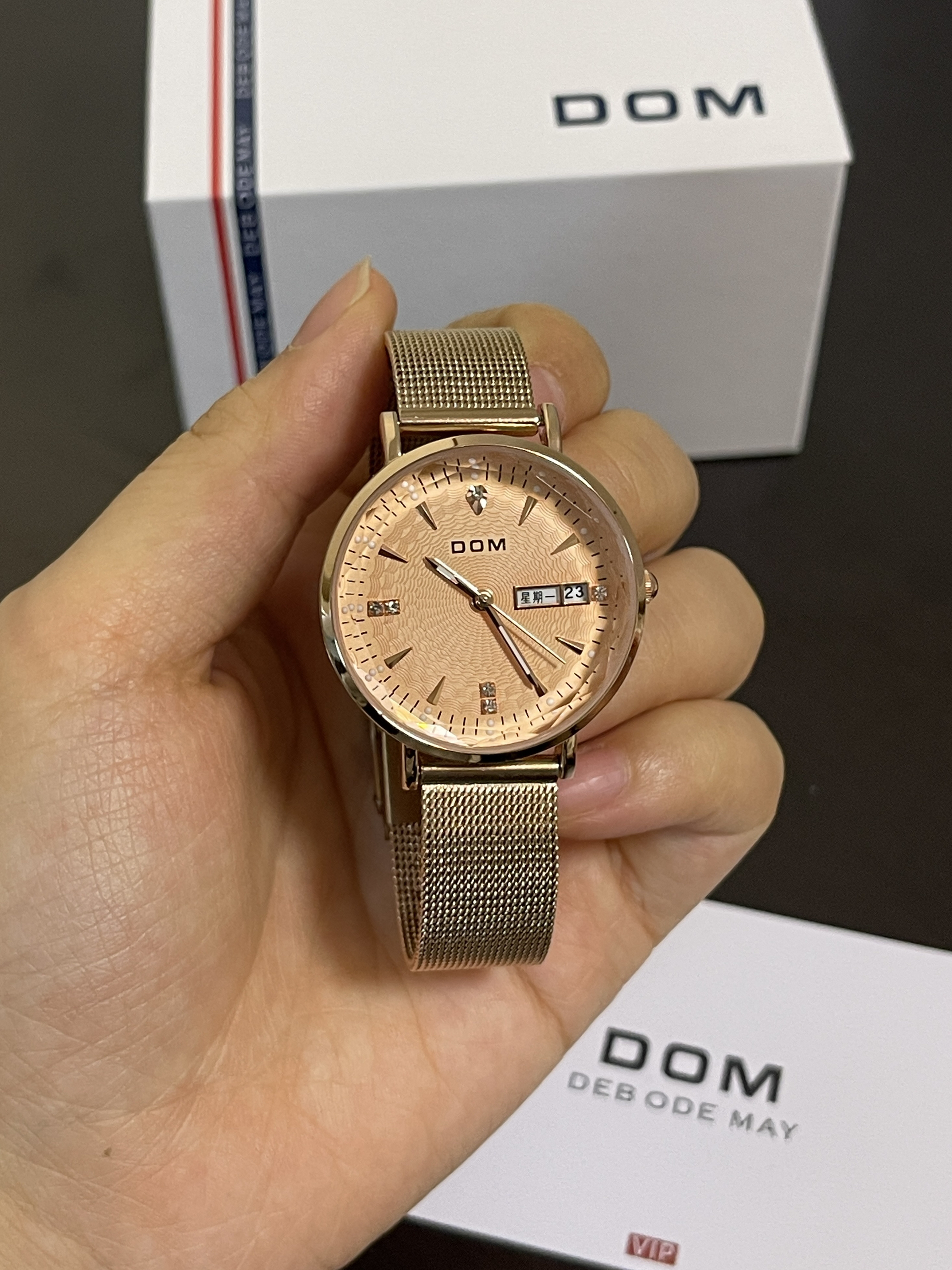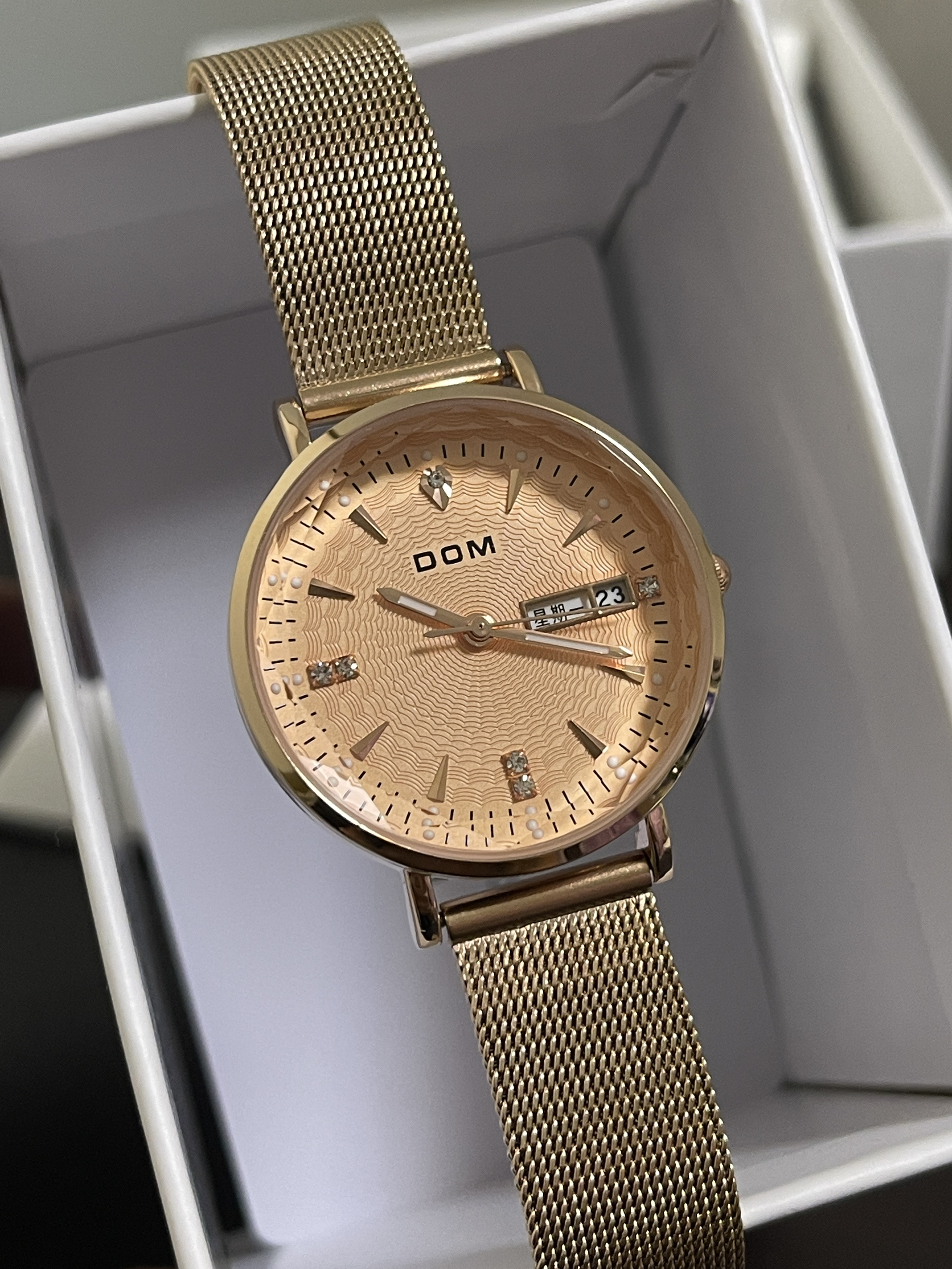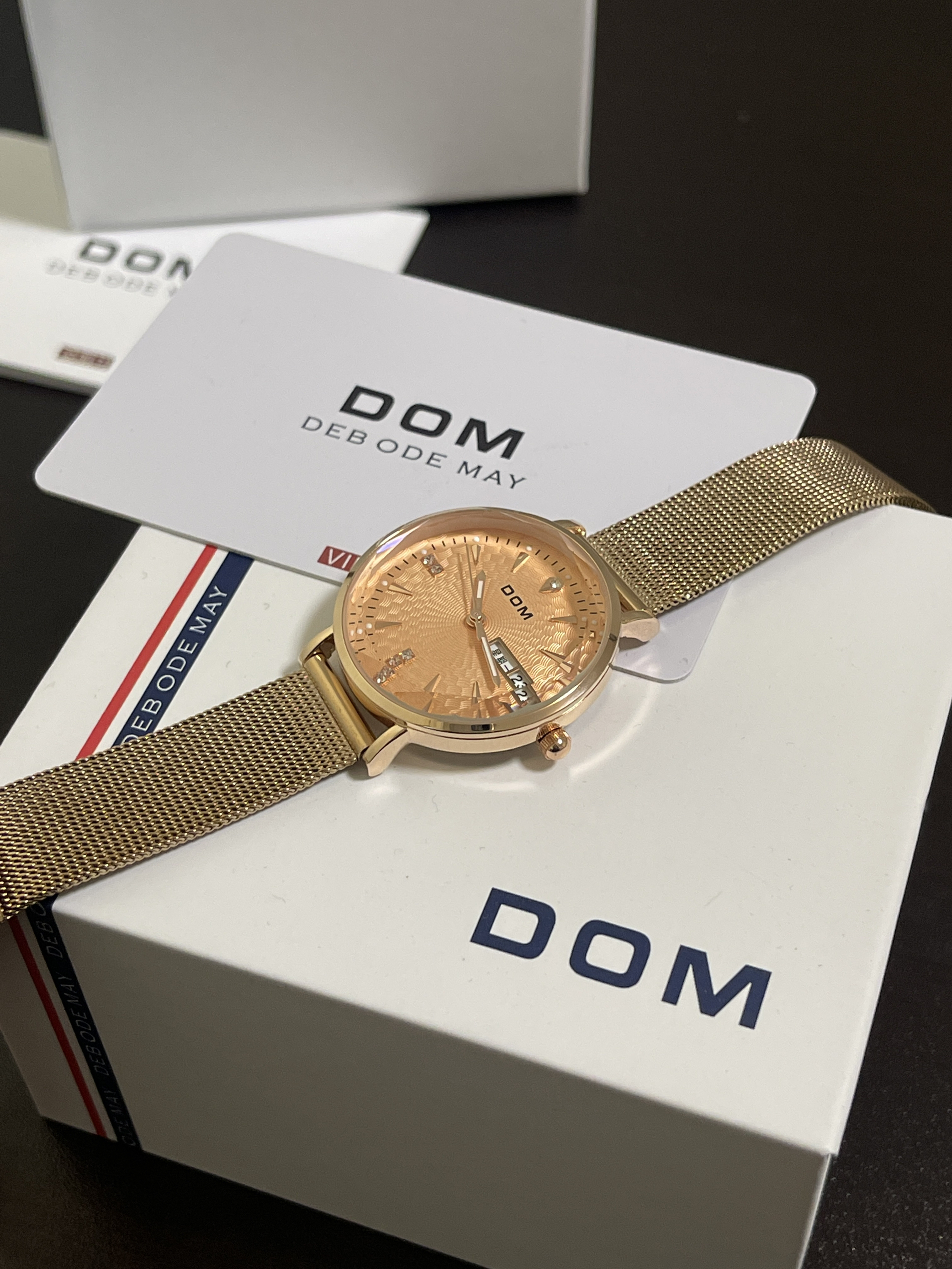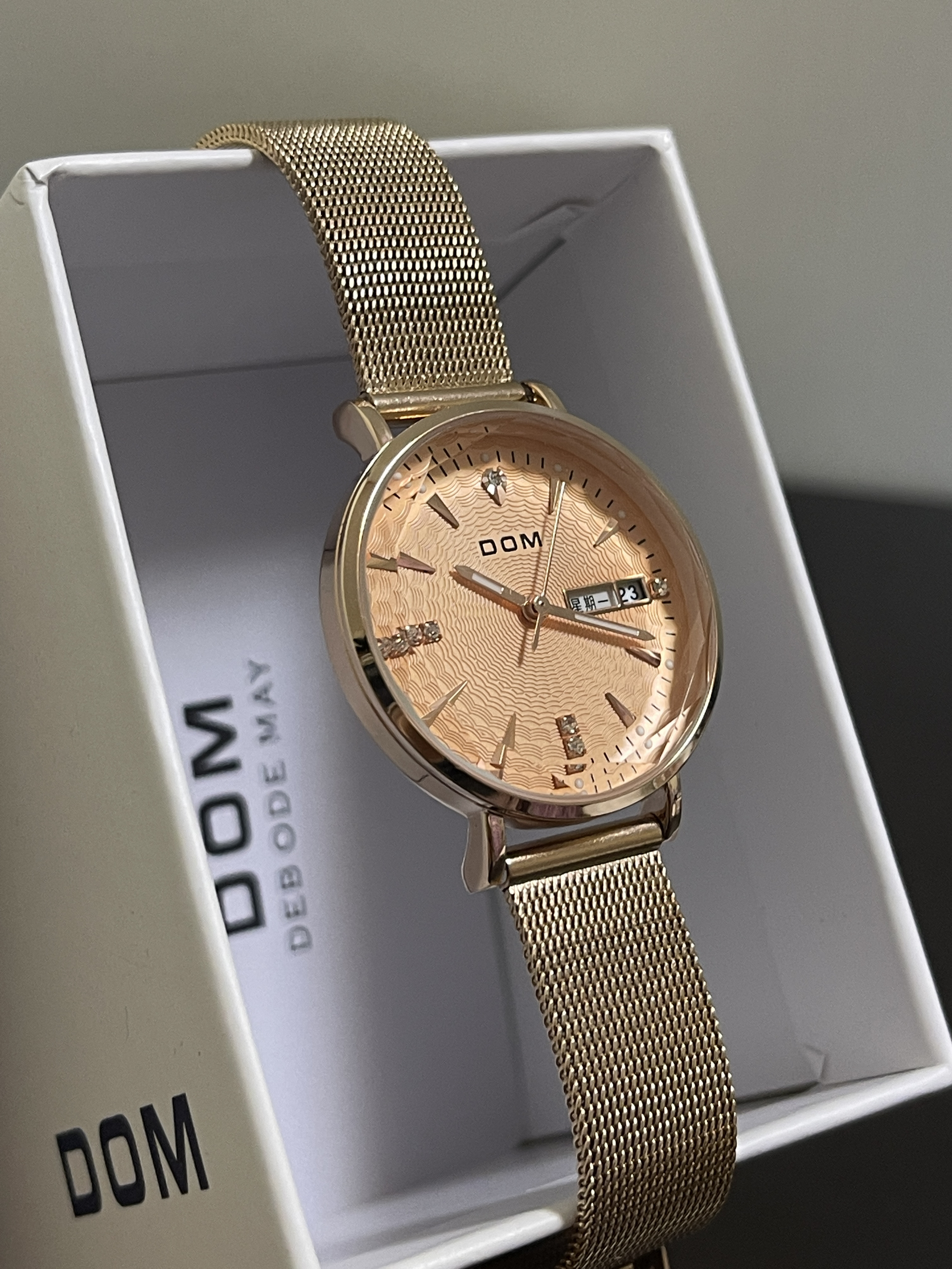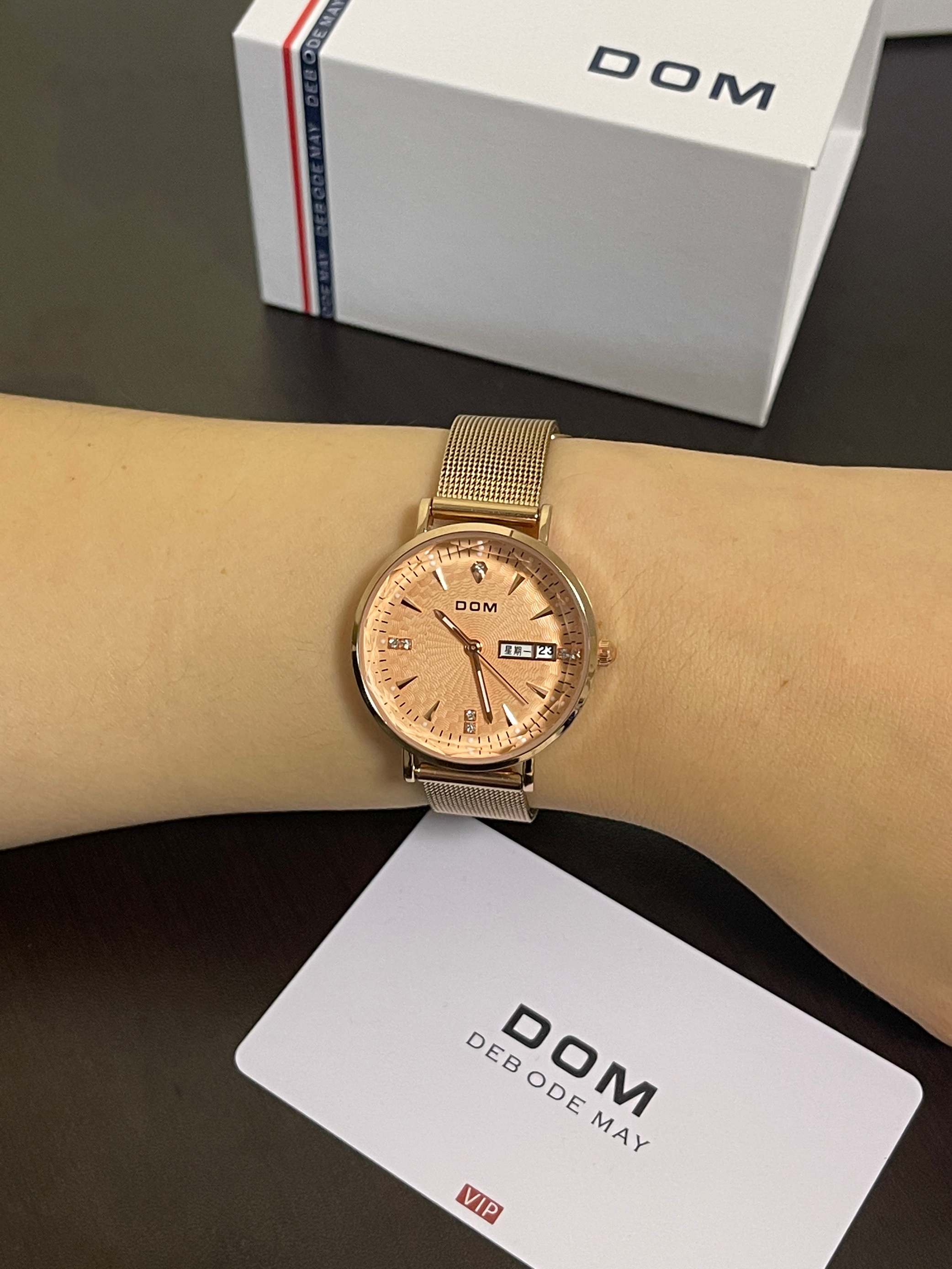 双十一快到了,给你的女友准备了什么小惊喜呢~ DOM|多姆 女士手表礼盒套装“玫瑰金”,从包装到手表实物,都是很精致的感觉,轻奢不廉价!金色表盘、钢表带➕多角度表盘玻璃,如同钻石一般💎,高级感满满!手表的功能也是很齐全,还带有日历显示,上手显白,性价比超高而且不失高级感!😍