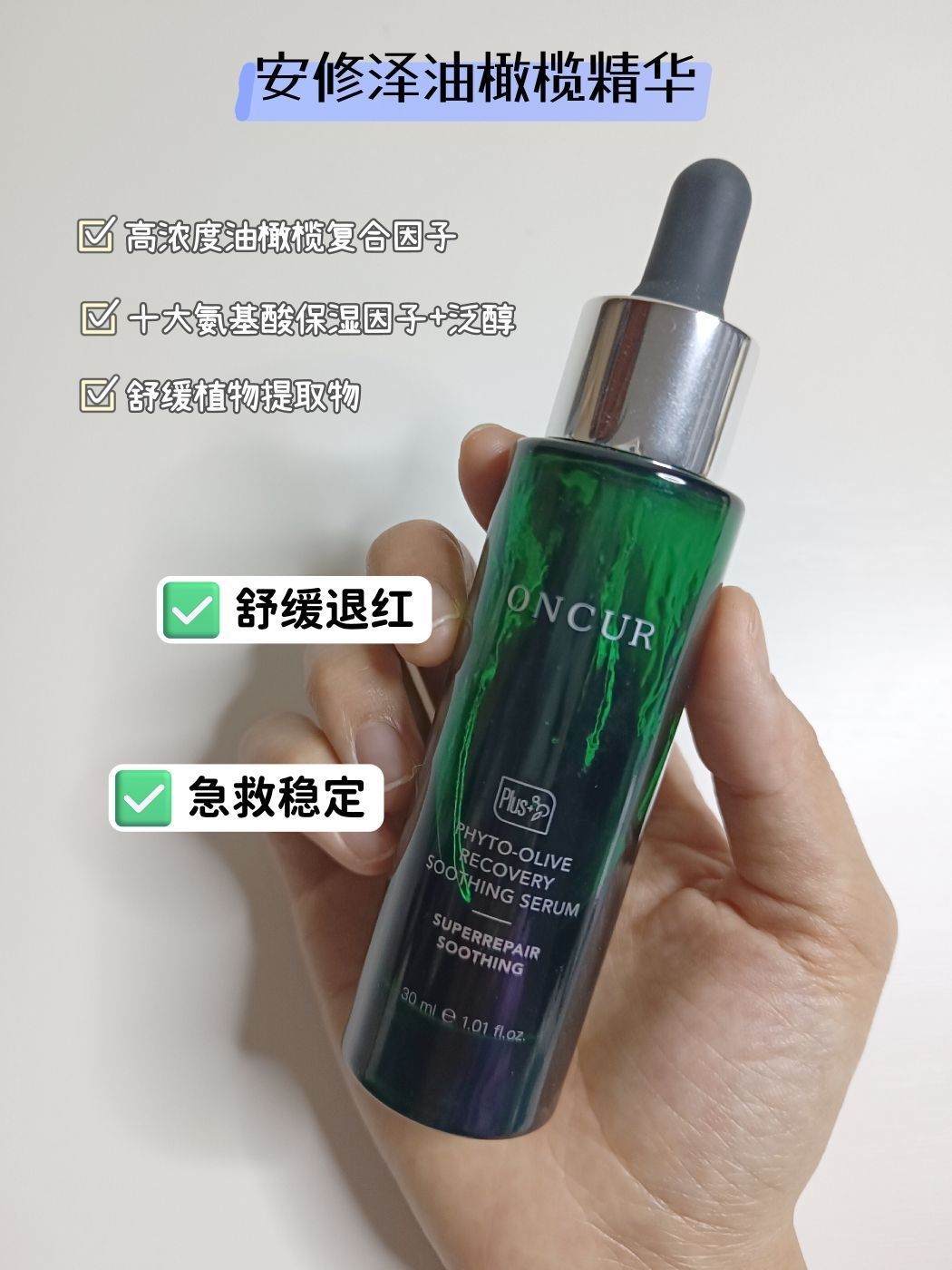 本篇笔记关联了ONCUR/安修泽 油橄榄因子面部精华液 维稳改善泛红修护舒缓肌肤屏障淡化痘印 40%油橄榄(清爽水感)等商品,为用户提供真实的使用体验和购买参考。