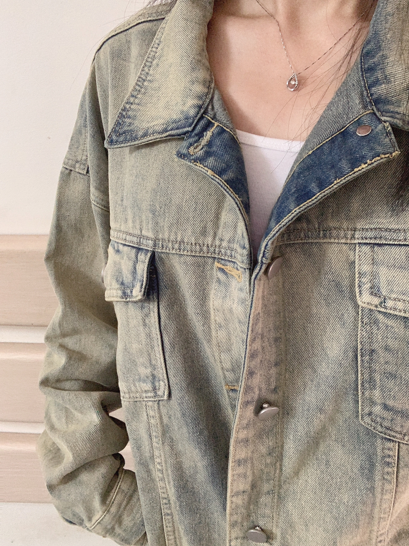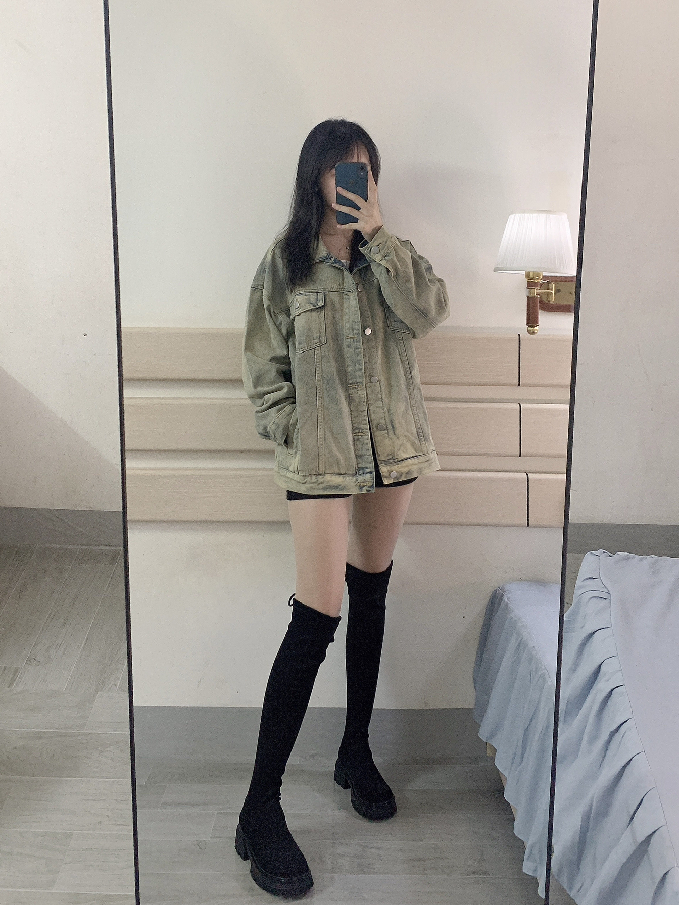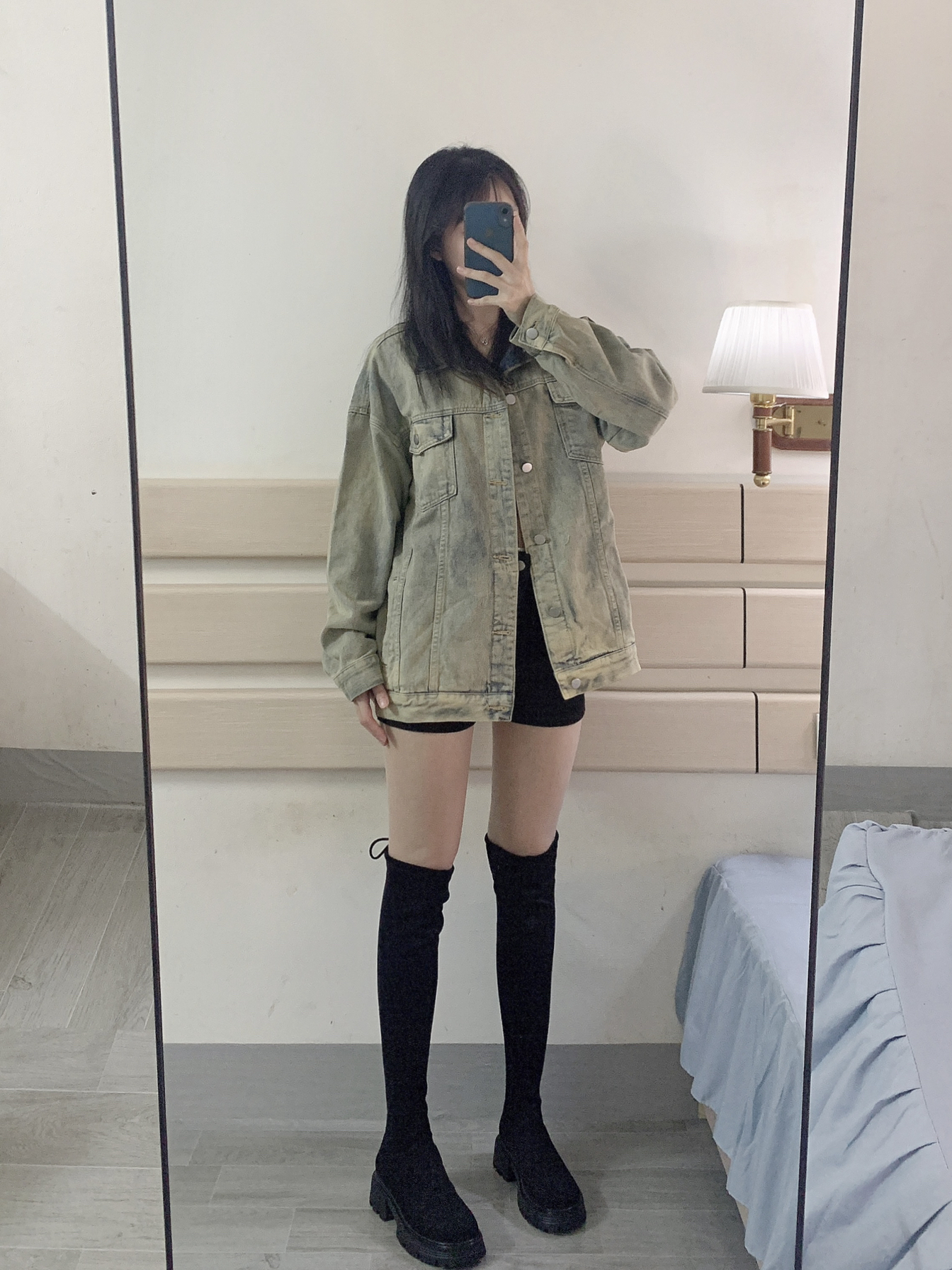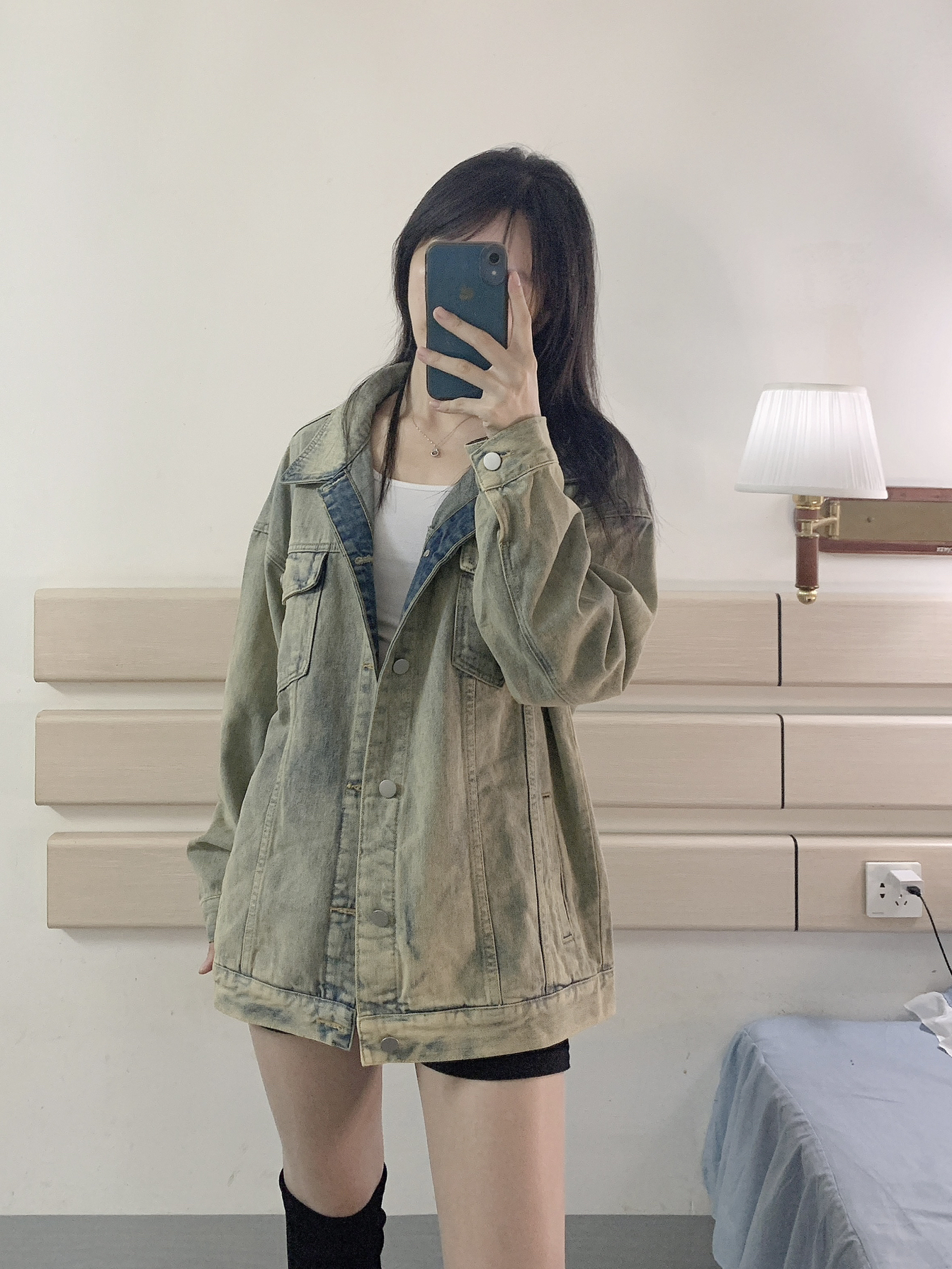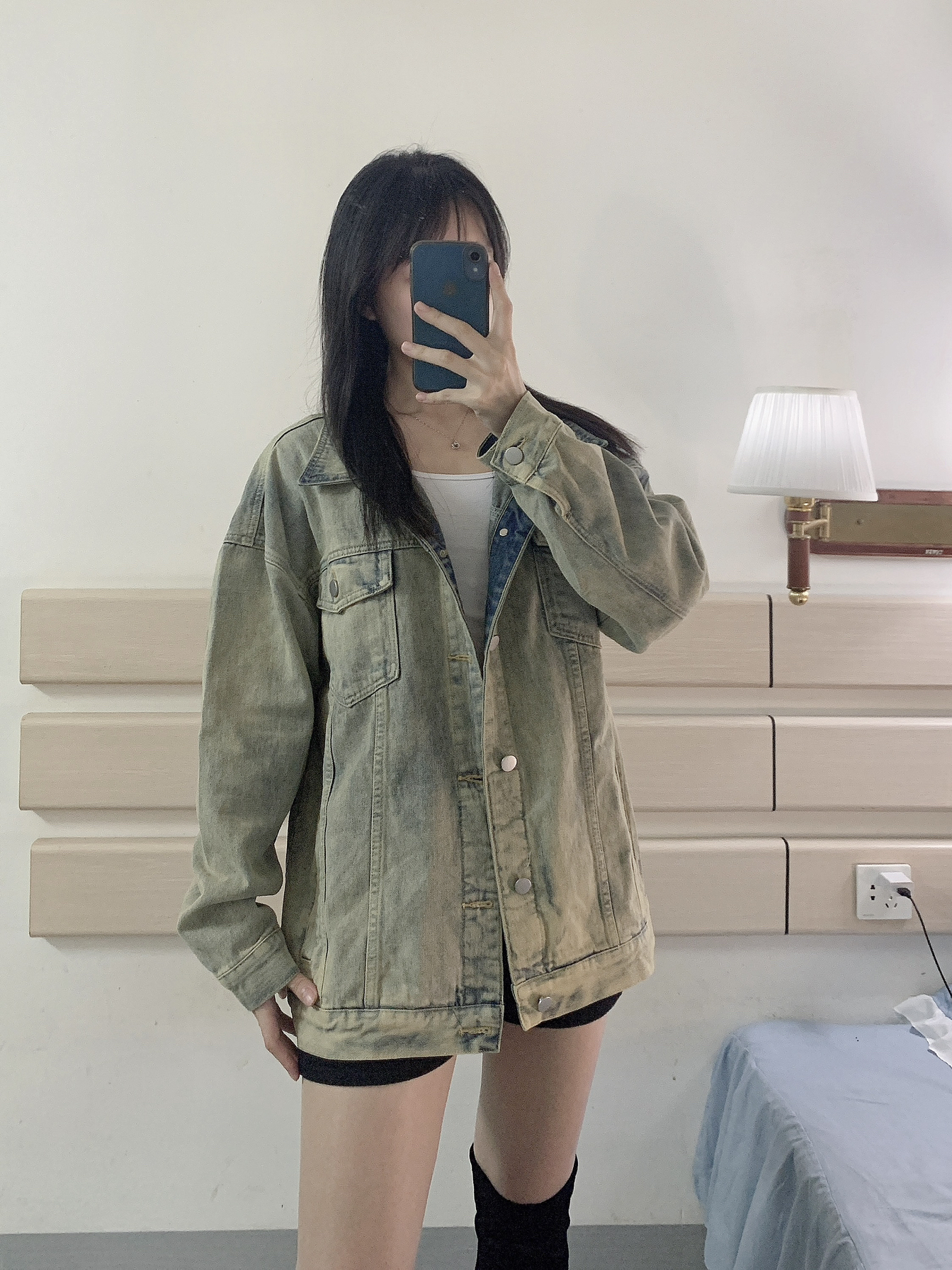 凉爽的秋天必备一件好看的牛仔衣🤠 白色内搭➕做旧蓝牛仔衣➕黑色短裤 最后再加上秋天的经典长靴✌🏻 整个穿搭就是时尚的酷酷风🌪 牛仔外套厚度适中 质量很好!! 怎么搭都好看 男女通穿😁