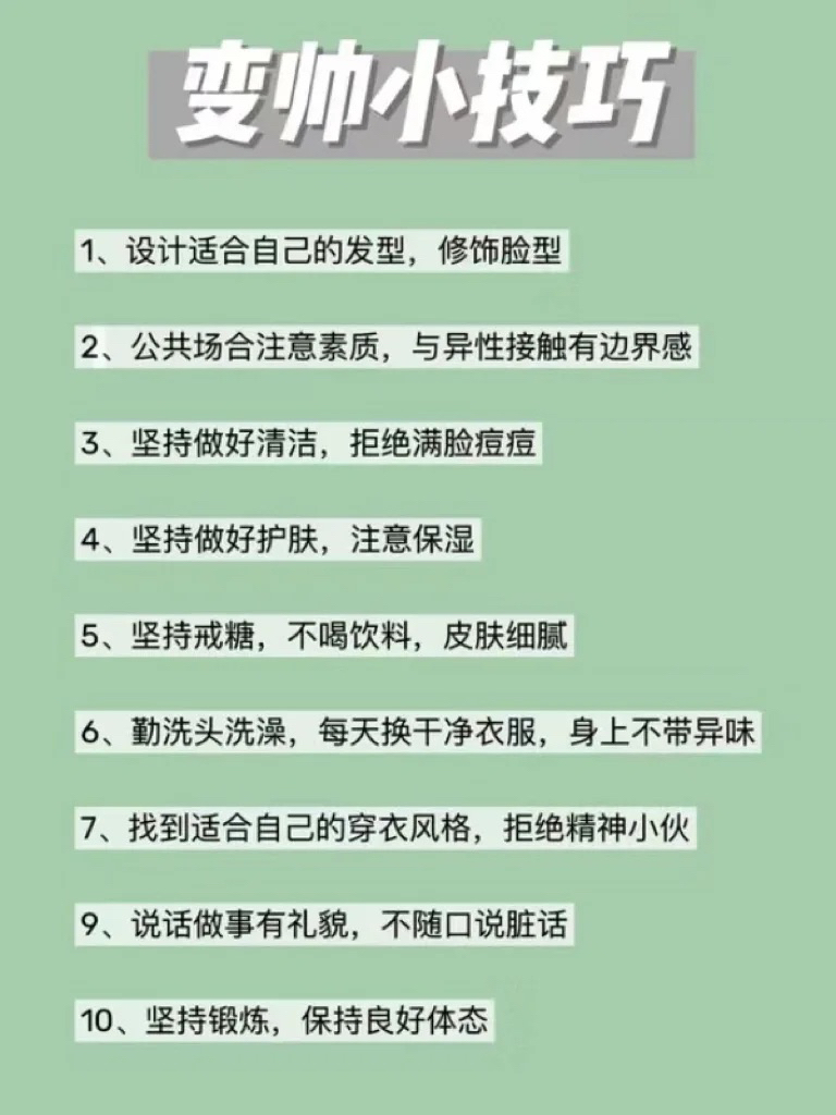 女生视角:普通男生怎么改变看起来更帅!|||面部管理:坚持剃胡须,洗面奶洗脸!质感好的皮肤让人看起来精神且干净! 服饰搭配:首先要了解自己的身高、体重、肩宽、腰围。合体的衣服大过于设计!设计太多的衣服容易看起来档次低,可以选择纯色或者莫兰迪色系。简约让人看起来更有高级感。 最后 干净 干净 干净十分重要! 干净的袜子,干净的鞋子,干净的指甲!!细节很重要! 小tips:强烈男生可以用香味清新的洗发...