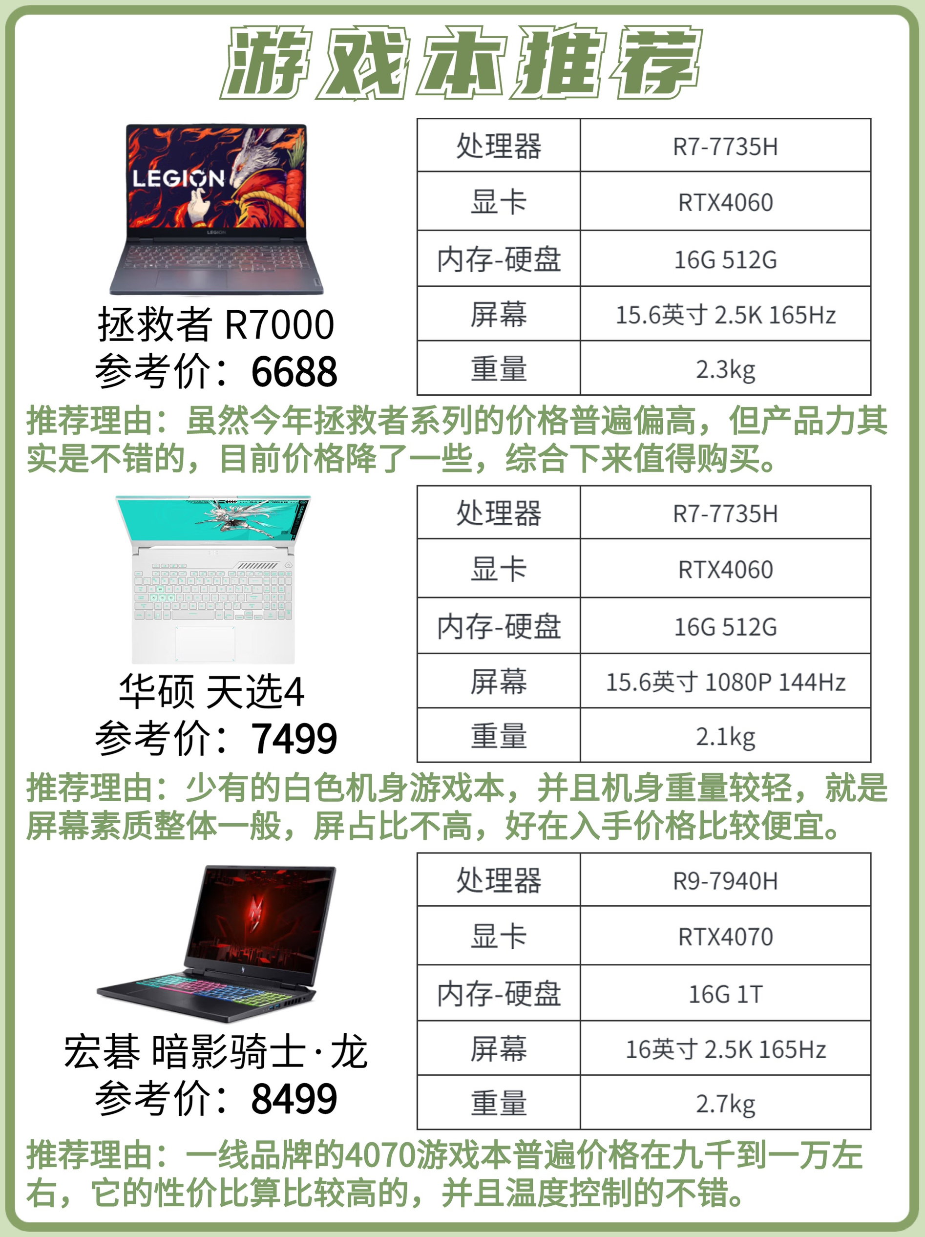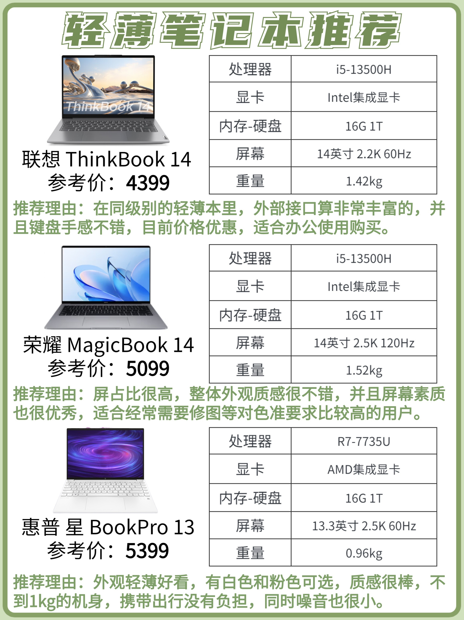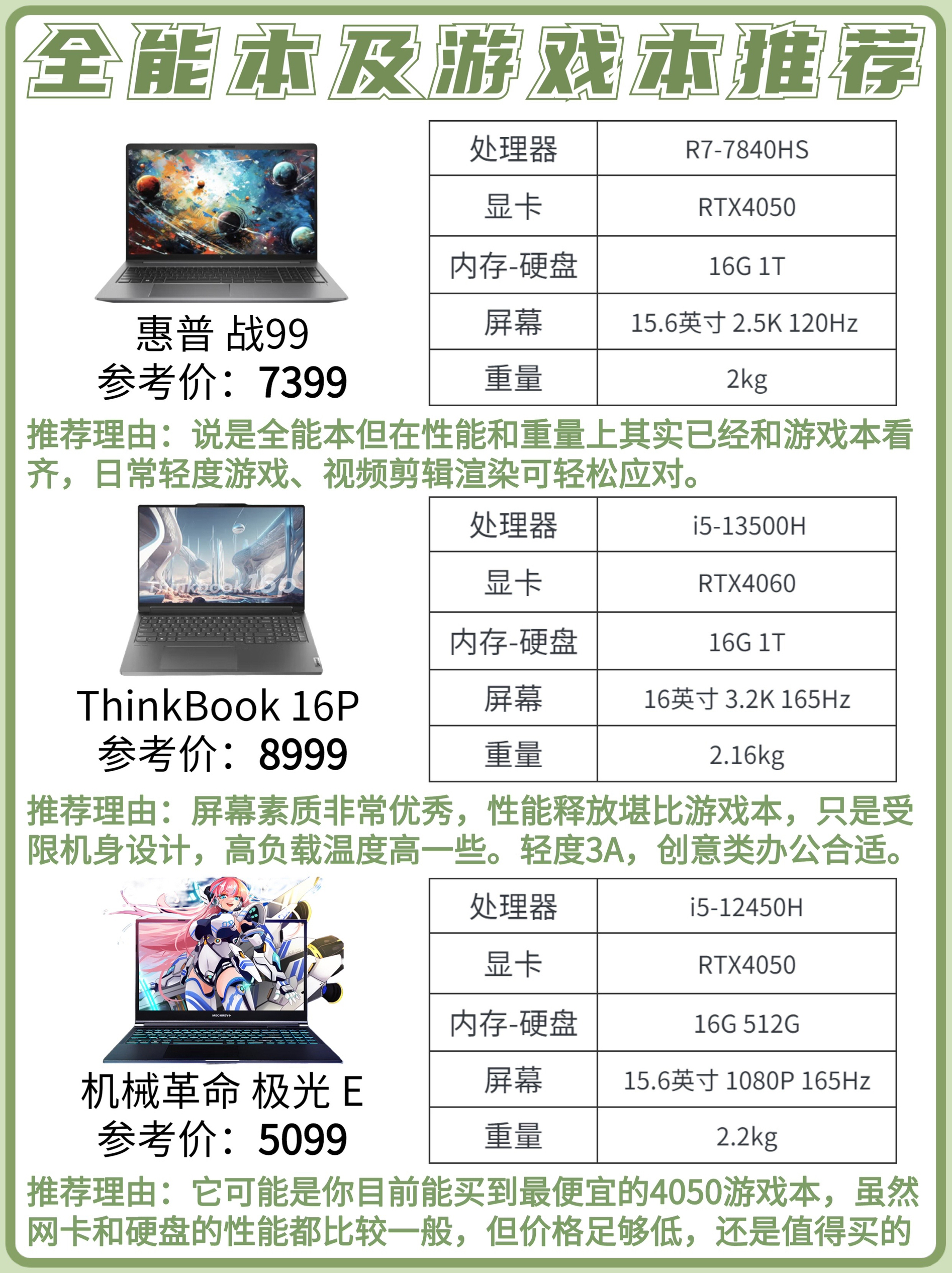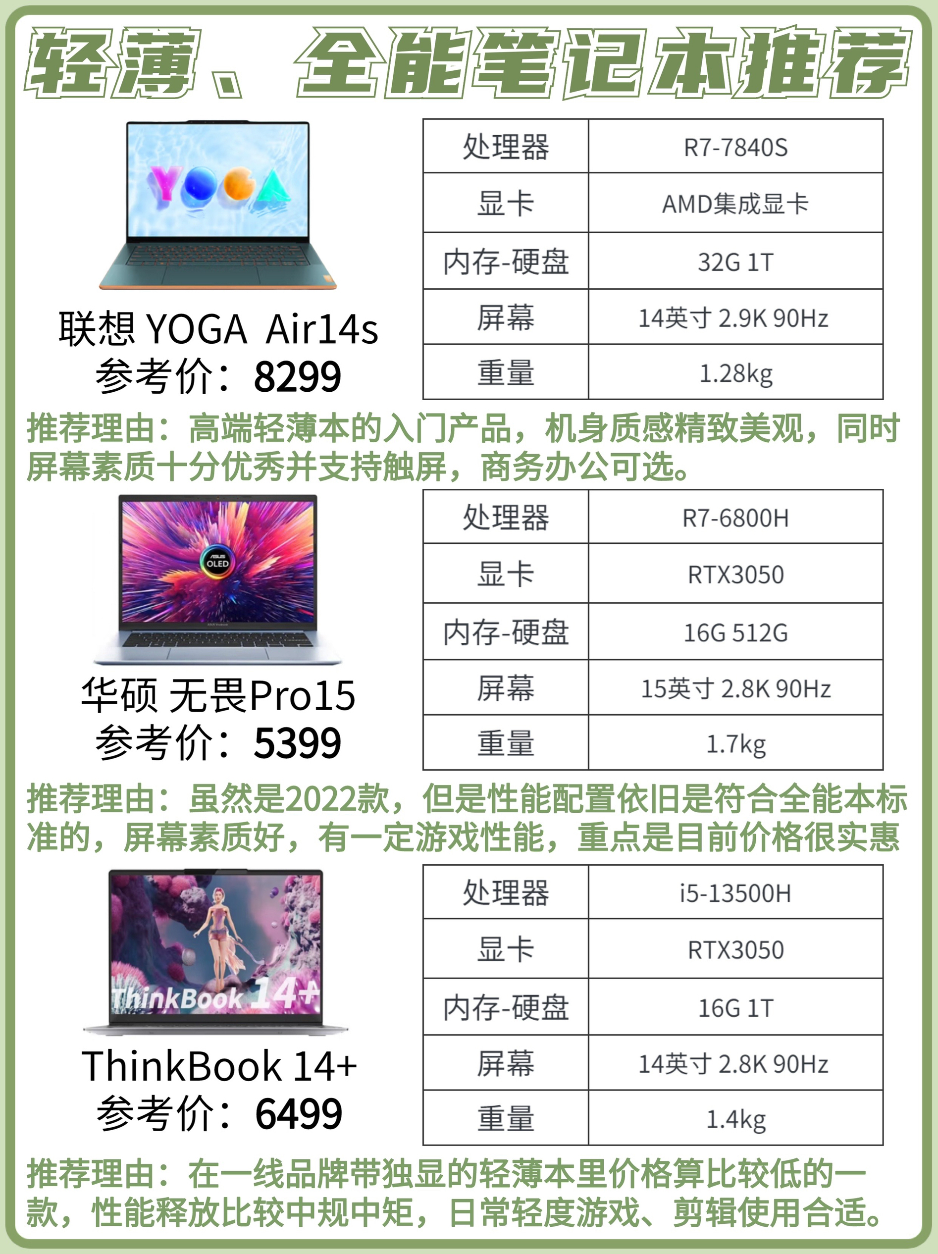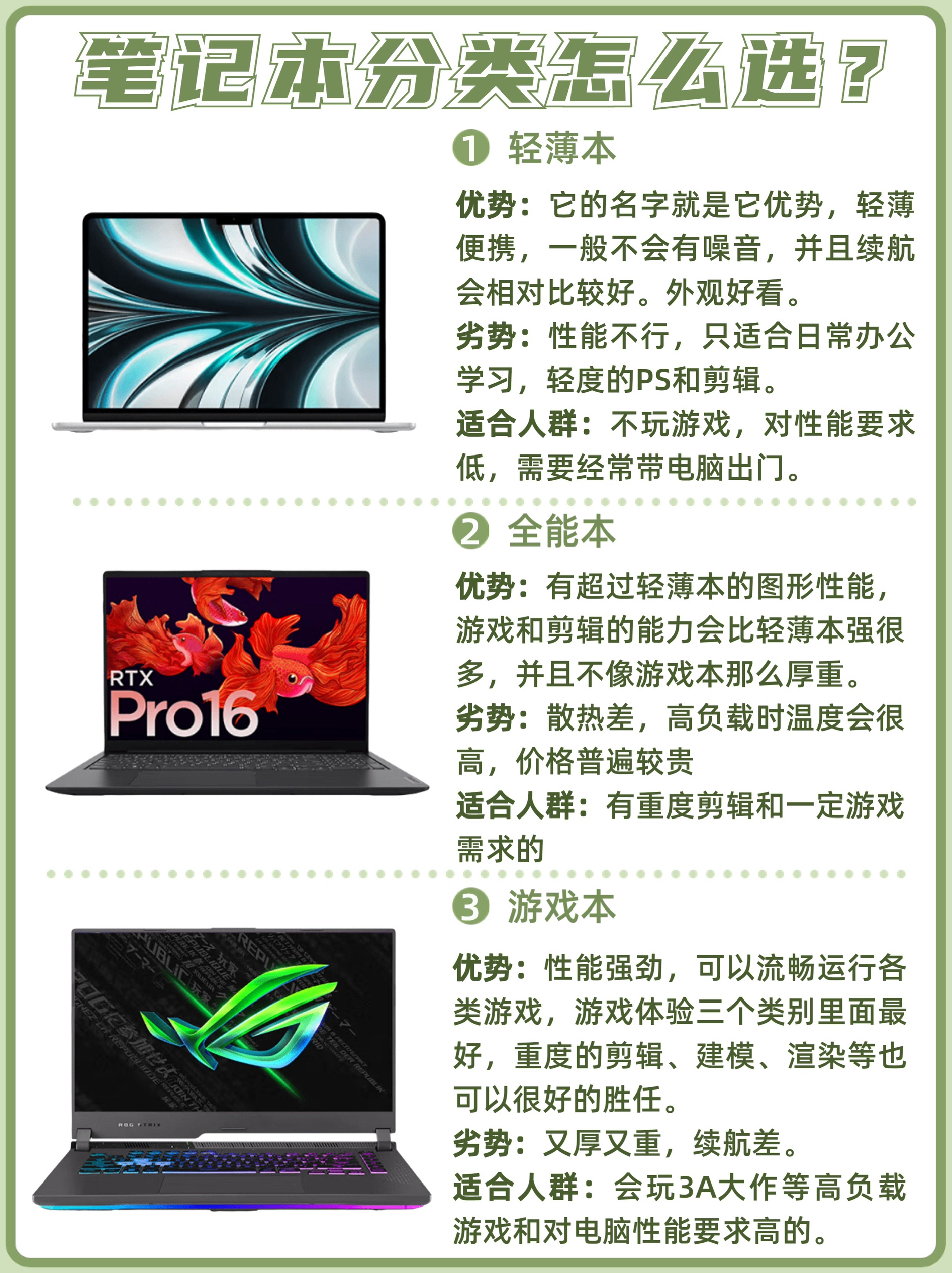 双十一临近,大部分的笔记本品牌活动也已经开始,作为可能是全年里笔记本产品折扣力度最大的时候,有想法要换新或者买第一台笔记本的同学可不要错过了。 今天给大家挑选了轻薄本、全能本、游戏本里不用价位的性价比之选,大家可以根据自己的购机预算和需求合理选择。 如果里面没有适合你的产品也可以留言提问:需求+预算,看到后都会回复(粉丝回复更快哦) - ✅选购攻略 1️⃣ 轻薄本、全能本、游戏本区别(详细请...