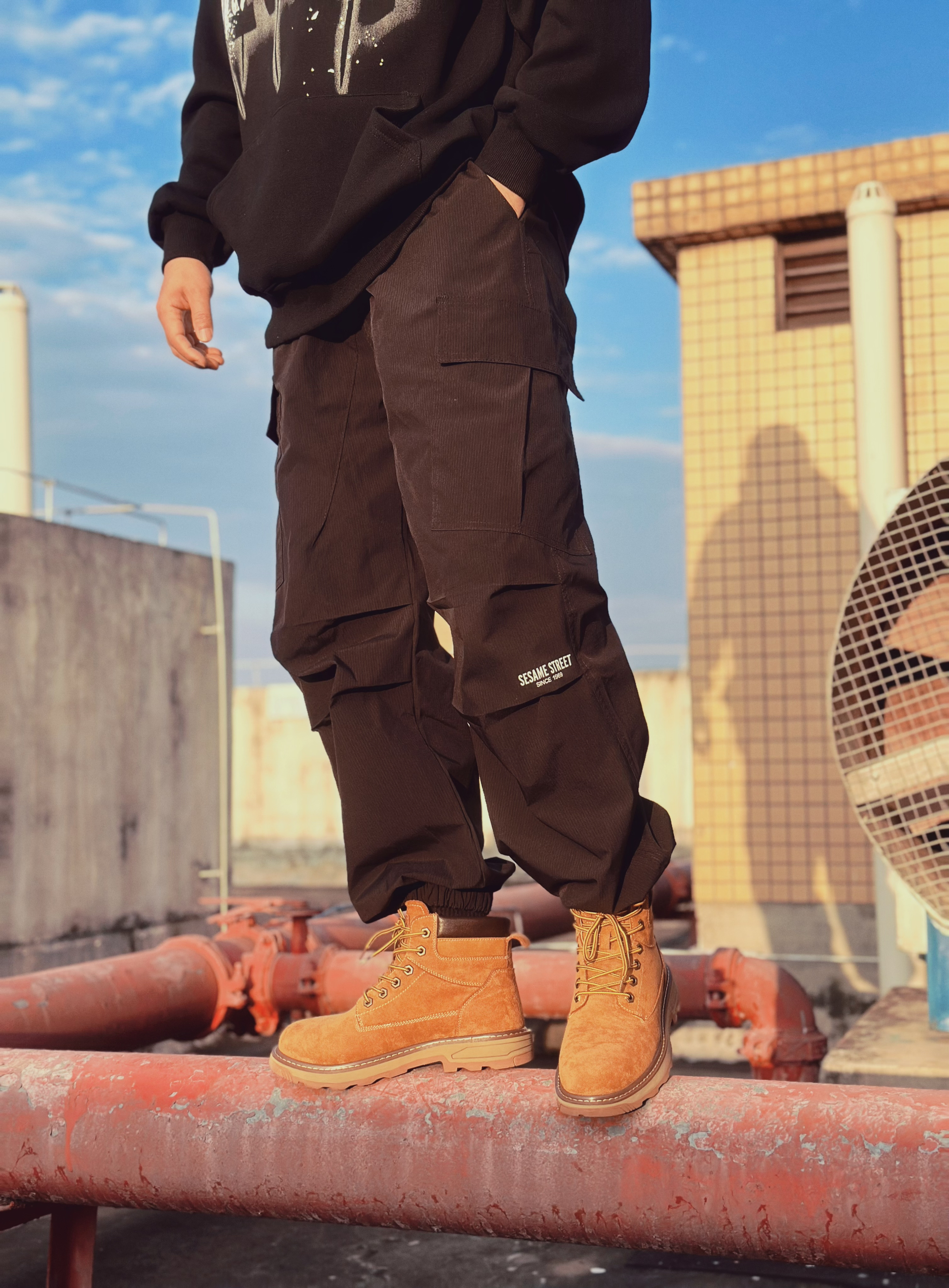 天凉的季节怎么穿搭耍酷?我的秘密就是整一双大黄靴! 今天就给大家分享大黄靴的穿搭秘籍,希望能给你们一点参考。 上身我喜欢来一件宽松的印花卫衣,会多几分秋天的慵懒感觉。 下身整一条宽松的工装裤或者伞兵裤,体现酷酷的硬派风! 上脚就来一双马丁靴,翻毛皮的设计与上身形成遥相呼应,整体酷帅硬朗风格就出来了。 个人蛮喜欢马丁靴的简洁大方,真的能完美融入各种风格,超赞!! 今日份穿搭: 衣服👕 PAINWA...
