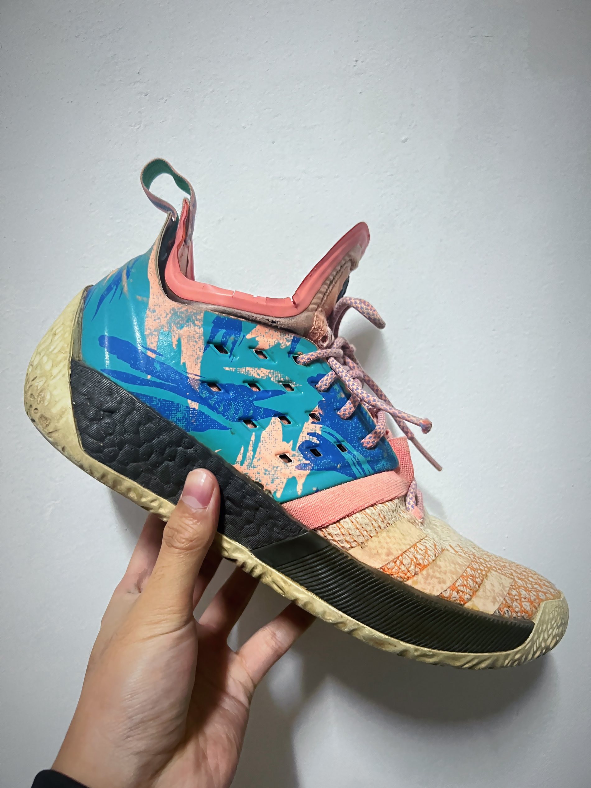 哈登2 可以说是 哈登1 的升级加强版,除了太沉其他的都完美,起码以我的水平找不到任何缺致命的点! 整双鞋采用了中低帮的造型,相比上一代缺少了几分潮流气质,更实战了! 鞋身采用了大面积的编织材料配合外侧内置 TPU 的多组鞋带孔和 利拉德3 有着异曲同工之意! 大底类似于蜂窝状的纹路有点麻麻赖赖的,据说当时是 AI 根据根据哈登的运动数据采集出来的! 上脚以后我是 45 的窄脚型 ...