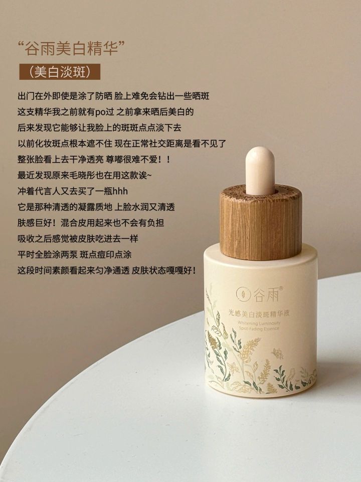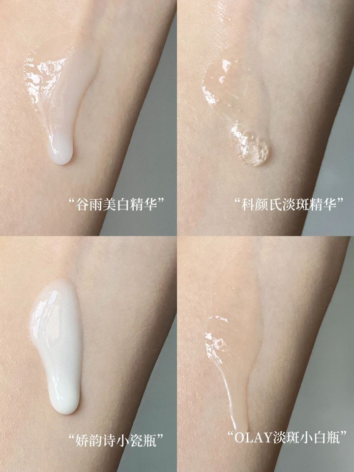 冬混干夏混油 两颊微敏 在我的众多精华里 美白精华算是我日常中最常用的了 经过大浪淘沙后挑出了几瓶我平时爱用的美白精华 给大家分享一些真实的使用感受~ 谷雨美白精华(美白淡斑) 娇韵诗小瓷瓶(提亮肤色) 科颜氏淡斑精华(淡化痘印) OLAY淡斑小白瓶(改善暗沉)