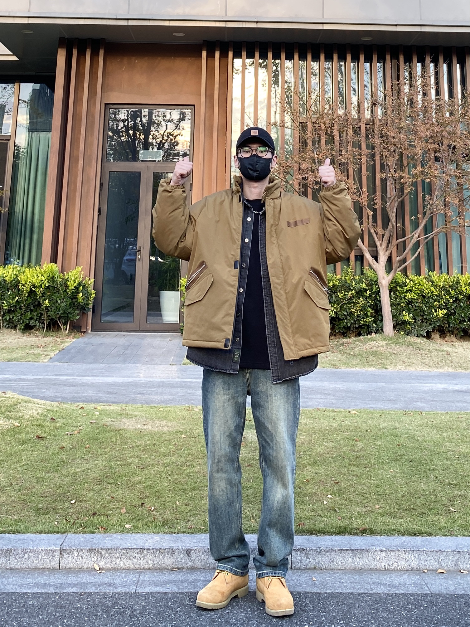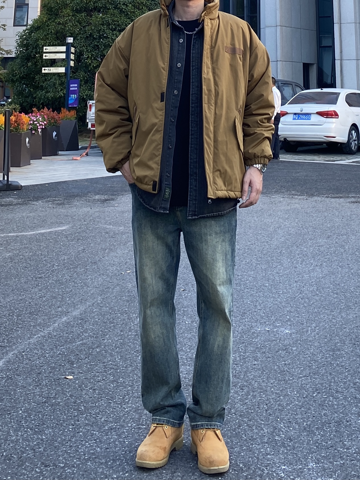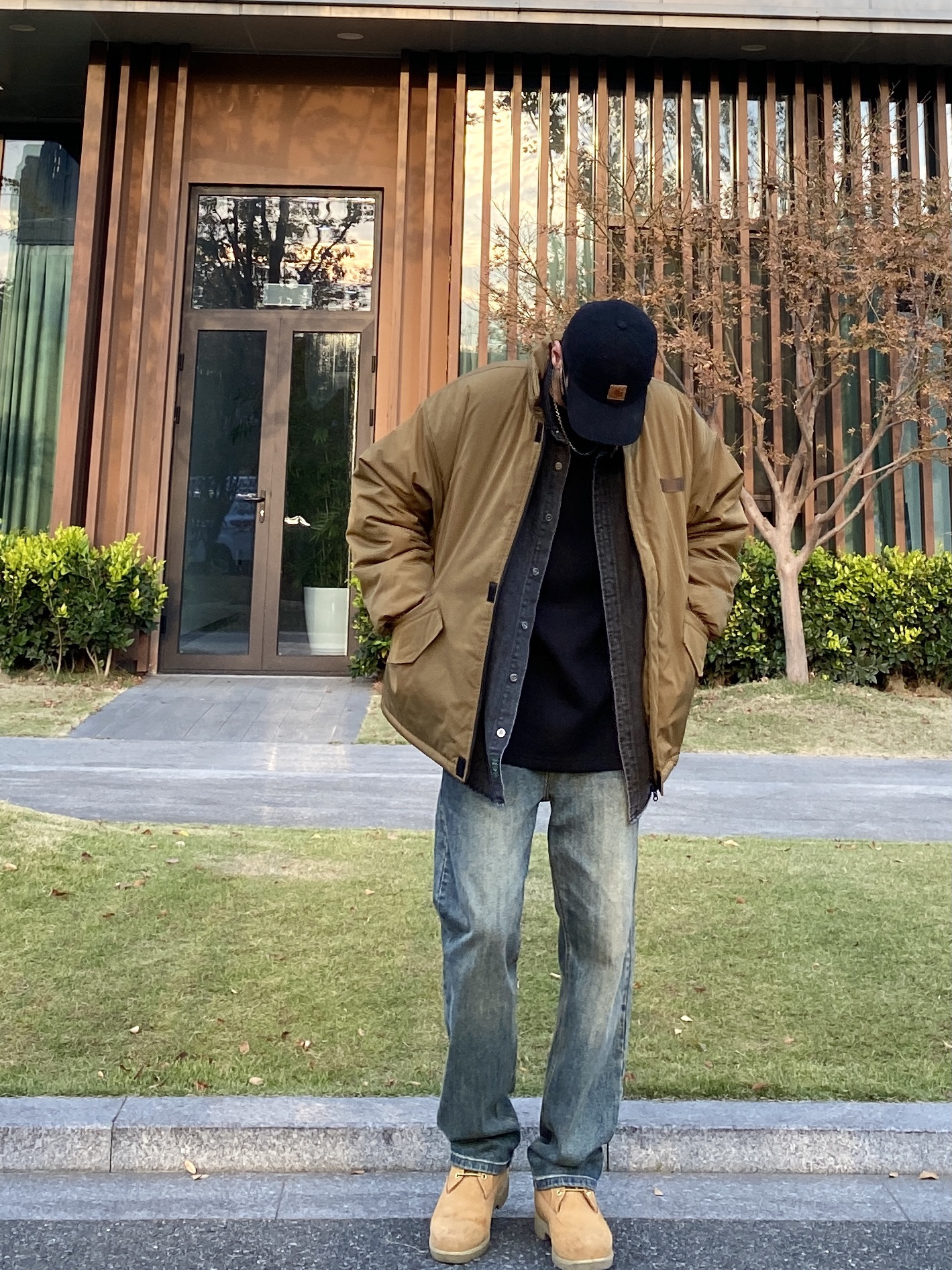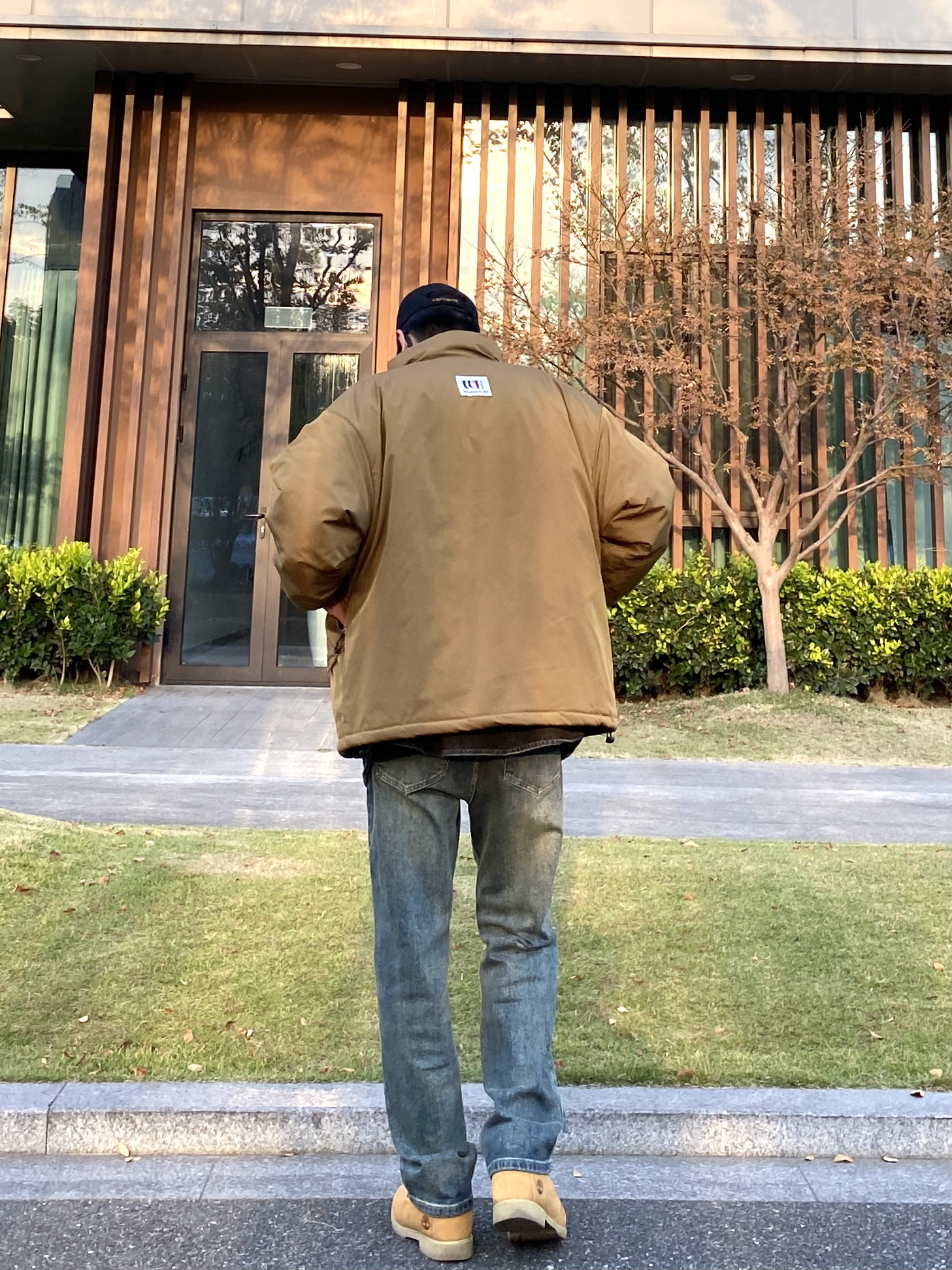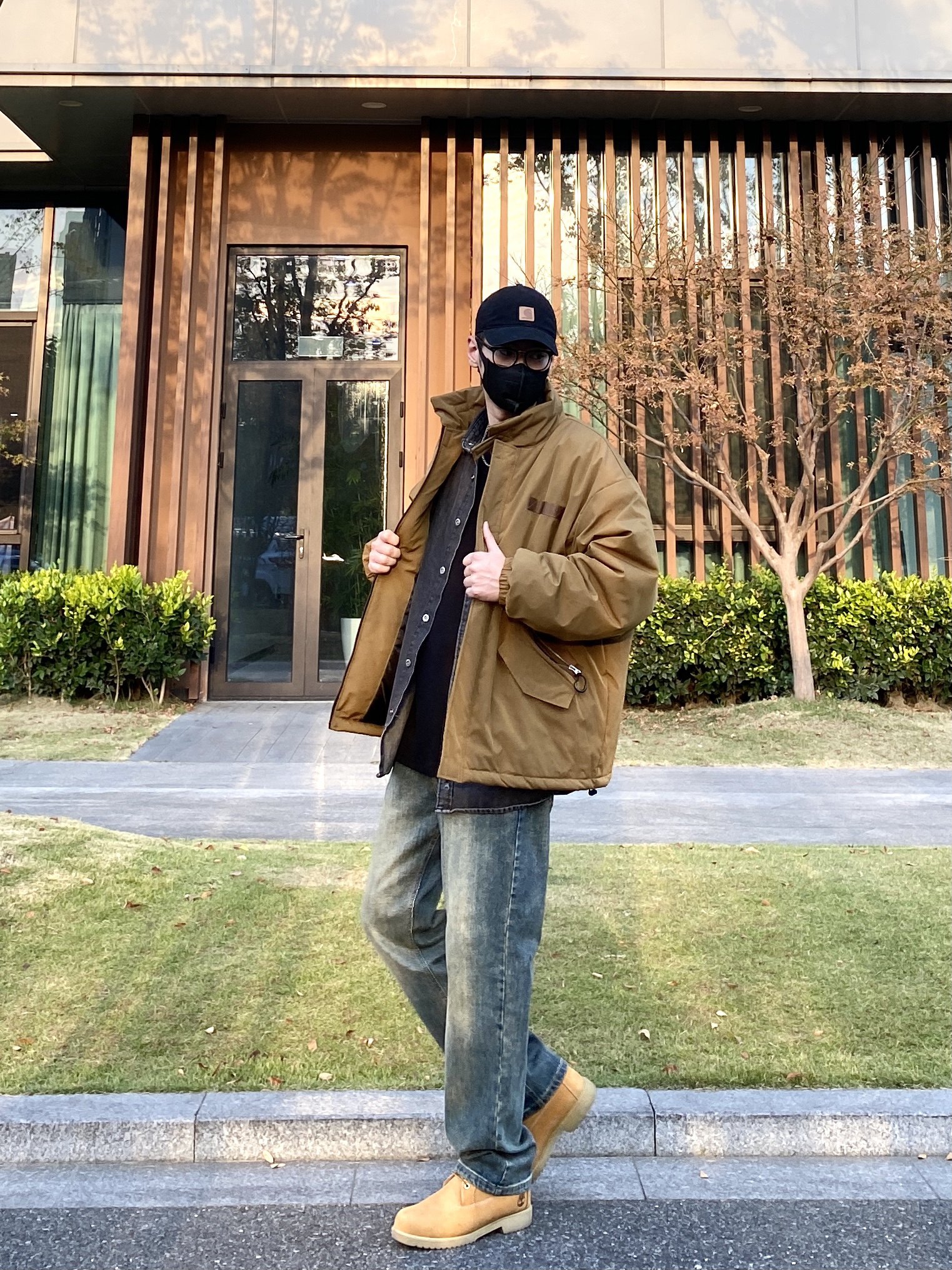 今天这套先用黑灰色牛仔衬衫做叠穿,裤子选择简约百搭的水洗直筒牛仔裤,鞋子上脚硬汉必备的timberland工装靴,接着套上卡其色宽松阔版多口袋立领棉服夹克,最后带一顶卡哈特做旧棒球帽,OK,出门看看搭配吧! - 今日穿搭 衣服裤子:NICE LILI 鞋子:timberland