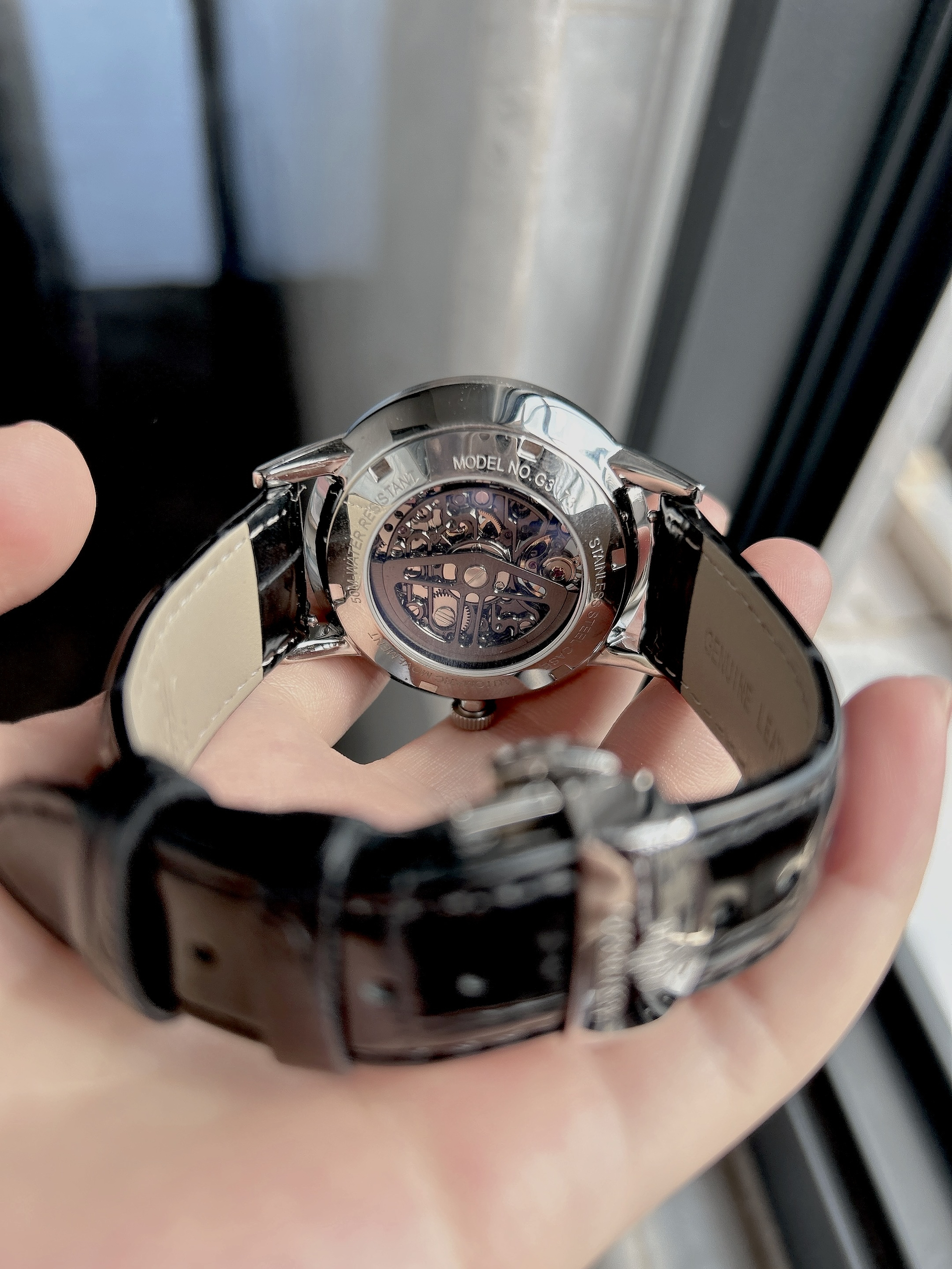 哈喽,家人们,今天的第一款好物分享来喽,最近男朋友过生日啦,给他送了一款很酷滴镂空机械表~ 礼盒是以蓝橙色为主体滴,很高级精致,送他倍有面嘻嘻~ 镂空机械手表的设计很高级又独特,入冬让他平时搭配卫衣、外套、棉服都可以~ 每天让他戴在手上,又是一个让他更爱我的小tips~