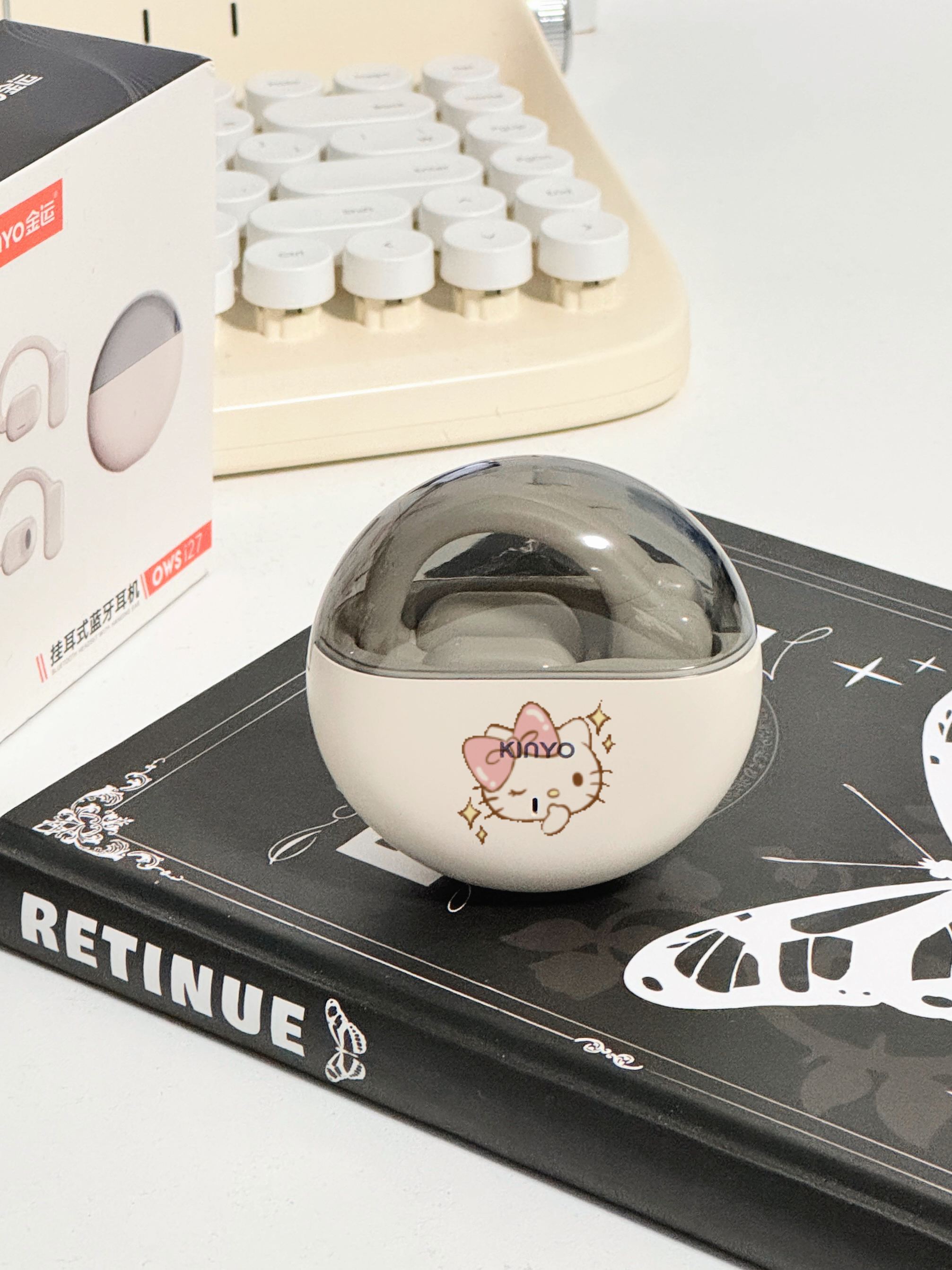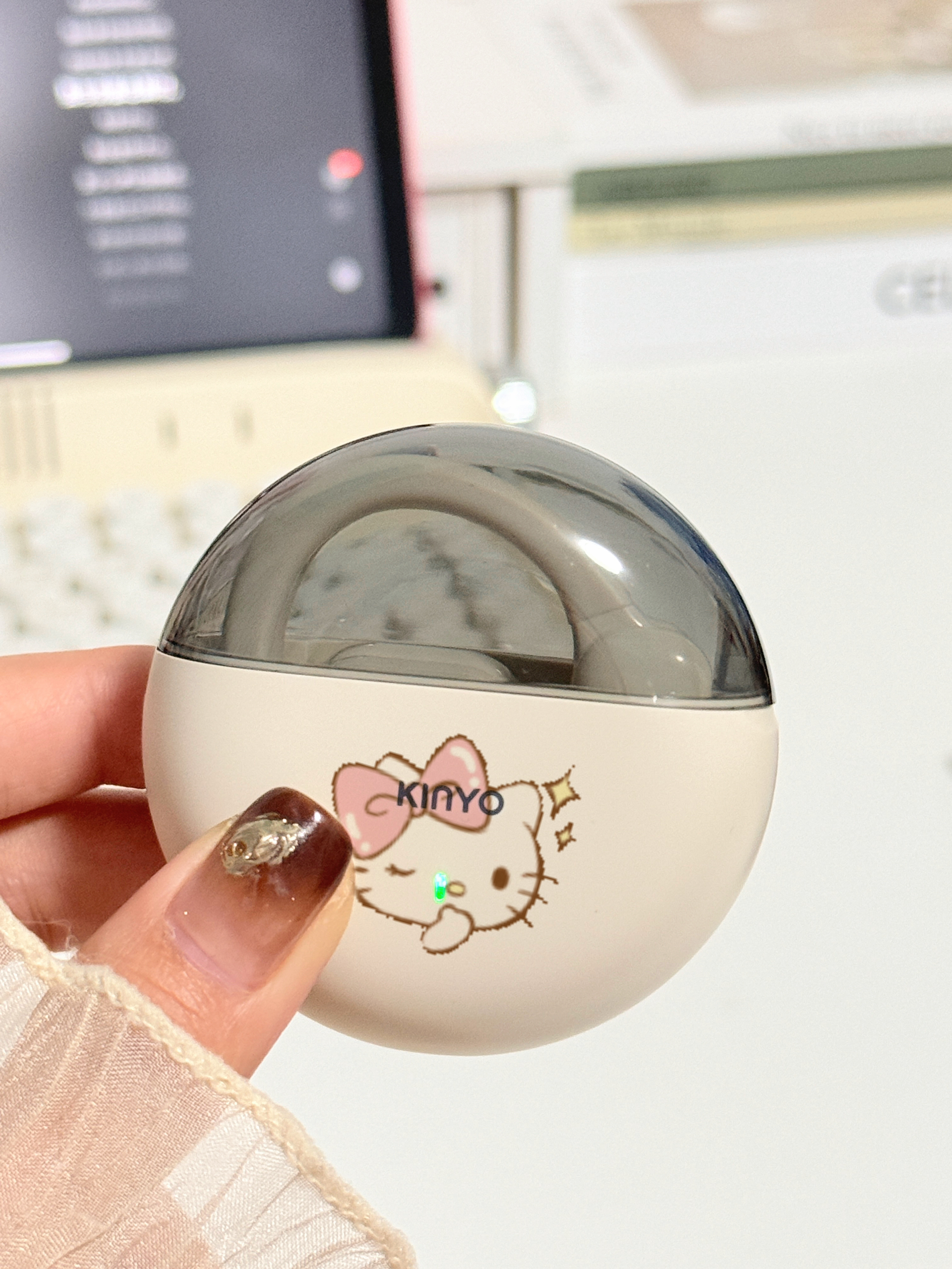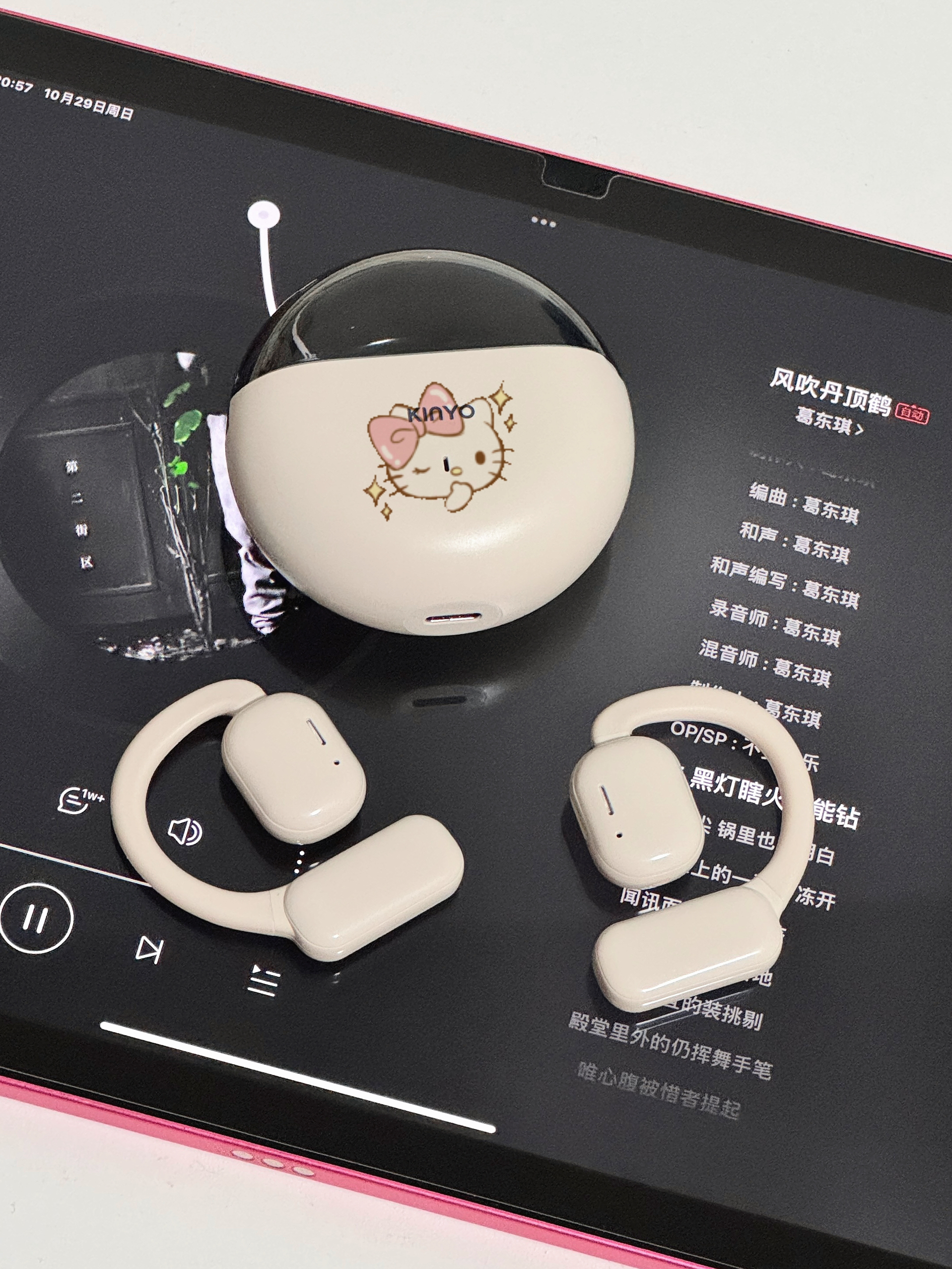 一眼心动,圆滚滚的高级感🎧 挂耳式蓝牙耳机好时尚啊!! 戴上去尊嘟不痛耳!不入耳👂🏻 最主要戴眼镜也可以听音乐 夹的很稳,🏃🏻♀️跑步运动也不掉 鹅且它还是开放式耳机哦~ 坐车也不用担心坐过站了🚇 充一次电🔋用一周完全OK 没用过金运蓝牙耳机的都给我冲 自己还DIY了hellokitty,好可爱❤️ .