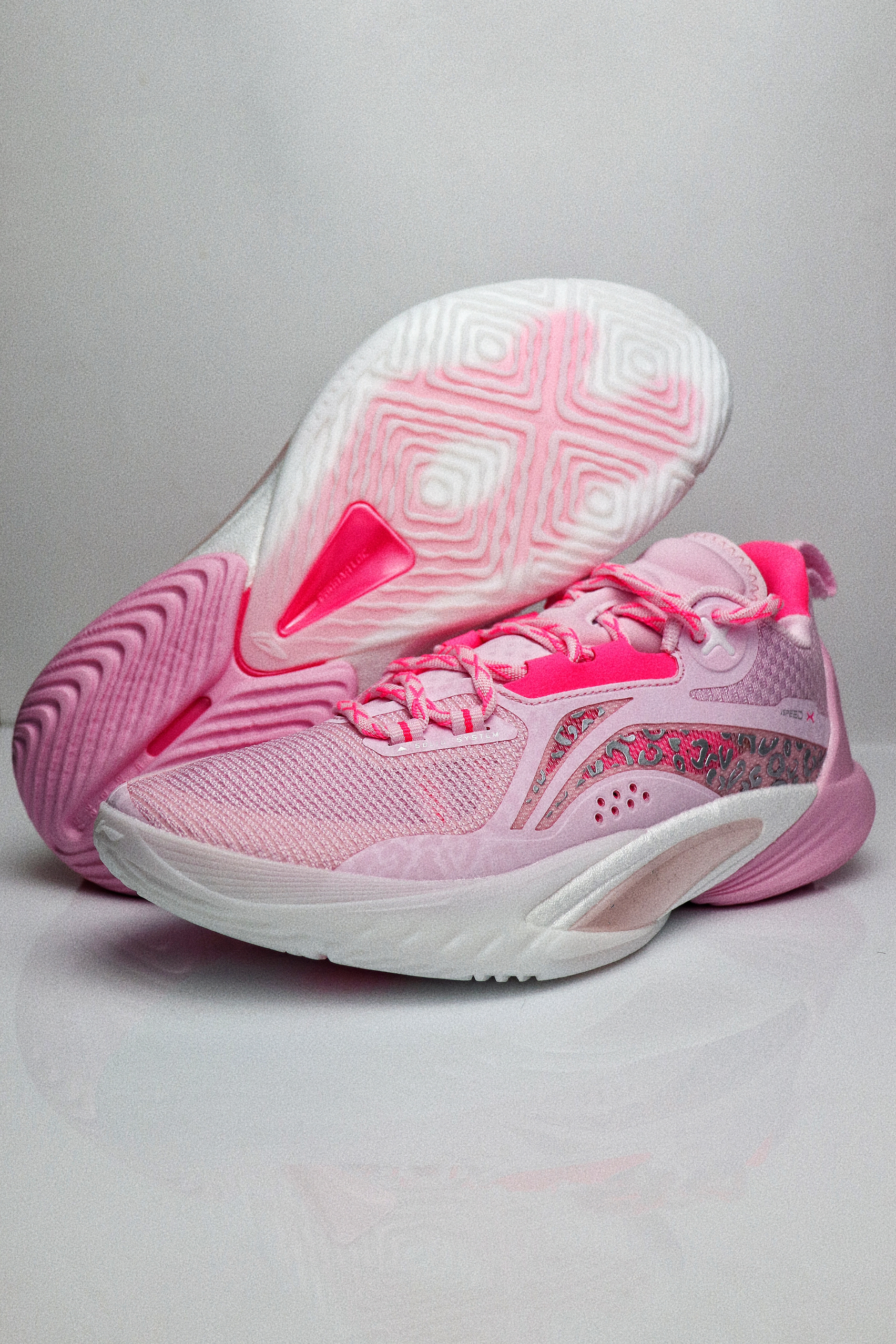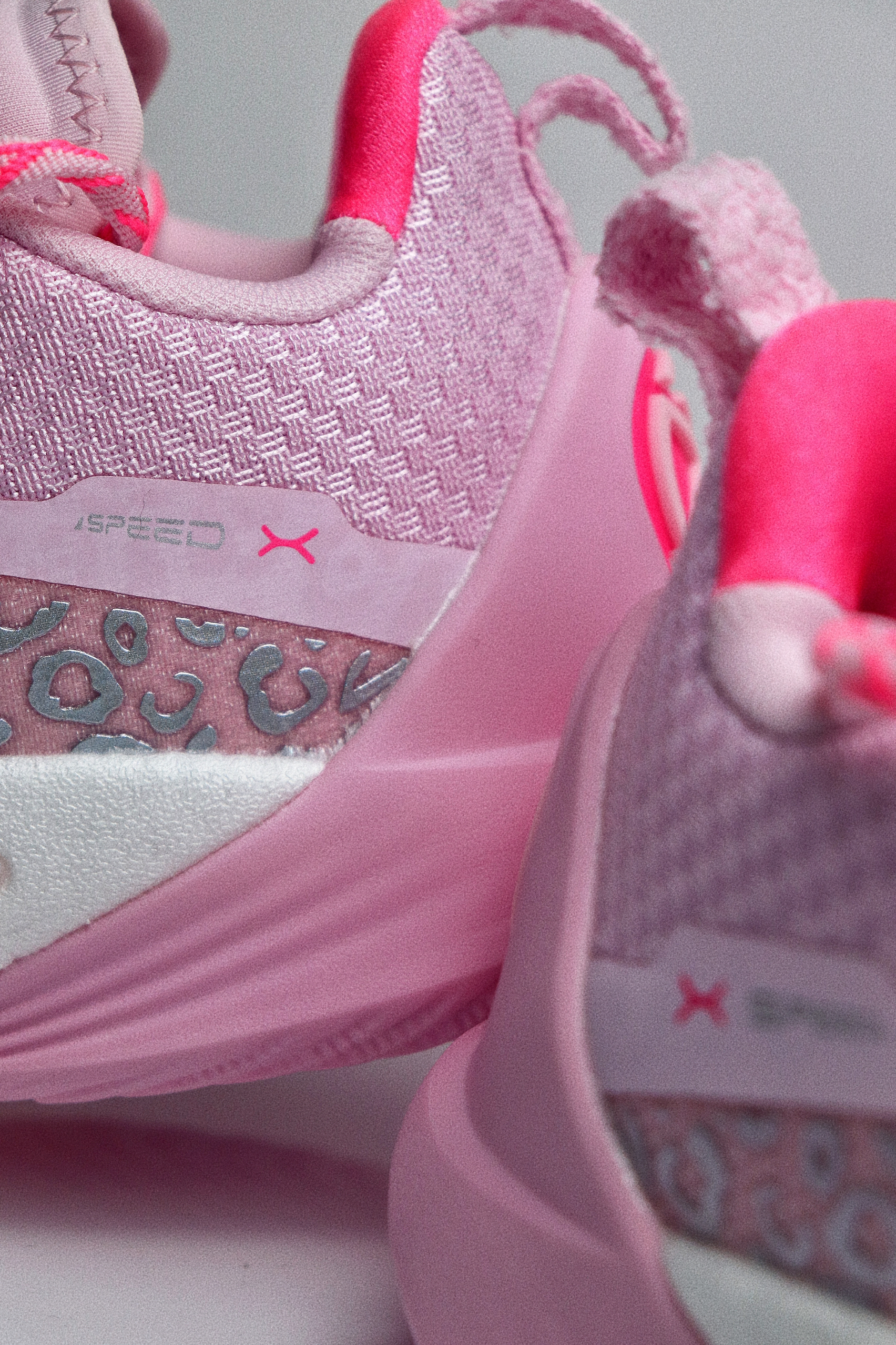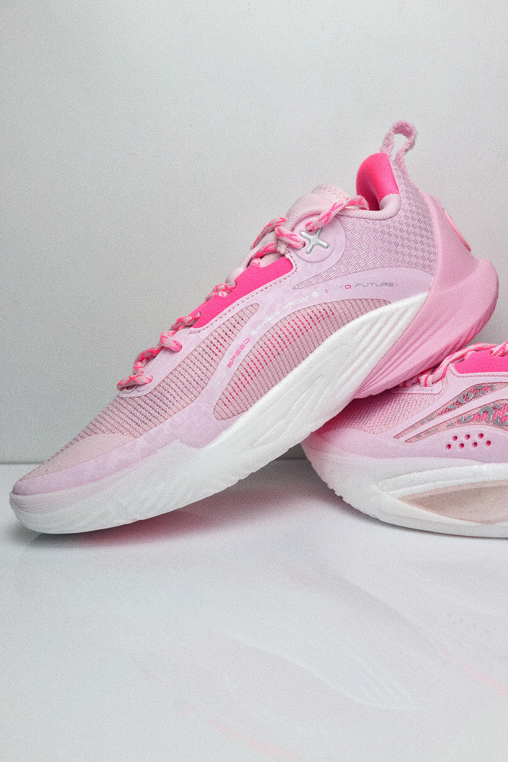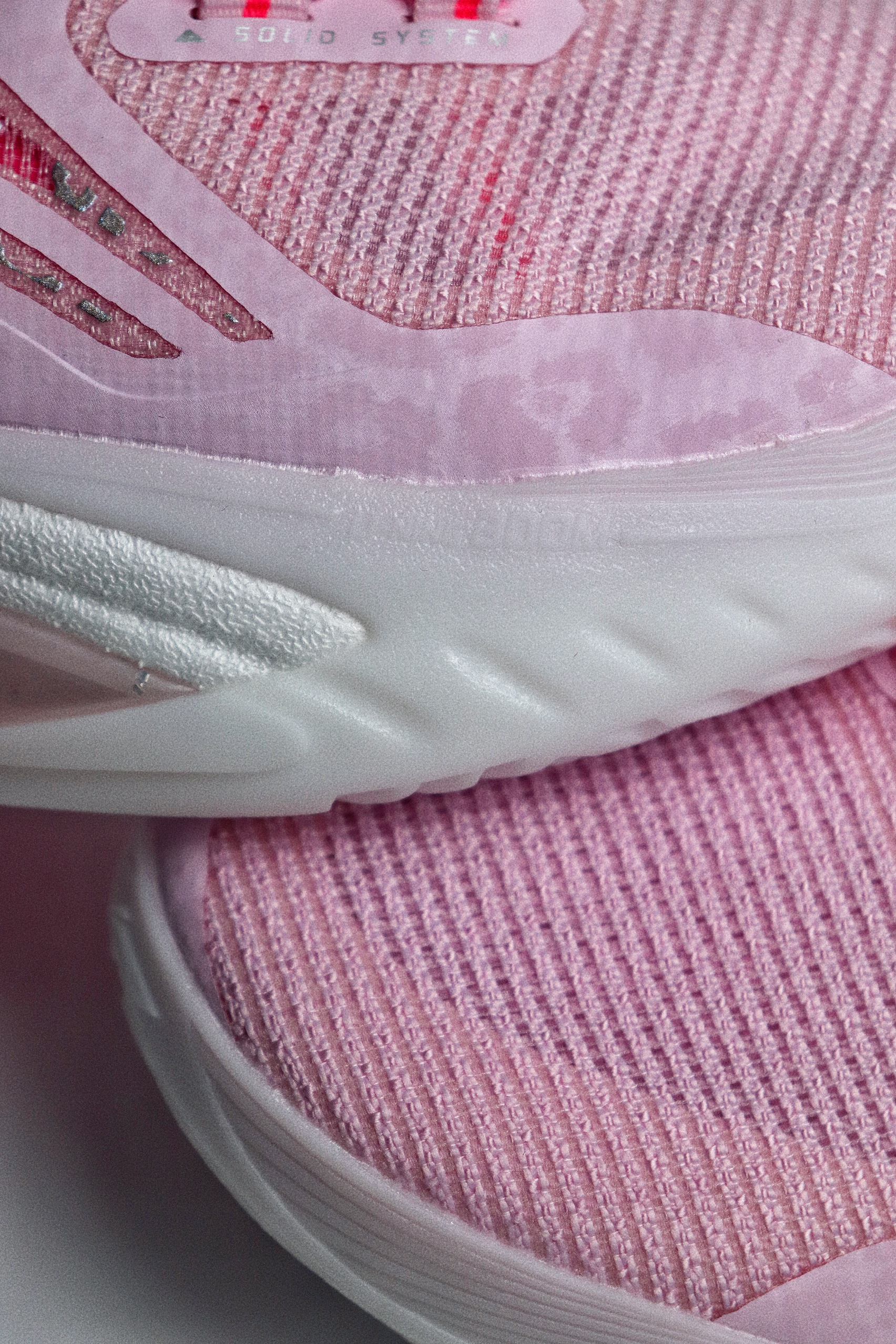 这双樱花粉配色的闪击10,单从颜值来看我是非常喜欢的,拿到手是非常粉嫩的,颜色很漂亮,侧面的流动感也比较强。鞋面采用工程纱织物加上多处热熔胶打造,指尖设计了额外的补强,鞋面内侧有一层垫布,所以和脚面的贴合感还是比较强的,整体的鞋面强度也比较到位。 后跟处有一块深粉色的猫舌布,搭配上内靴和动态绑缚系统,鞋子的包裹感是很强的。后跟的填充比较饱满,鞋舌处则是在几个受力点进行了针对性的填充,避免在运动过...