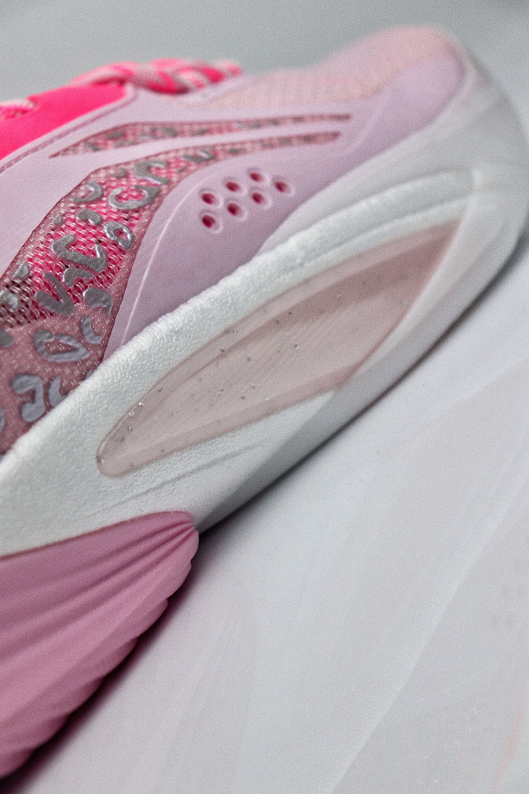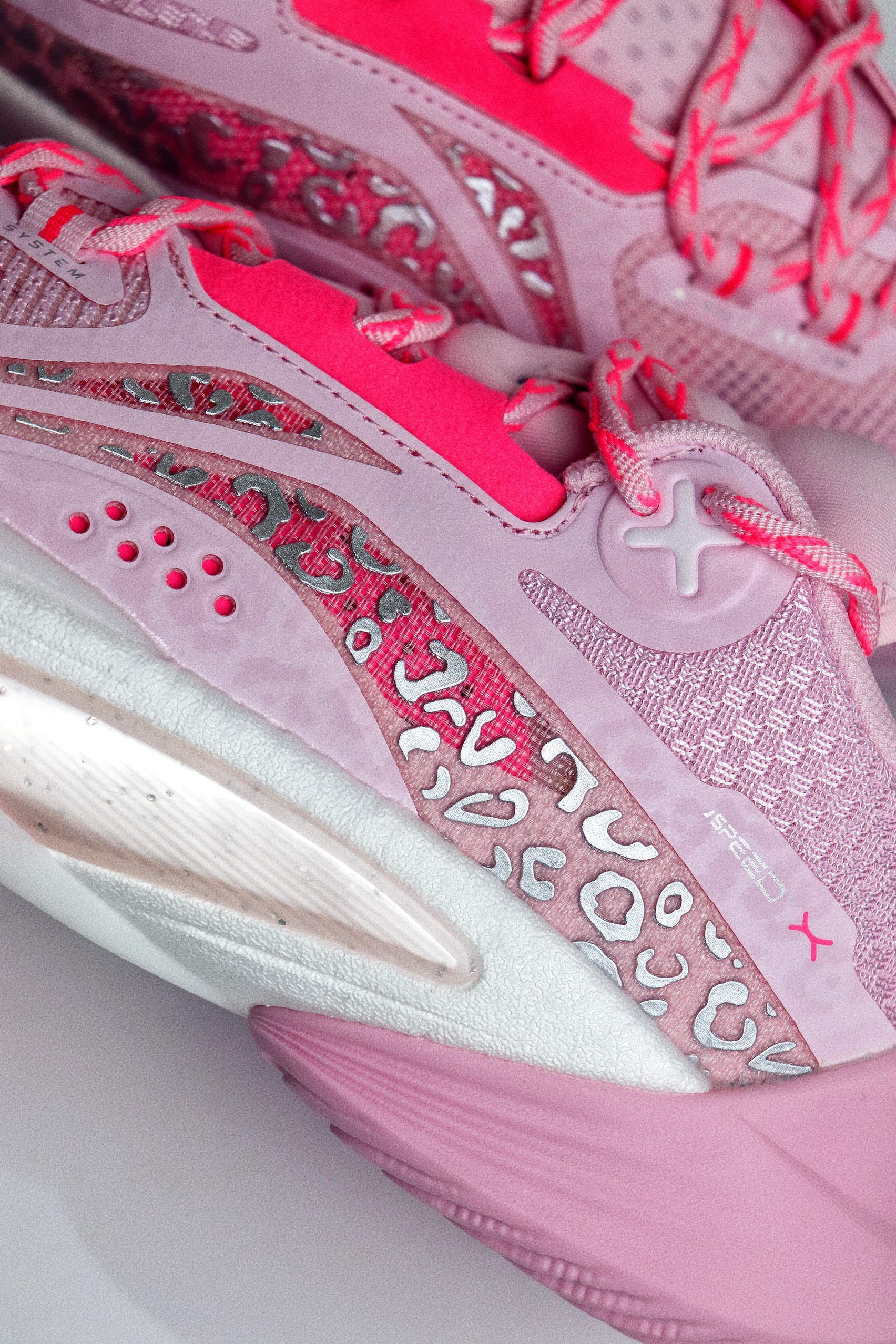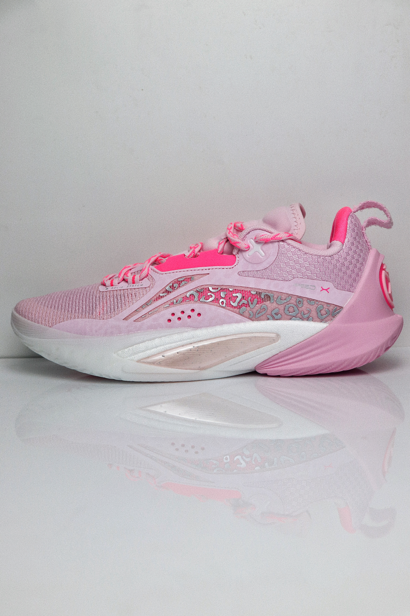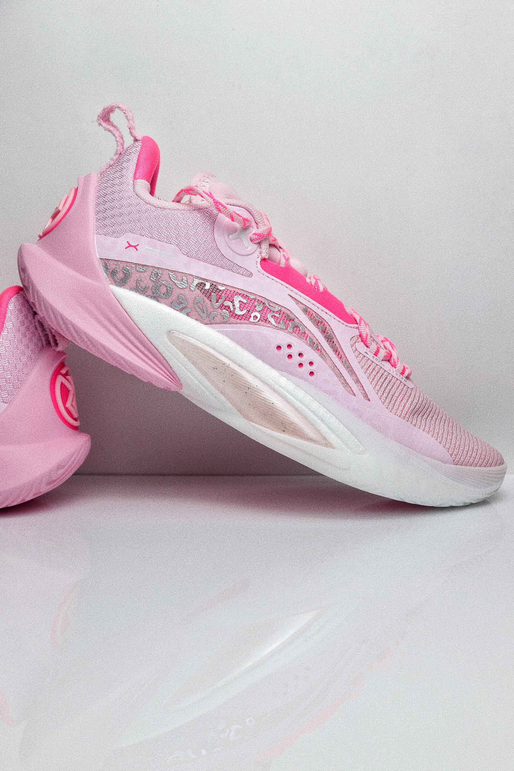 这双樱花粉配色的闪击10,单从颜值来看我是非常喜欢的,拿到手是非常粉嫩的,颜色很漂亮,侧面的流动感也比较强。鞋面采用工程纱织物加上多处热熔胶打造,指尖设计了额外的补强,鞋面内侧有一层垫布,所以和脚面的贴合感还是比较强的,整体的鞋面强度也比较到位。 后跟处有一块深粉色的猫舌布,搭配上内靴和动态绑缚系统,鞋子的包裹感是很强的。后跟的填充比较饱满,鞋舌处则是在几个受力点进行了针对性的填充,避免在运动过...