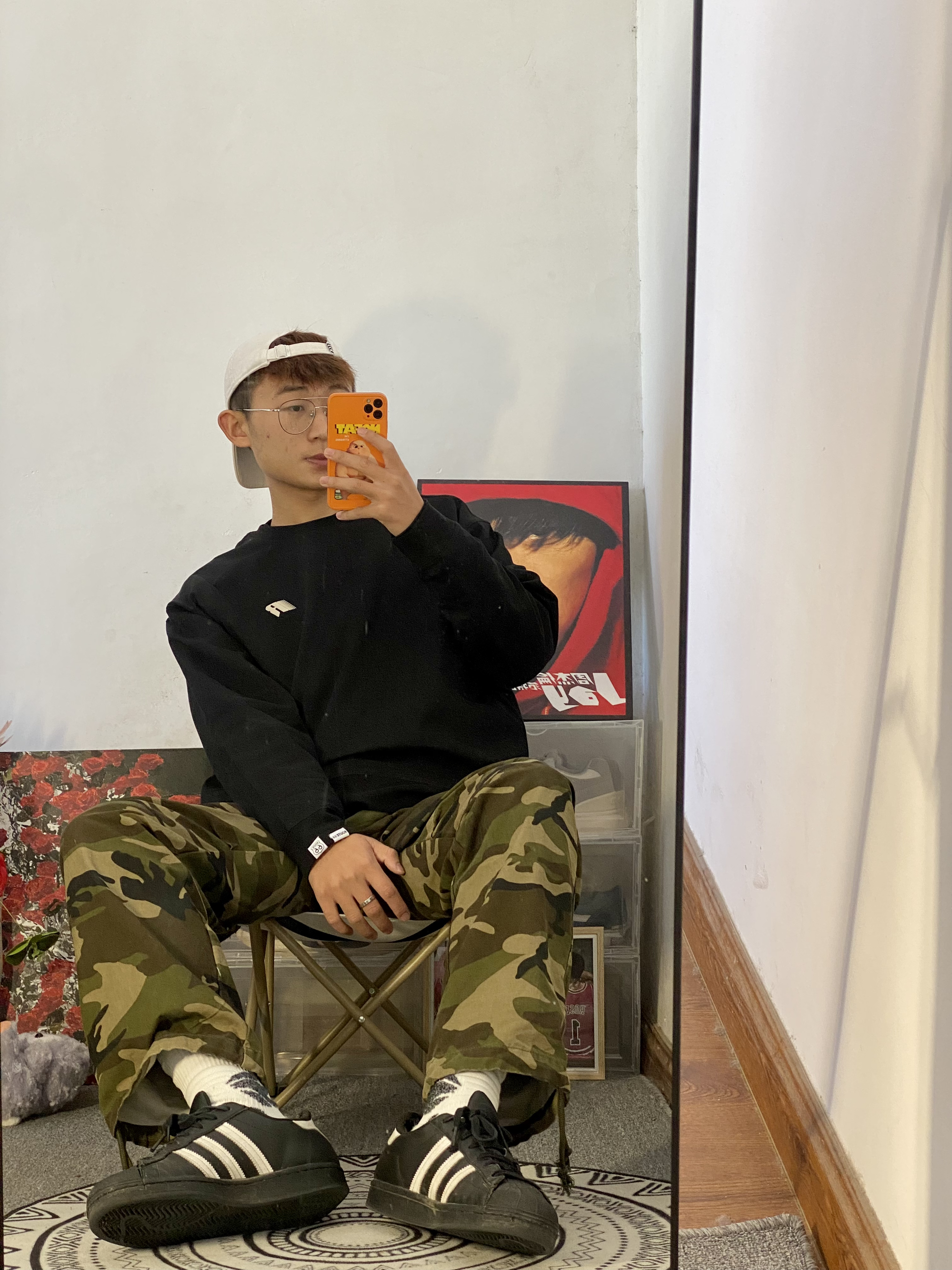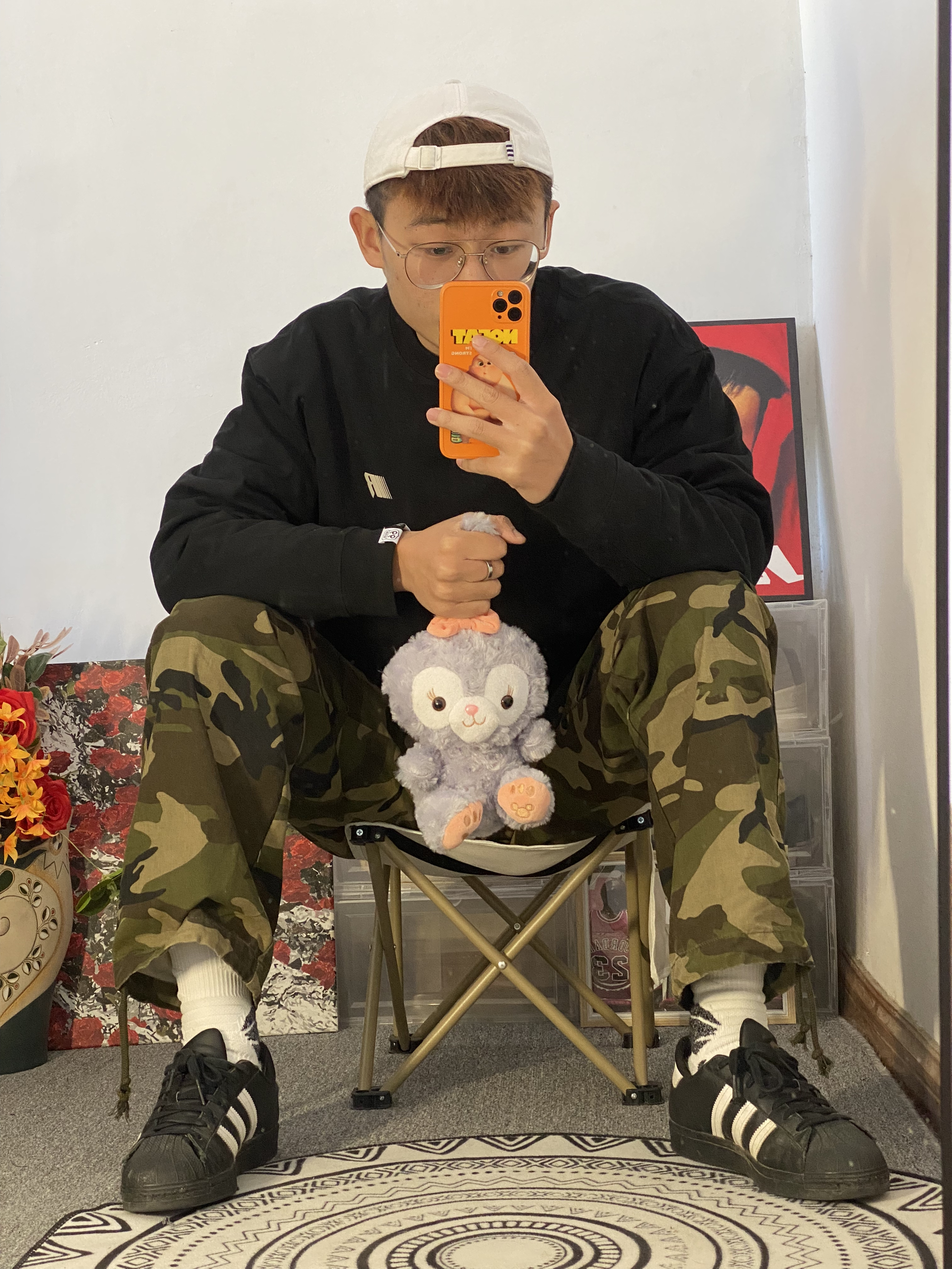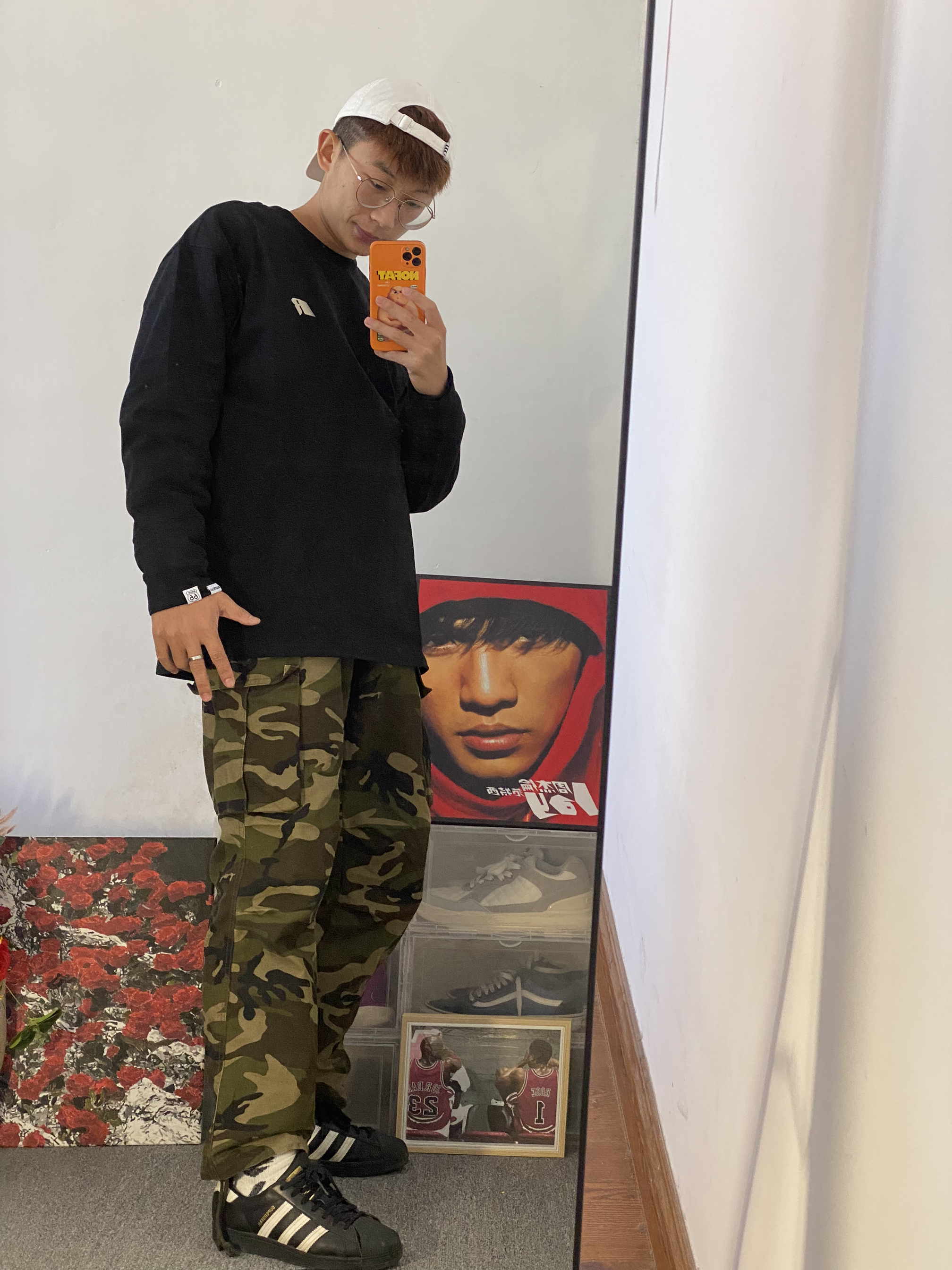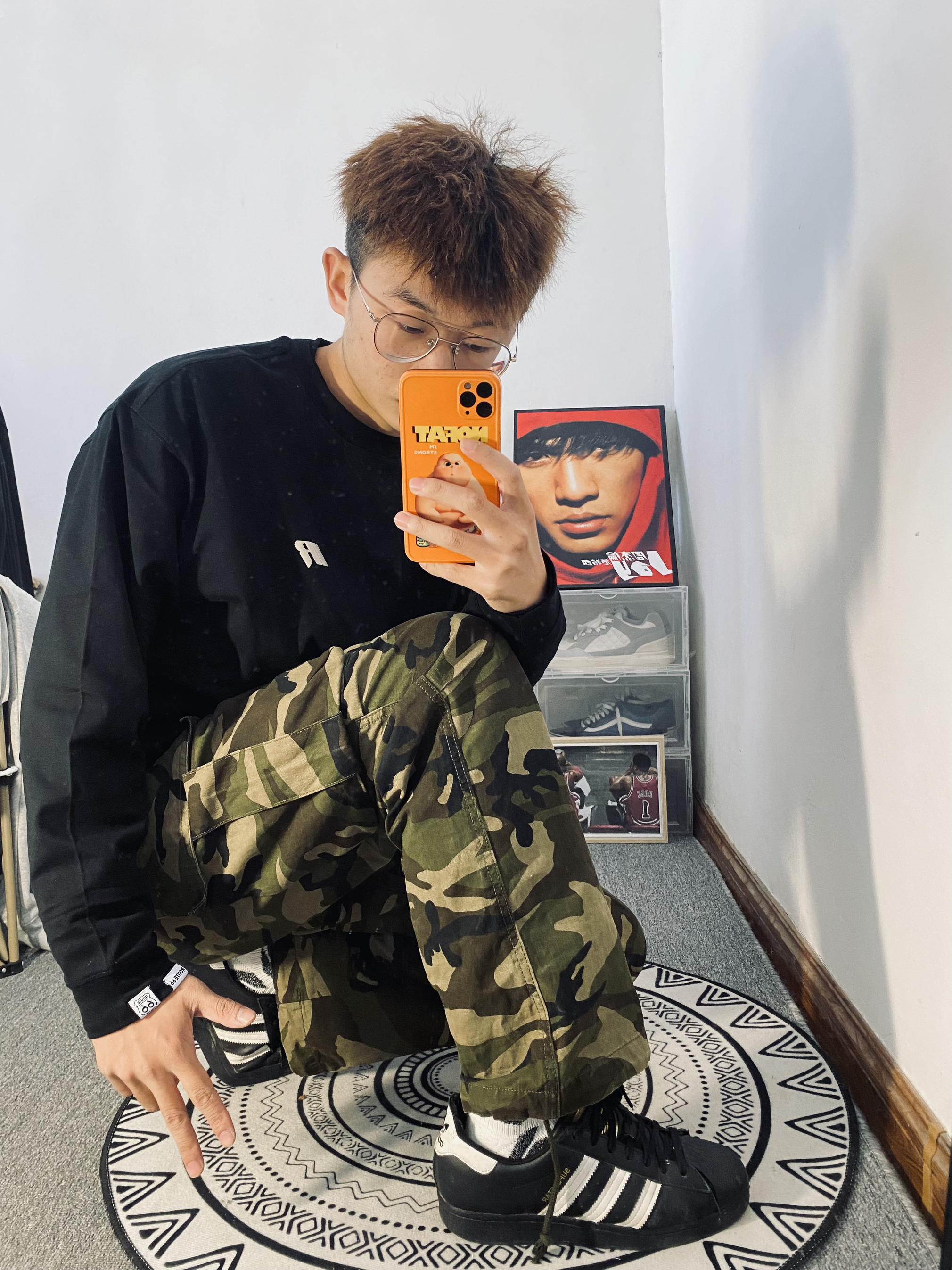 ‼️今日冰美式穿搭分享指南 👔今天上身了一件ROBUTE66家黑色美式圆领T恤 黑色百搭 纯正美式版型 天冷了我里面还搭了两件内搭也看不出来臃肿 — 👖裤子的话是一条美式复古迷彩裤 最喜欢他的宽松版型可以很好的修饰我的腿型😘 — 👟阿迪达斯 贝壳头 身高/体重:178/130 👔xl