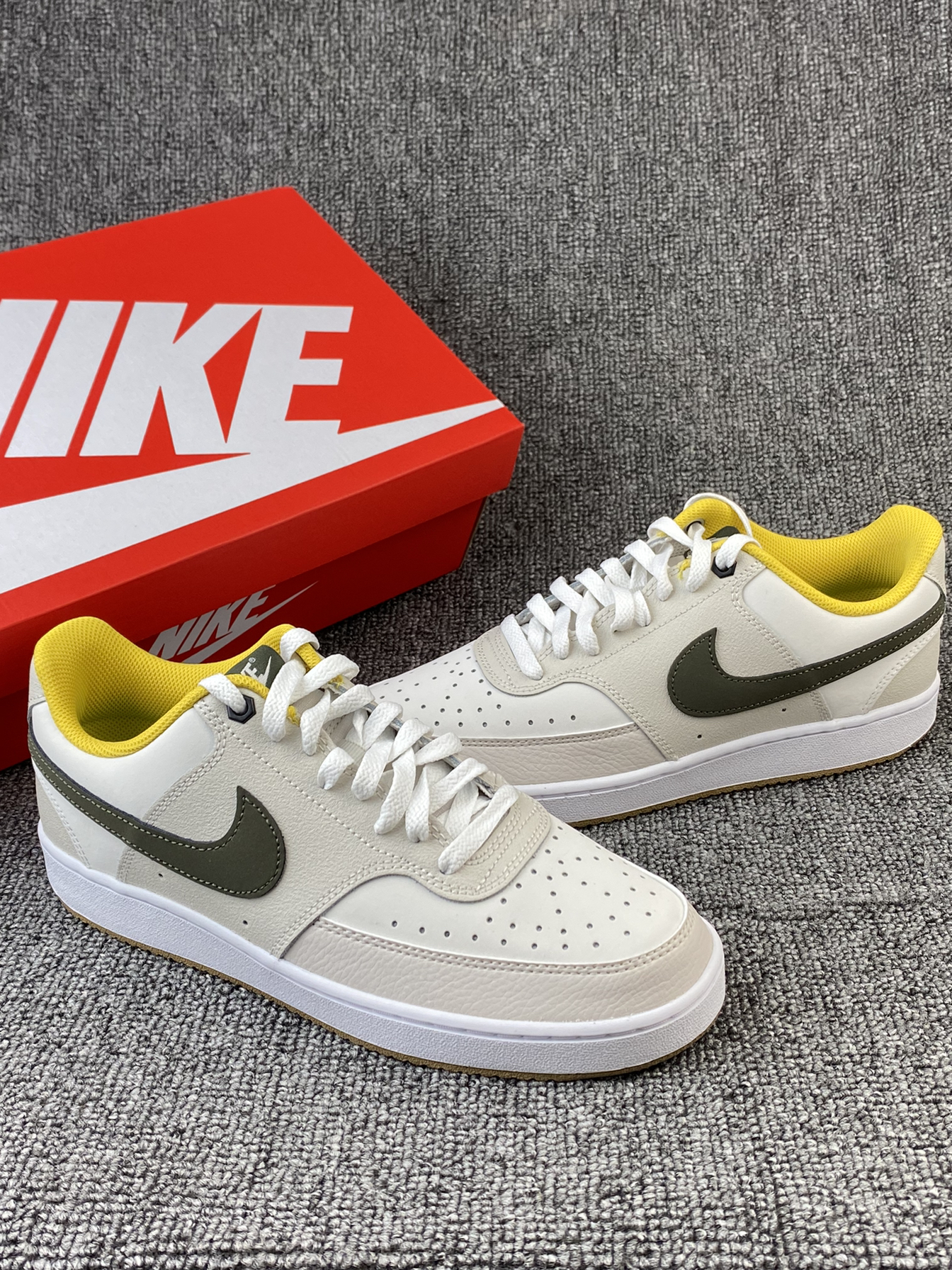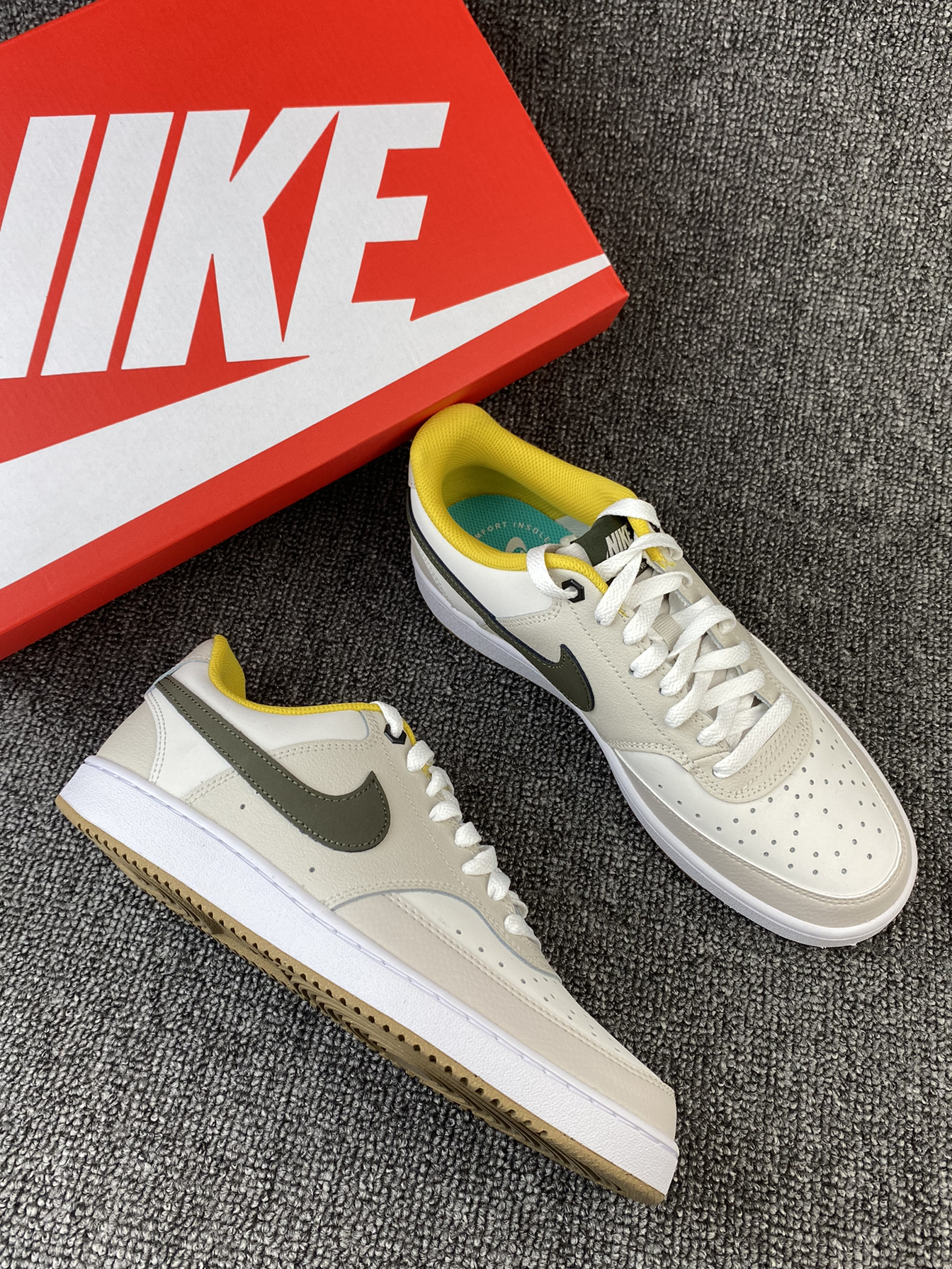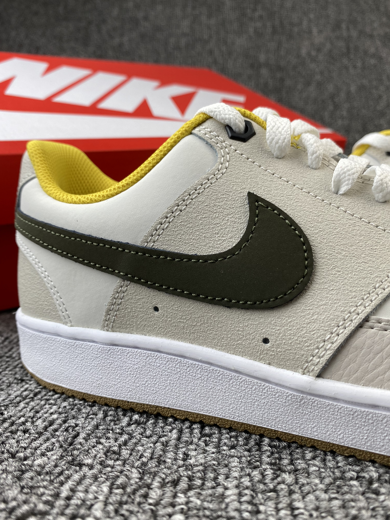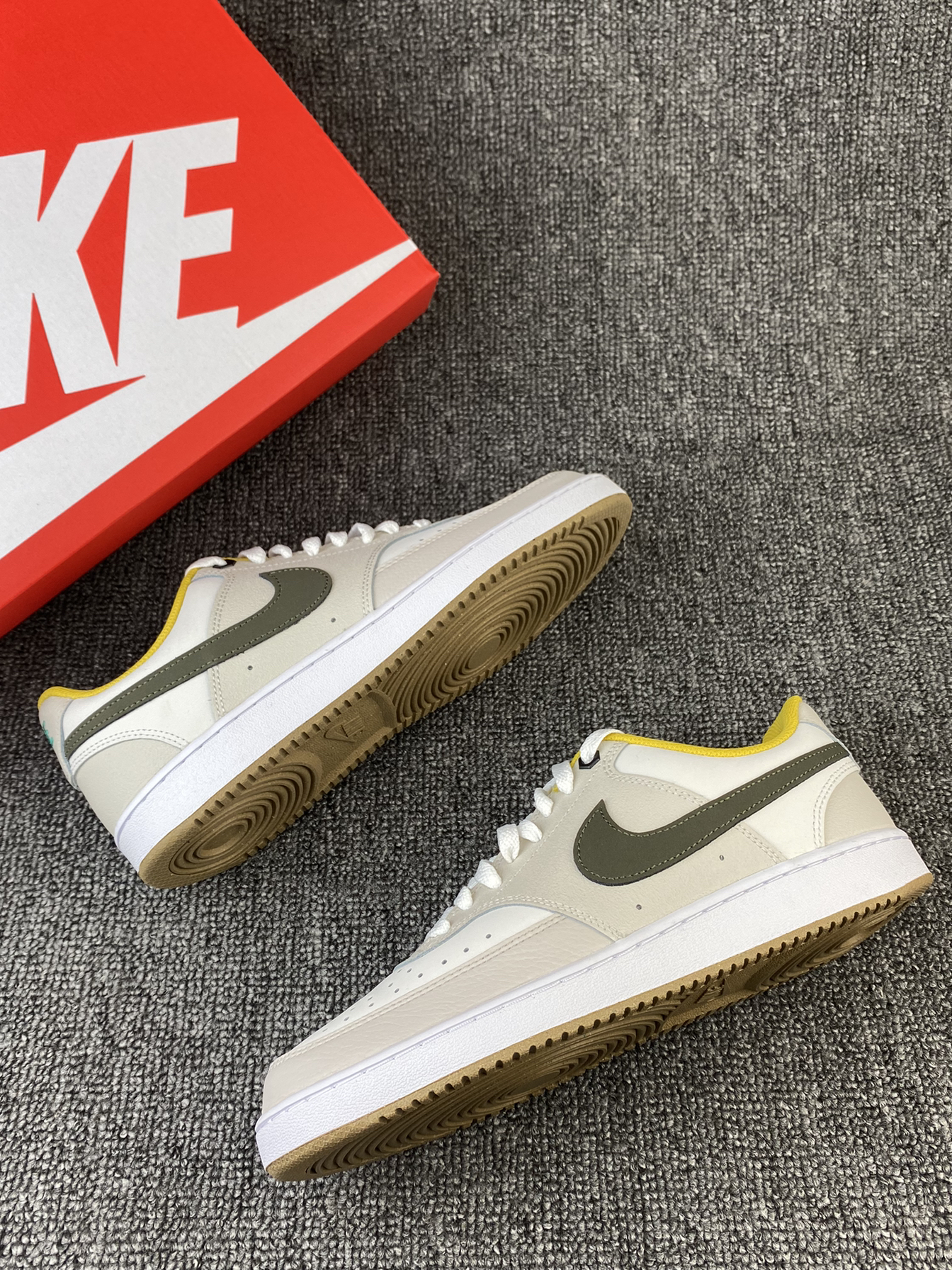 👟Nike Court Vision 板鞋 ✨Court系列真的是板鞋中的佼佼者了吧!这次的新配色依旧让我心动! 🌸鞋子整体以奶白色和浅灰色为主,鞋侧Swoosh以墨绿色点缀,同时黄色的内衬提升整体亮眼度,棕色大底收尾,整体复古又活力满满🥳平常搭配牛仔裤、休闲裤都很好看! 🤩另外鞋面是皮革材质,质感很好也很好打理,还是比较喜欢皮面的,脏了简单的湿巾纸擦拭就可以。低调又百搭的复古板鞋真的很爱!