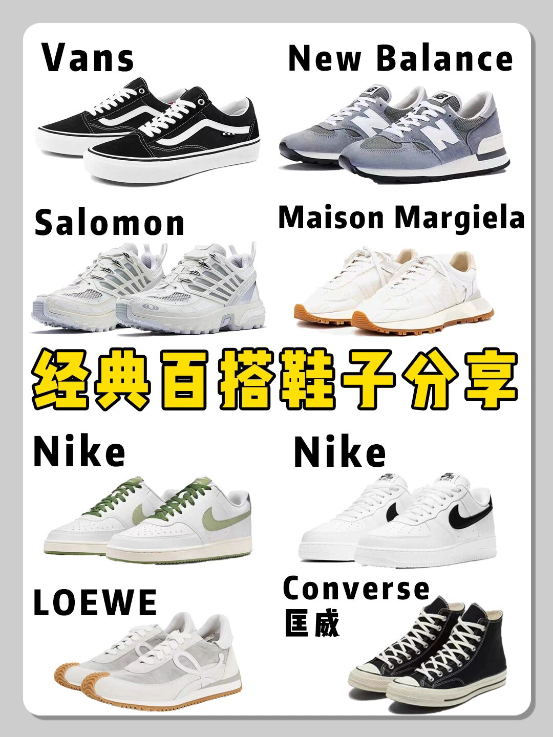 用心享受这座生活的游乐场塞,👟鞋子心会帮你记录每一步,百搭好穿的鞋子可以让我们的生活状态展现更自在,这几双回头率爆表的鞋子今天就推荐给大家,不分男女款的鞋子,穿上都好看。 1⃣:Vans Old Skool 经典款 2⃣:New Balance 990v1 3⃣:Nike COURT VISION 4⃣:Salomon 5⃣:LOEWE 6⃣:Maison Margiela 7⃣:CONVERS...