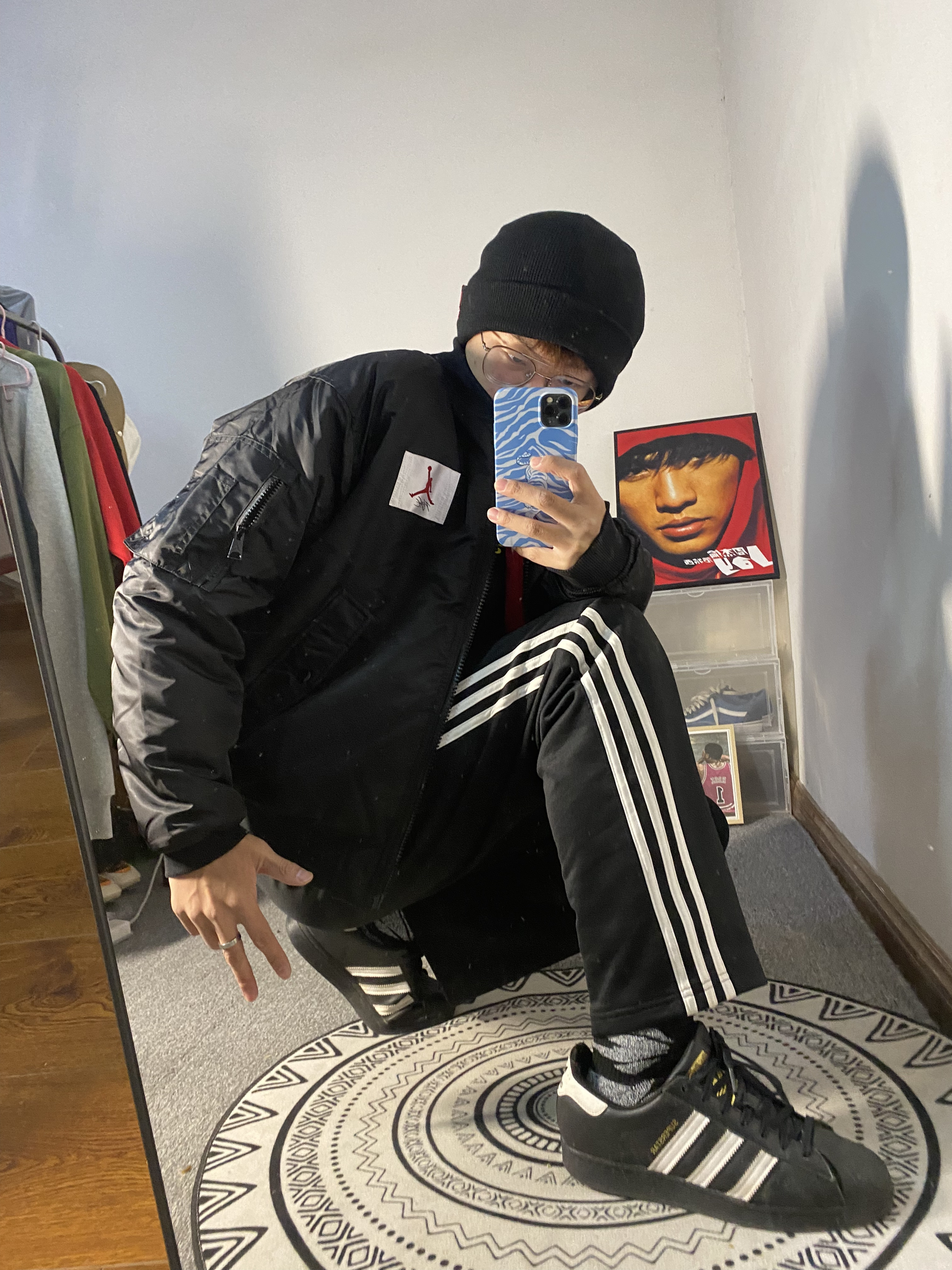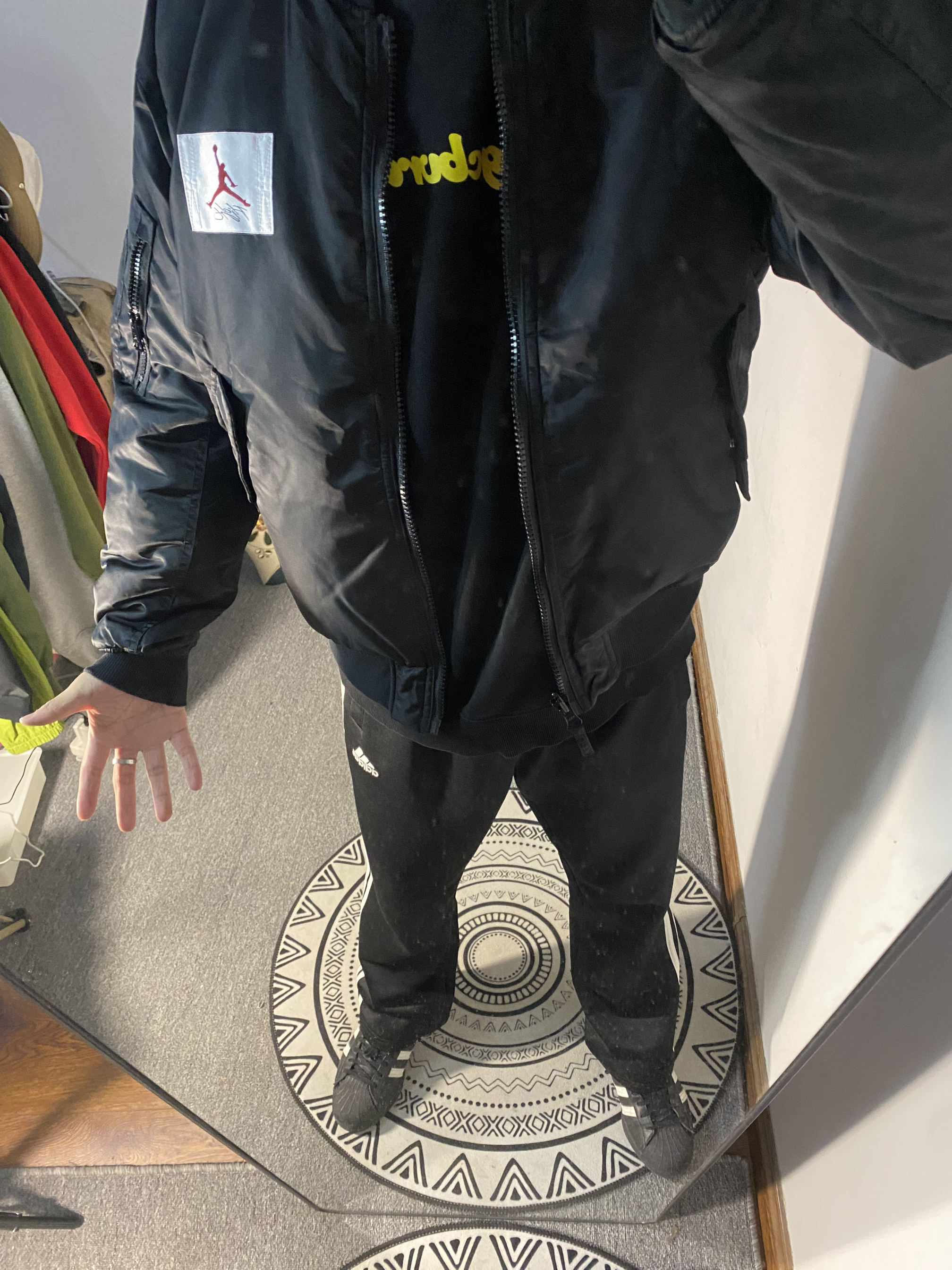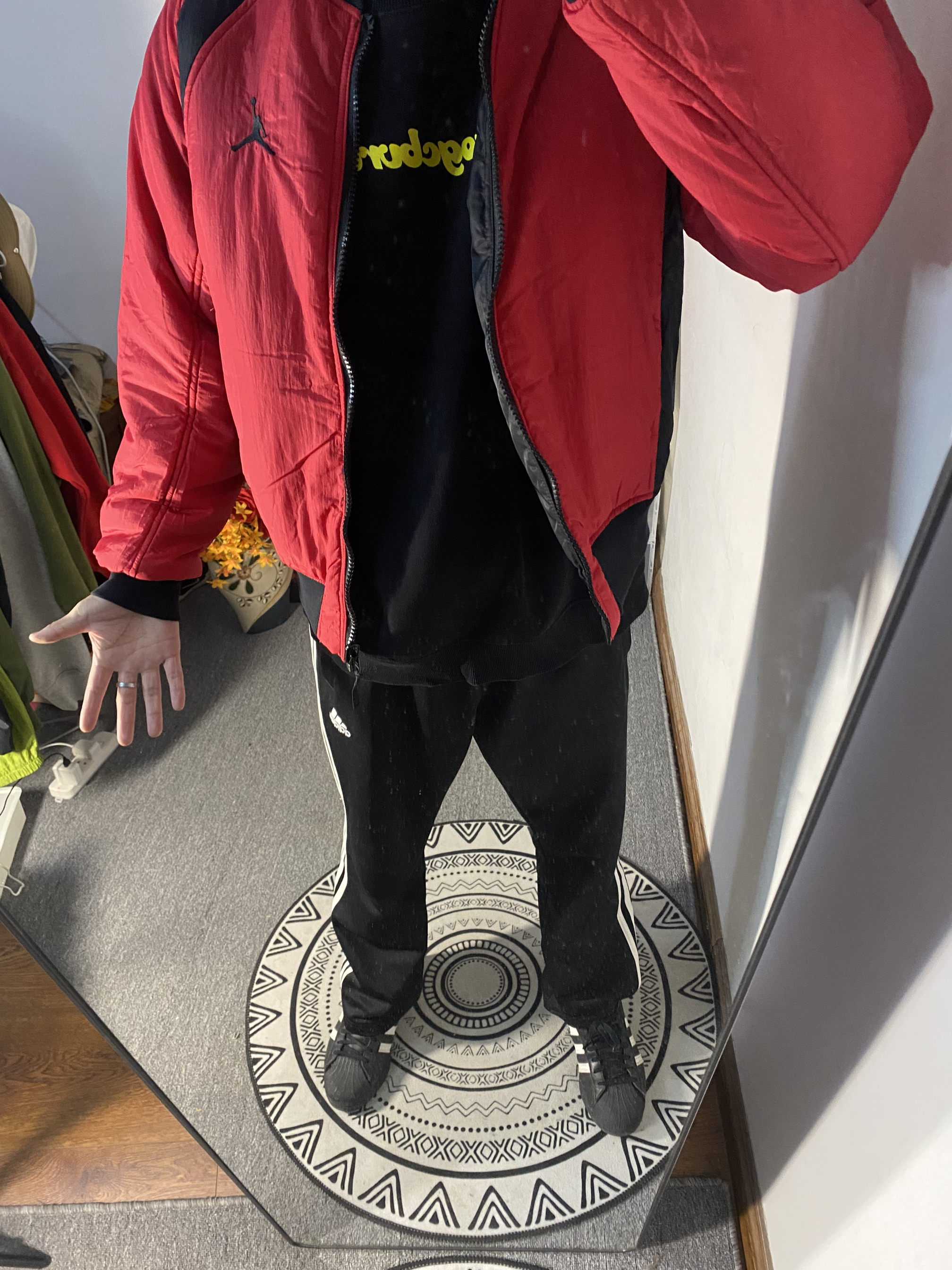👔乔丹黑色棒球服 版型偏小建议买大一码 两面穿 配色 不过还是黑色更好看一点 — 👖阿迪达斯直筒裤 不是束脚的版型 穿起来挺舒服 的透气性不錯 — 👟阿迪达斯 贝壳头经典百搭 身高/体重:178/130 👔XL