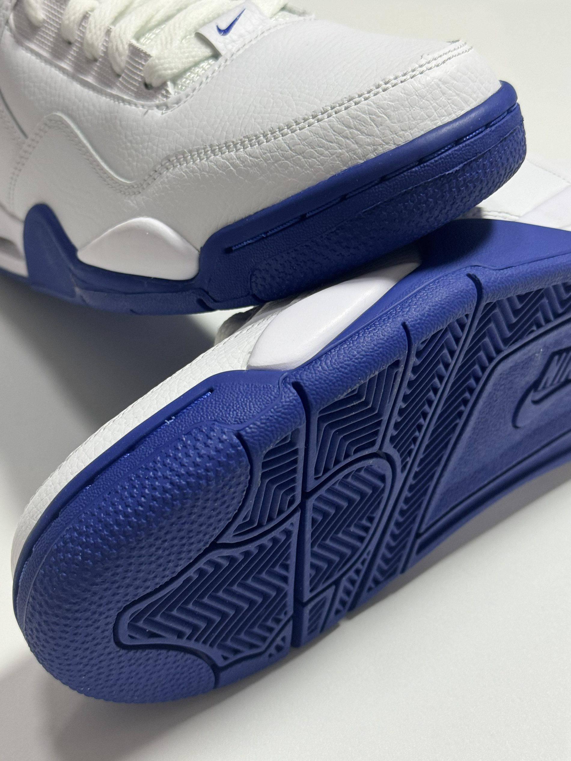 halo 阿迪来了,本期和大家分享的潮鞋是这双最近入手的nike flight Legacy白蓝! 鞋面主体采用白色荔枝纹皮革打造,以标志性的蓝色和白色点缀,确实颇有肯塔基的感觉。 另外流线型造型,蓝色的一体性很强,这个造型我很喜欢。 这款鞋其实跟AJ4很像,所以很多人也叫它AJ4兄弟款。比较一下,确实有异曲同工的感觉。特别是鞋底中部隆起的弧线与鞋面拼接的造型,实在是太像了! 但鞋后部的耐克log...