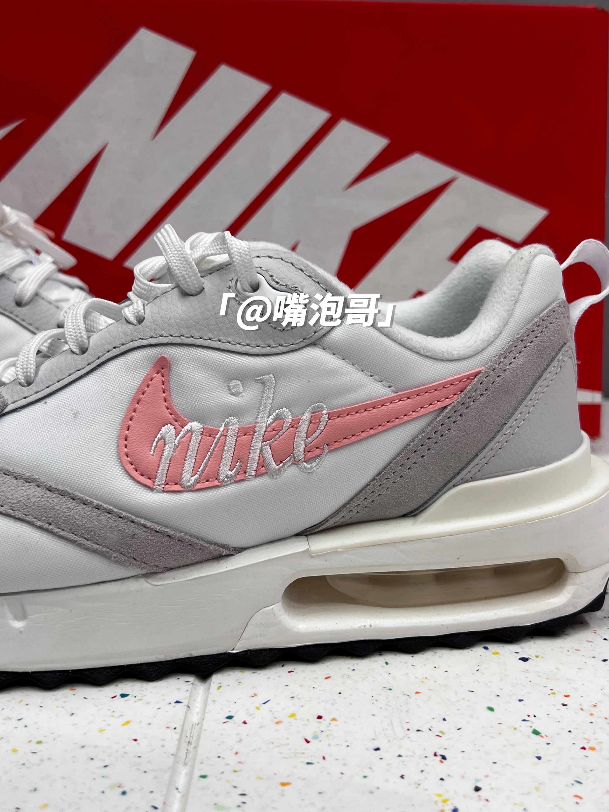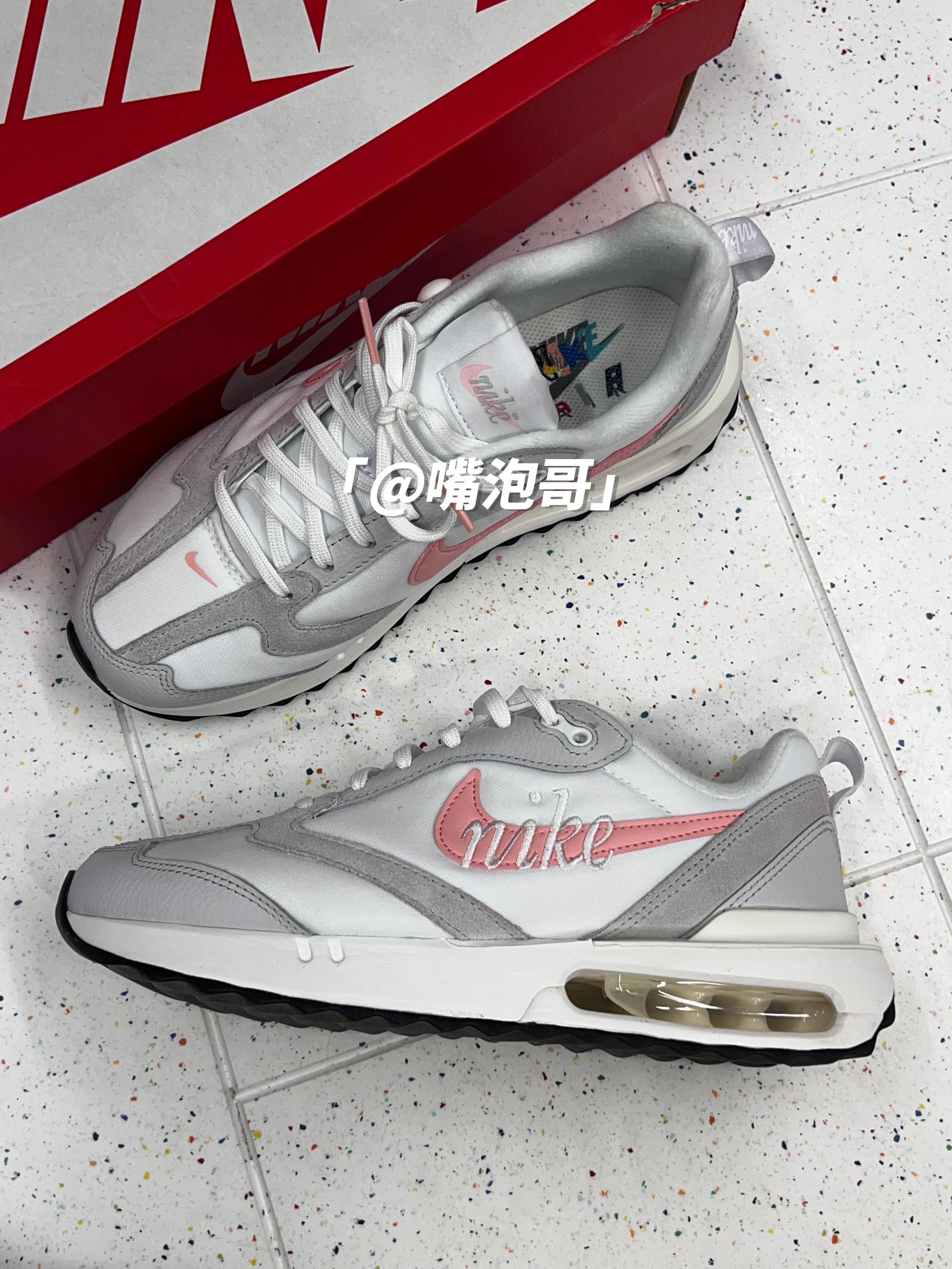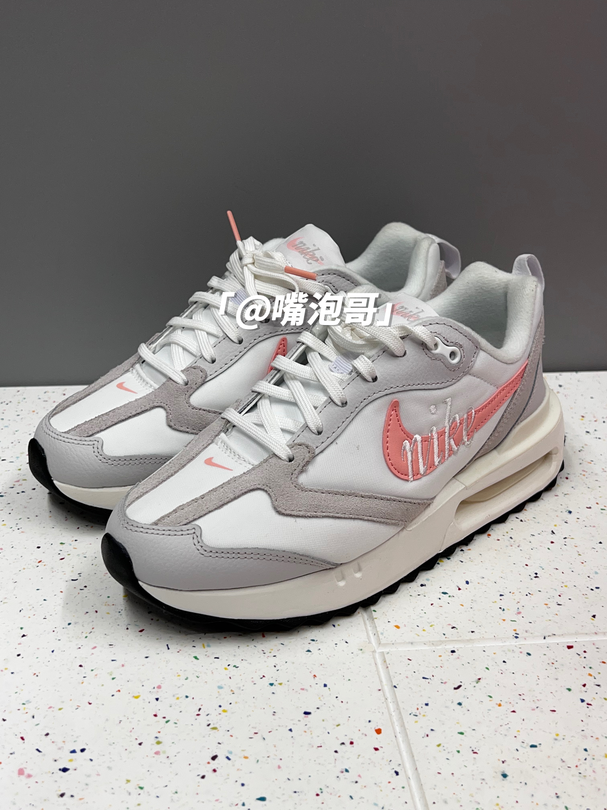 👟:Air Max Dawn 灰白色 简介: 鞋款是一双Air Max系列的休闲鞋,鞋子整体采用了白色与灰色的组合作为主色调,在日常穿搭中更易搭配,细节处加入了粉色、米色进行装饰,轻质的复合织物鞋面搭配上双缓震科技中底,使鞋子上脚有着良好的脚感。 细节: 鞋面使用了灰色麂皮与白色织物布叠加而成,不仅使鞋面具有良好的透气性及耐磨性,同时也是丰富了鞋面的层次感,鞋身两侧的swoosh选用粉...