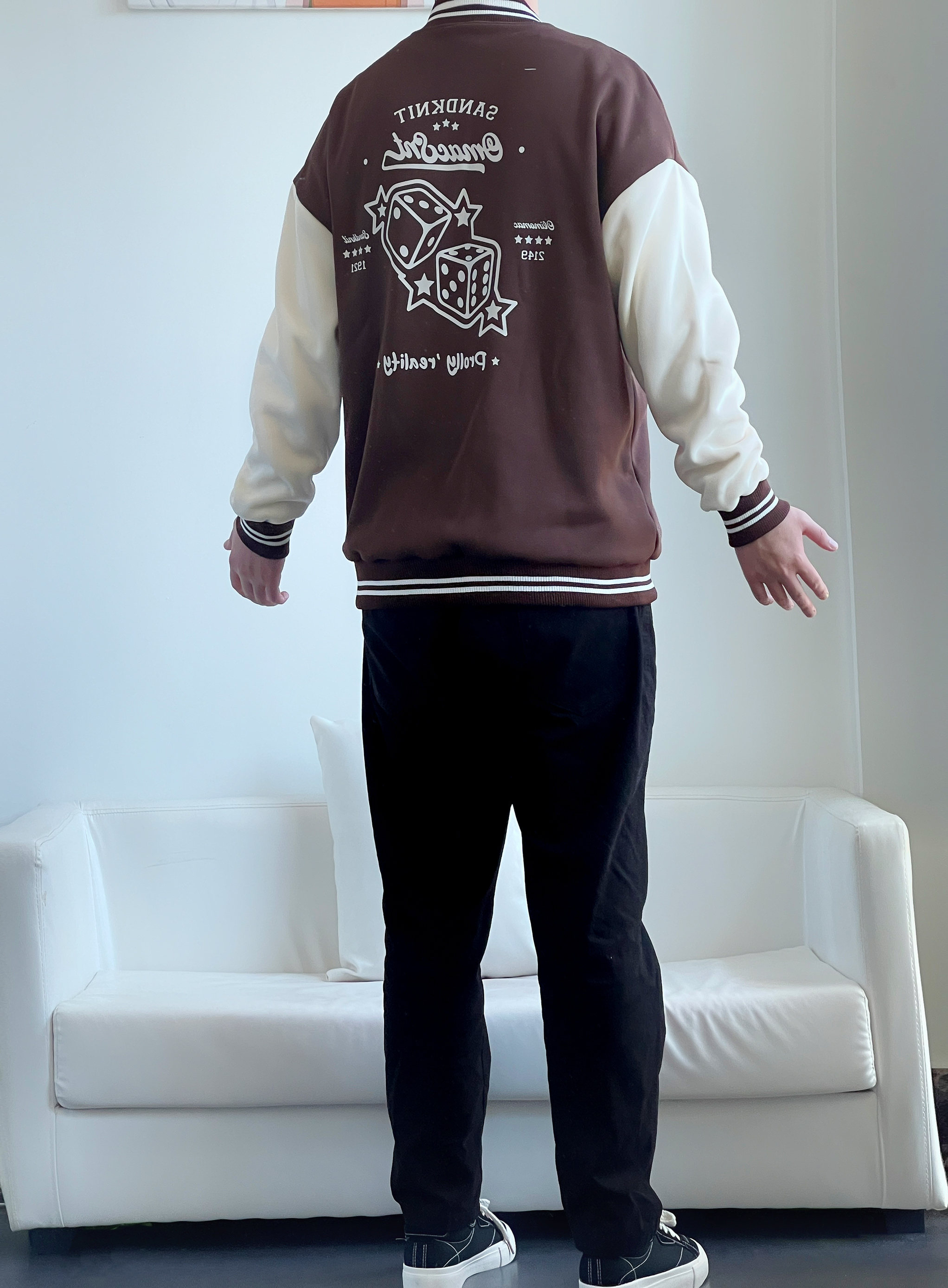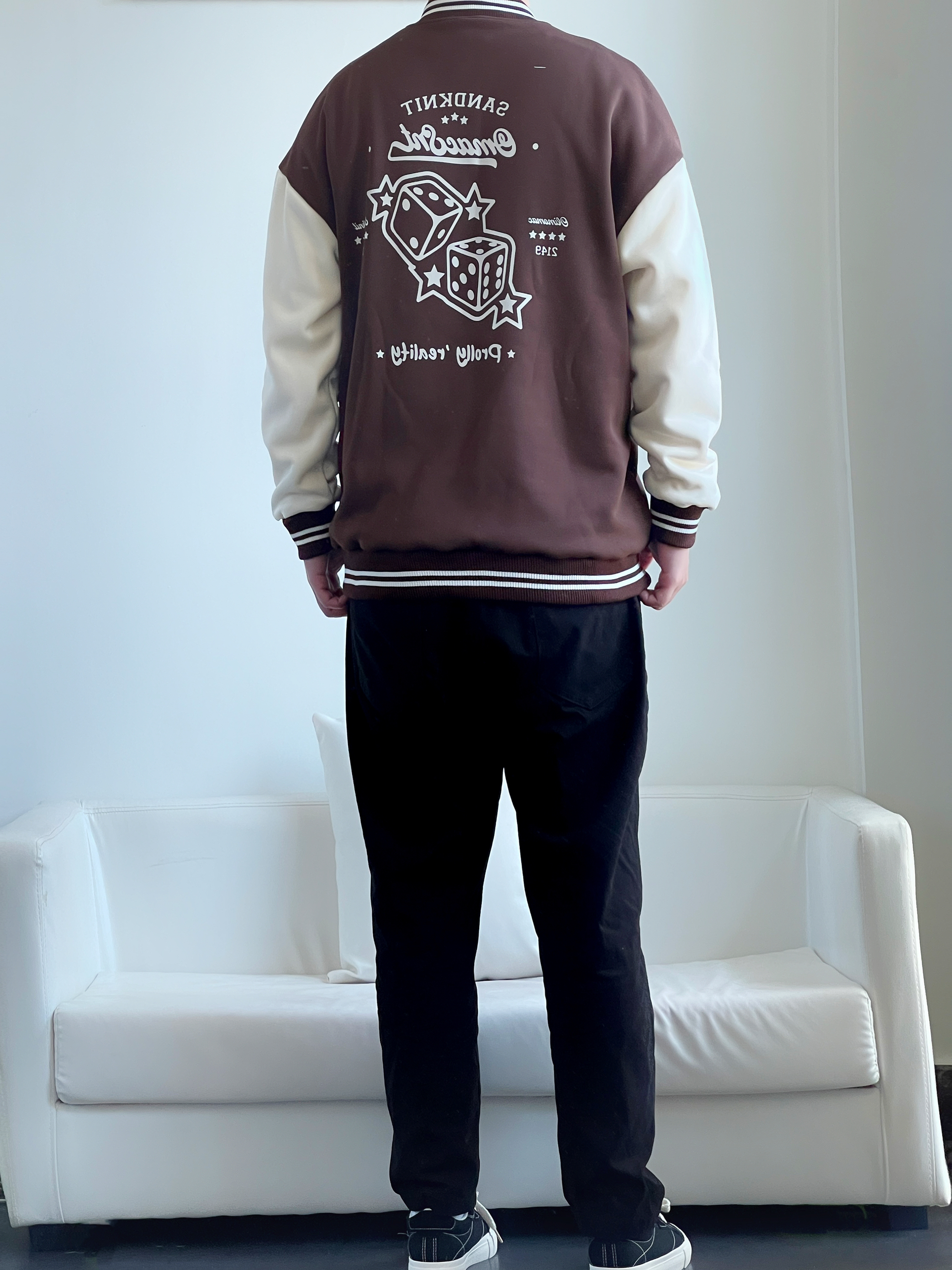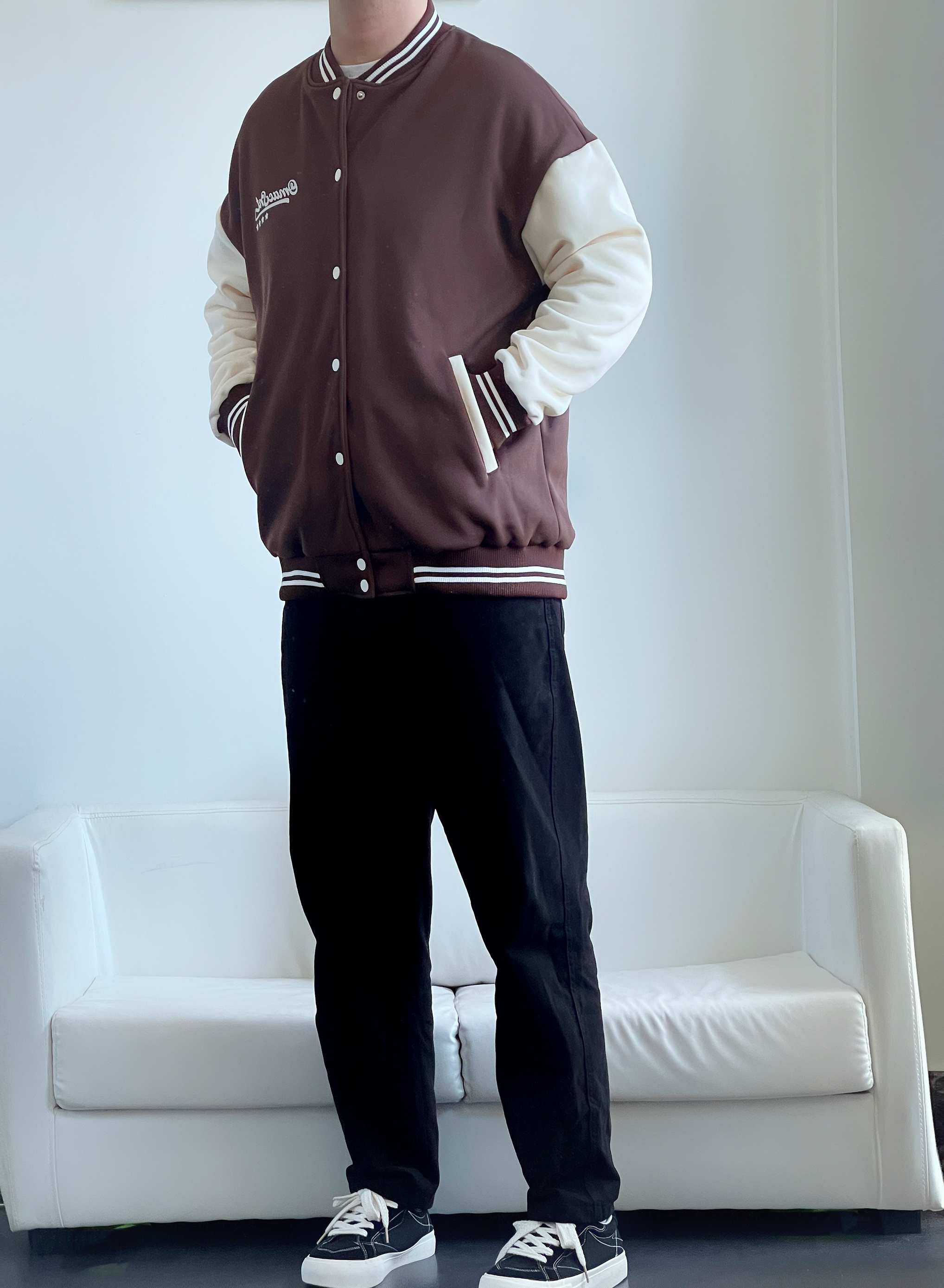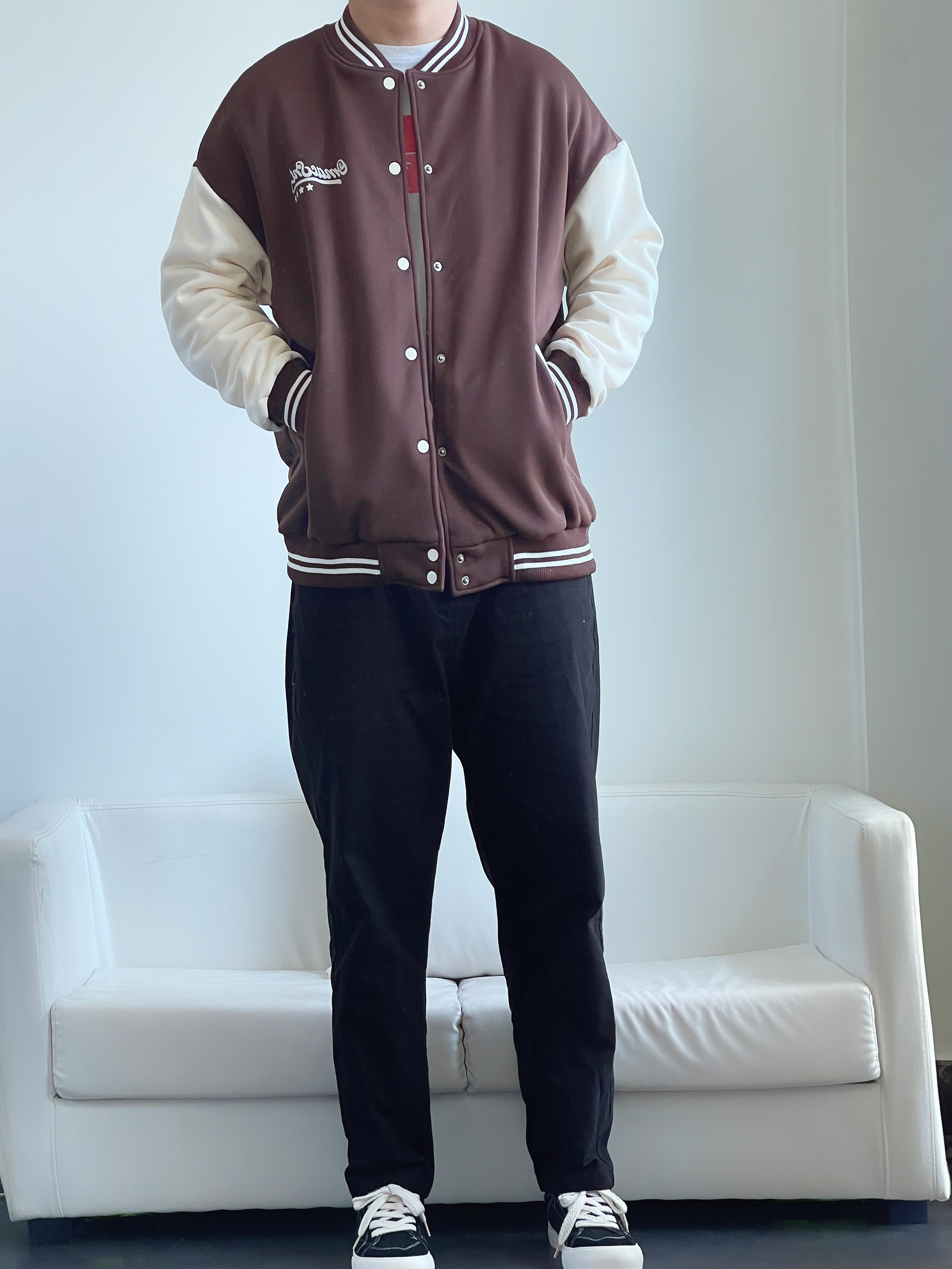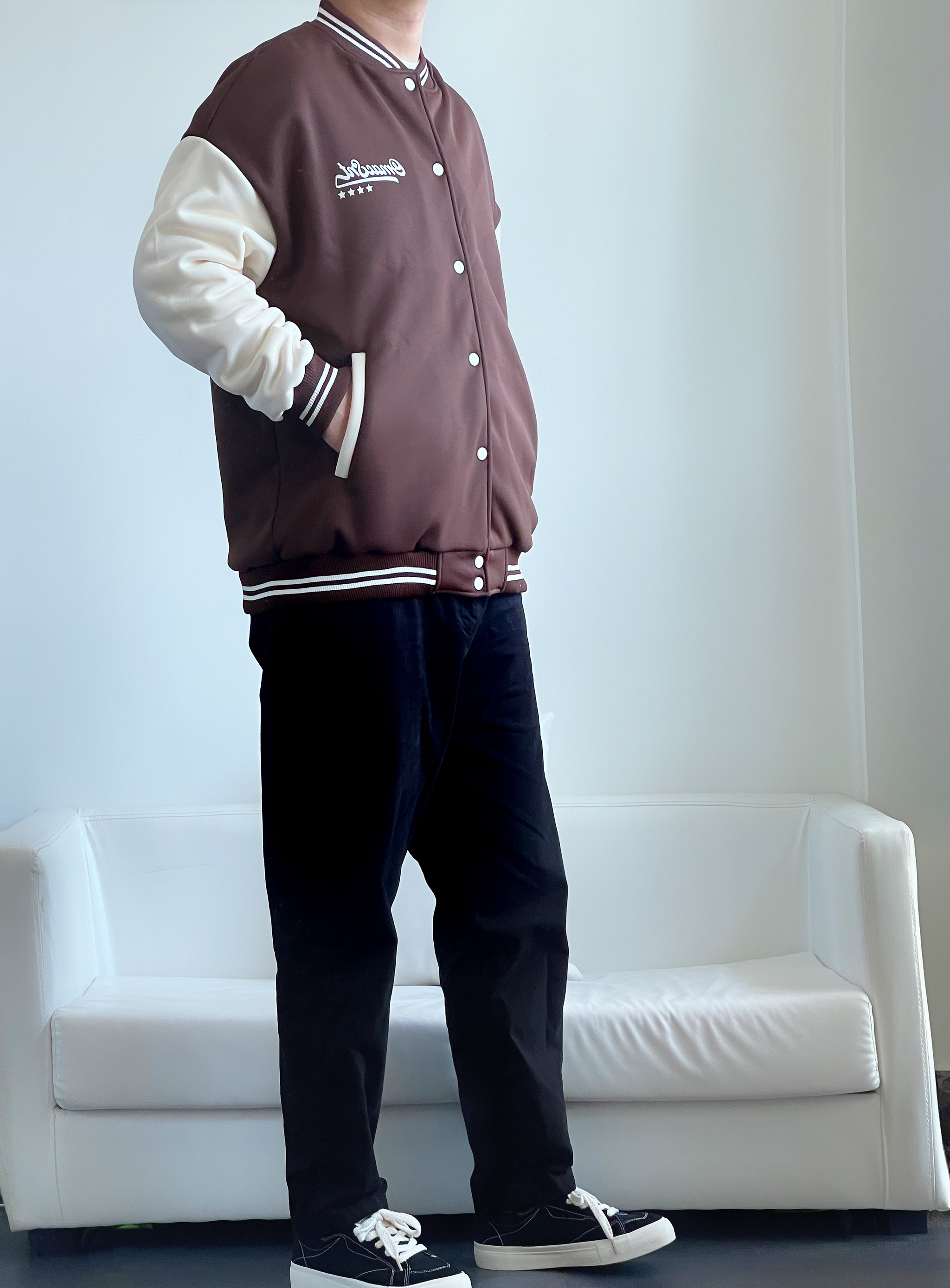 棕色系棒球服怎么都穿不腻~ 简直就是把秋天🍂穿在身上 咖啡奶白拼色 质感版型都很🉑️ 内里可以搭配T恤或者卫衣 南方过冬完全没问题👌🏻 下身搭配经典黑色直筒裤 显瘦百搭没谁了 这么一套穿搭 简单干净又耐看🤟 🙋♂️身高丨体重丨尺码 : 178丨90kg丨XL