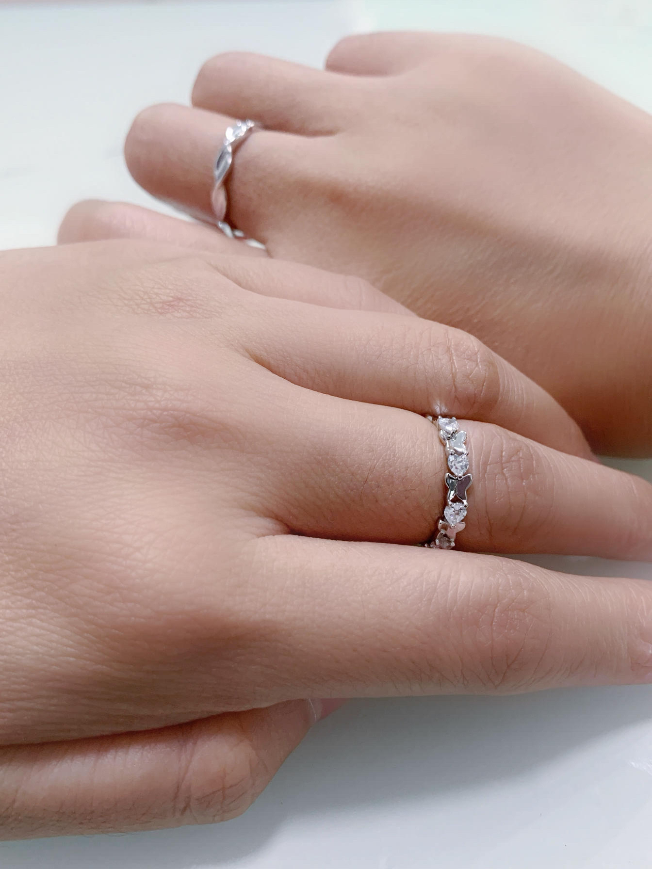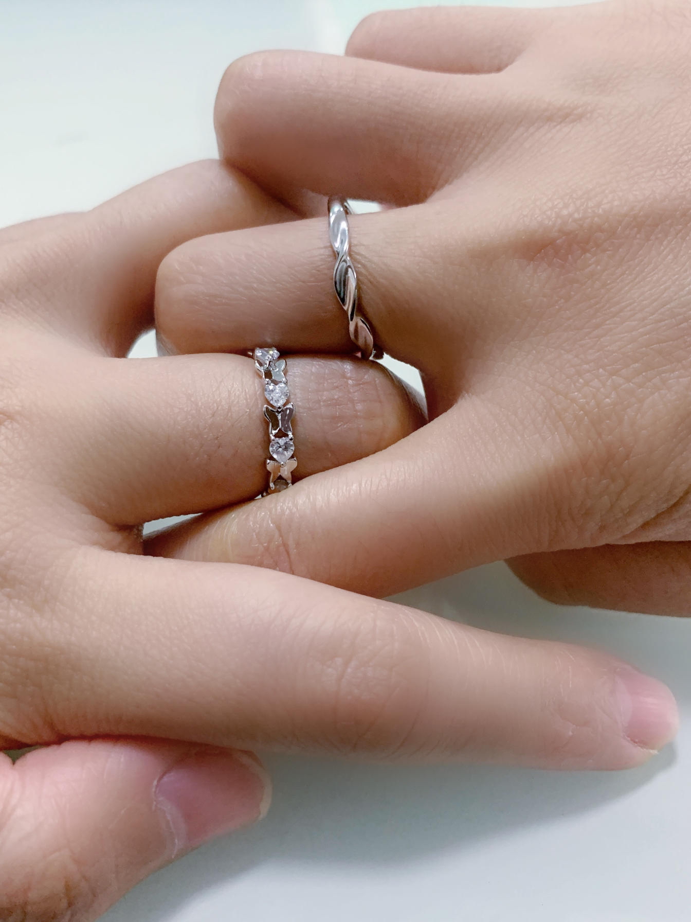 和男朋友恋爱2年了,他比我大5岁,在生活中他常常让着我,有时候我们也会吵架、拌嘴,但是一路走来,我们还是凭借对彼此的包容走到了现在,平时过节他总是转账和送口红,我总埋怨他不够浪漫! 这次要双十一了,正当我猜测男朋友是不是又要送我口红时,我居然收到了他送的这款戒指💍,戒指是s925纯银材质,戴着不掉色,也不过敏。 女戒上有几颗蝴蝶吊坠🦋,戒指上还镶嵌了几颗闪闪的钻石💎bulingbuling的 男戒...