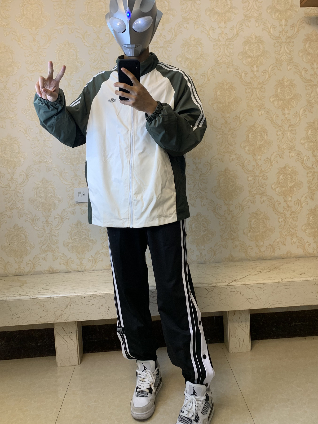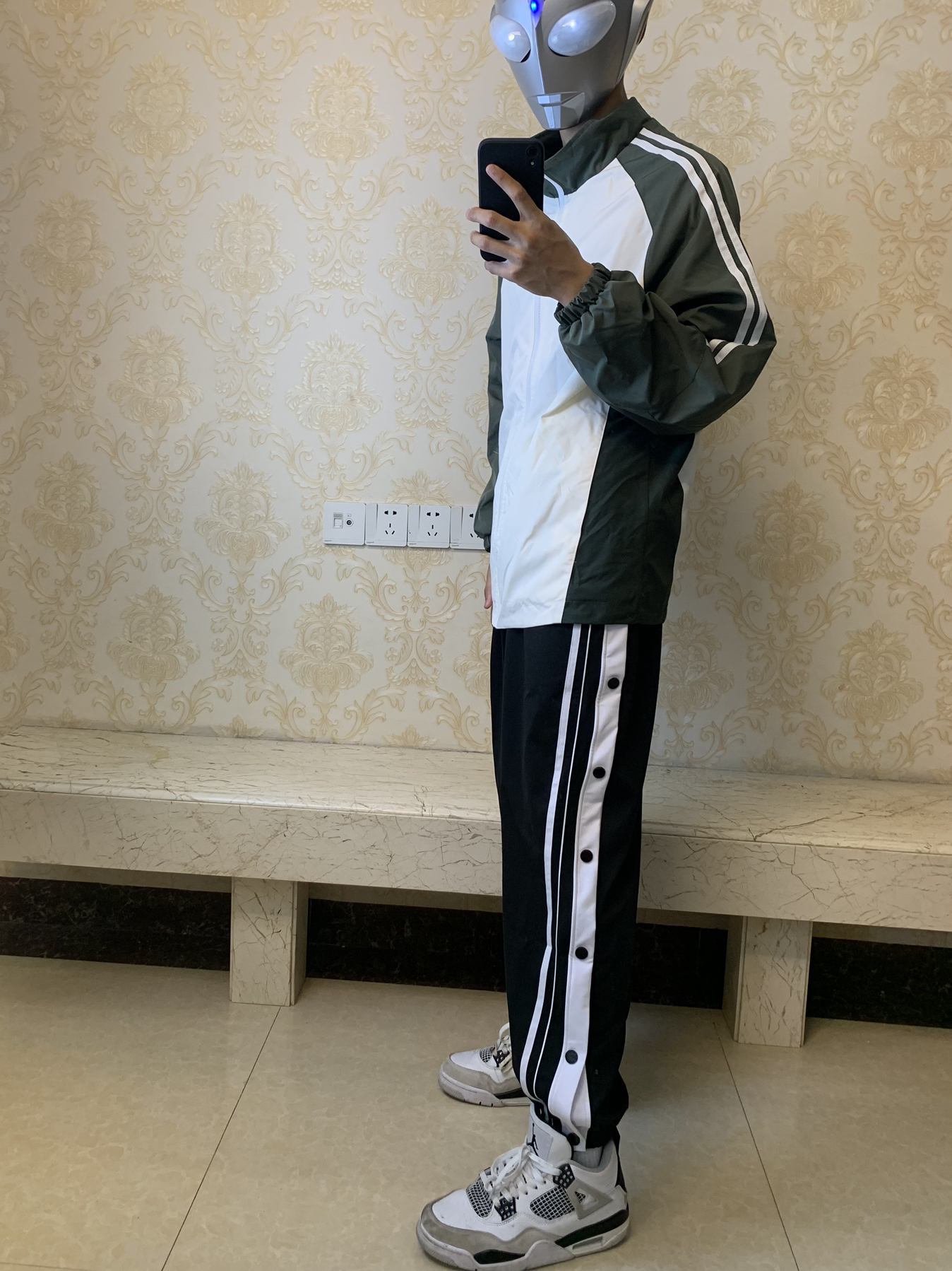 上身一款绿色外套 衣服手感舒适,宽松 搭配一款黑色运动裤 裤子没有束缚感 搭配一双运动鞋 休闲还恨帅好吧