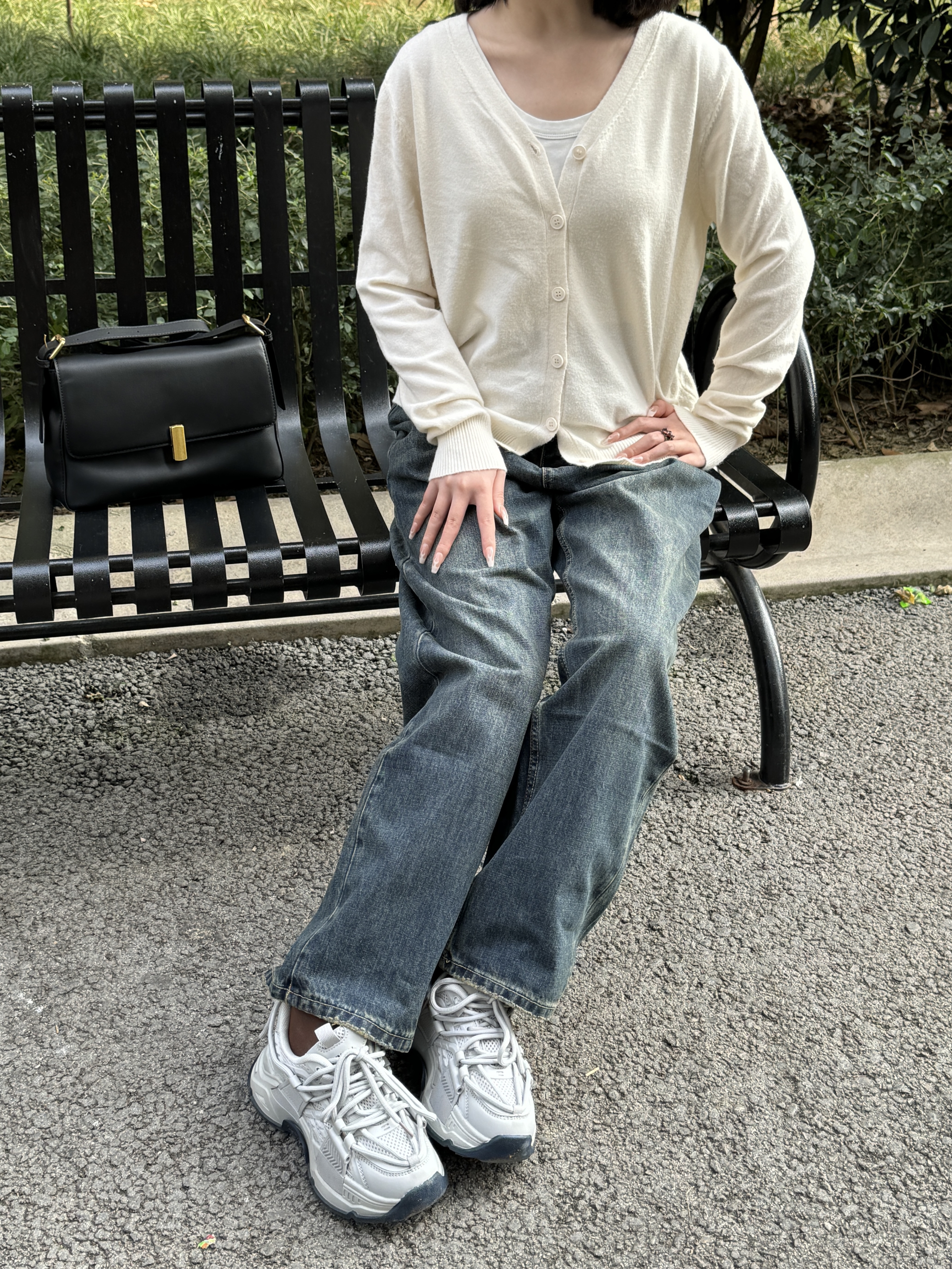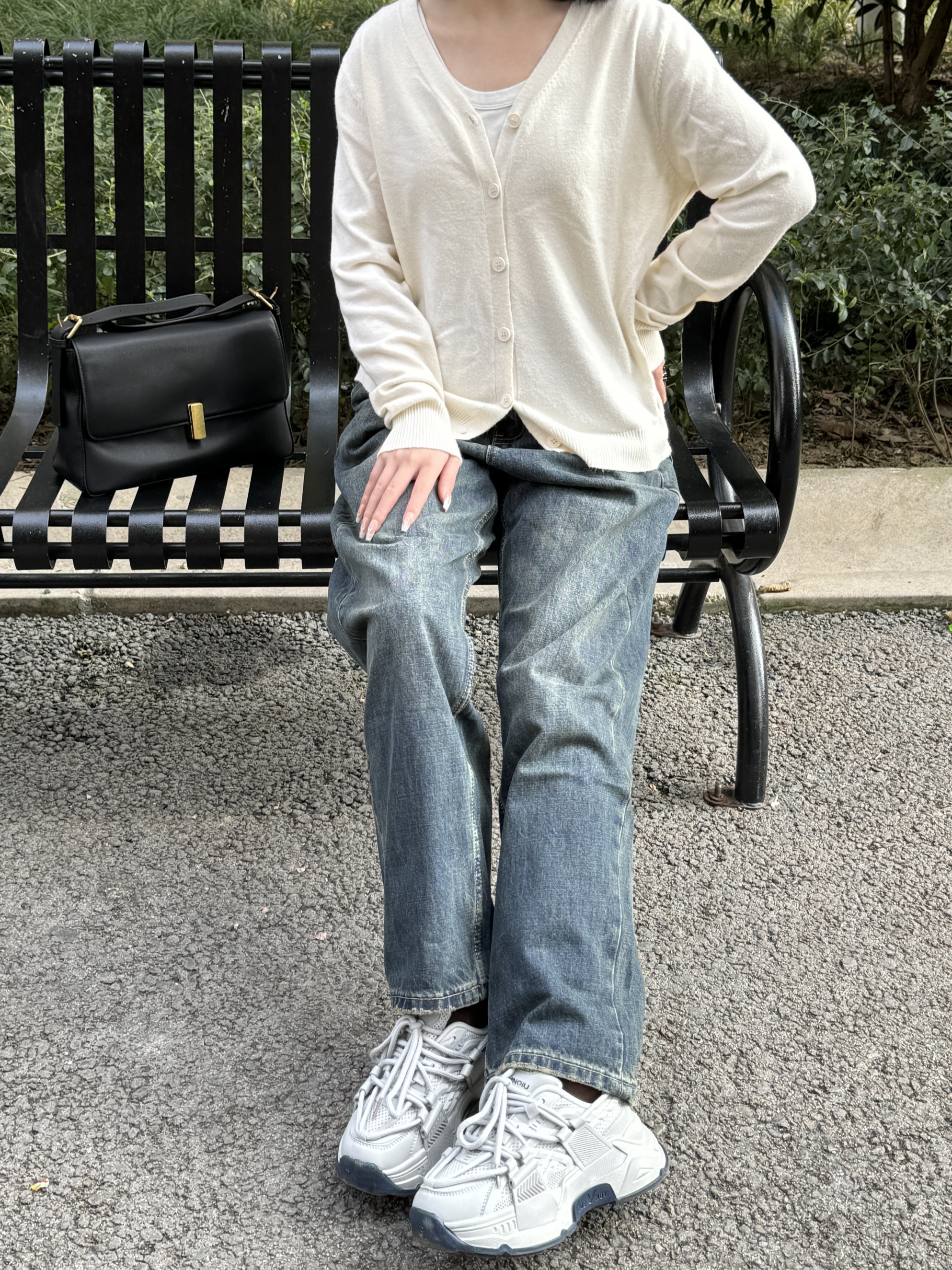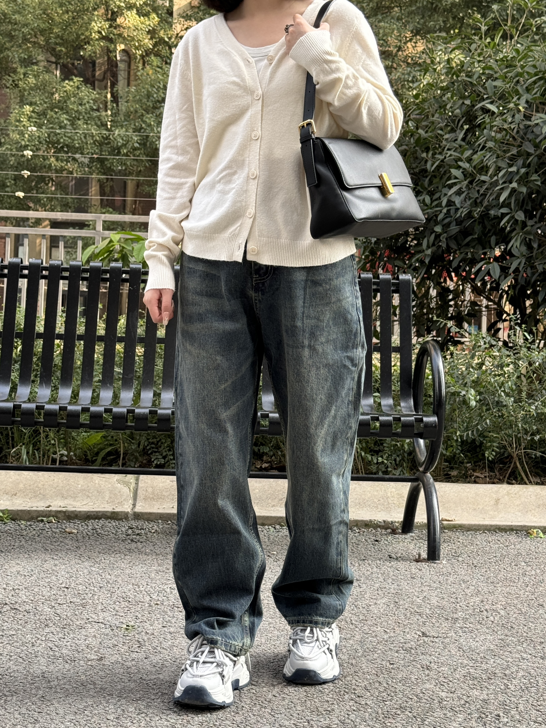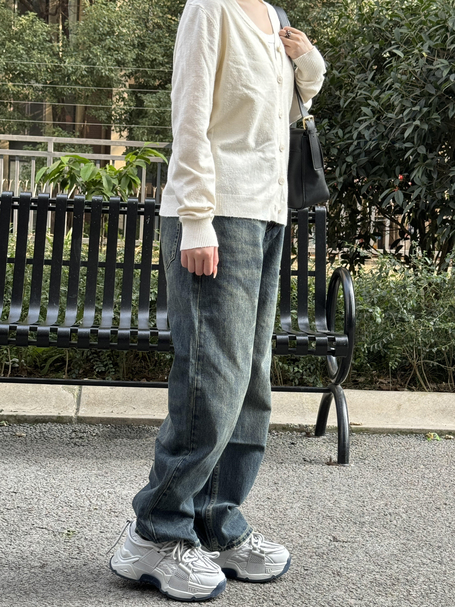 这是入手的 Voguo家的第二条牛仔裤了 真的太好看了这个颜色 敲复古 ~ 面料做工都很ok 而且不会显胯 上身hin有垂感 拖地的长度显得腿也很长诶! 上面搭的毛衣开衫 配上一双老爹鞋👟 慵懒与美式并存嘿嘿!