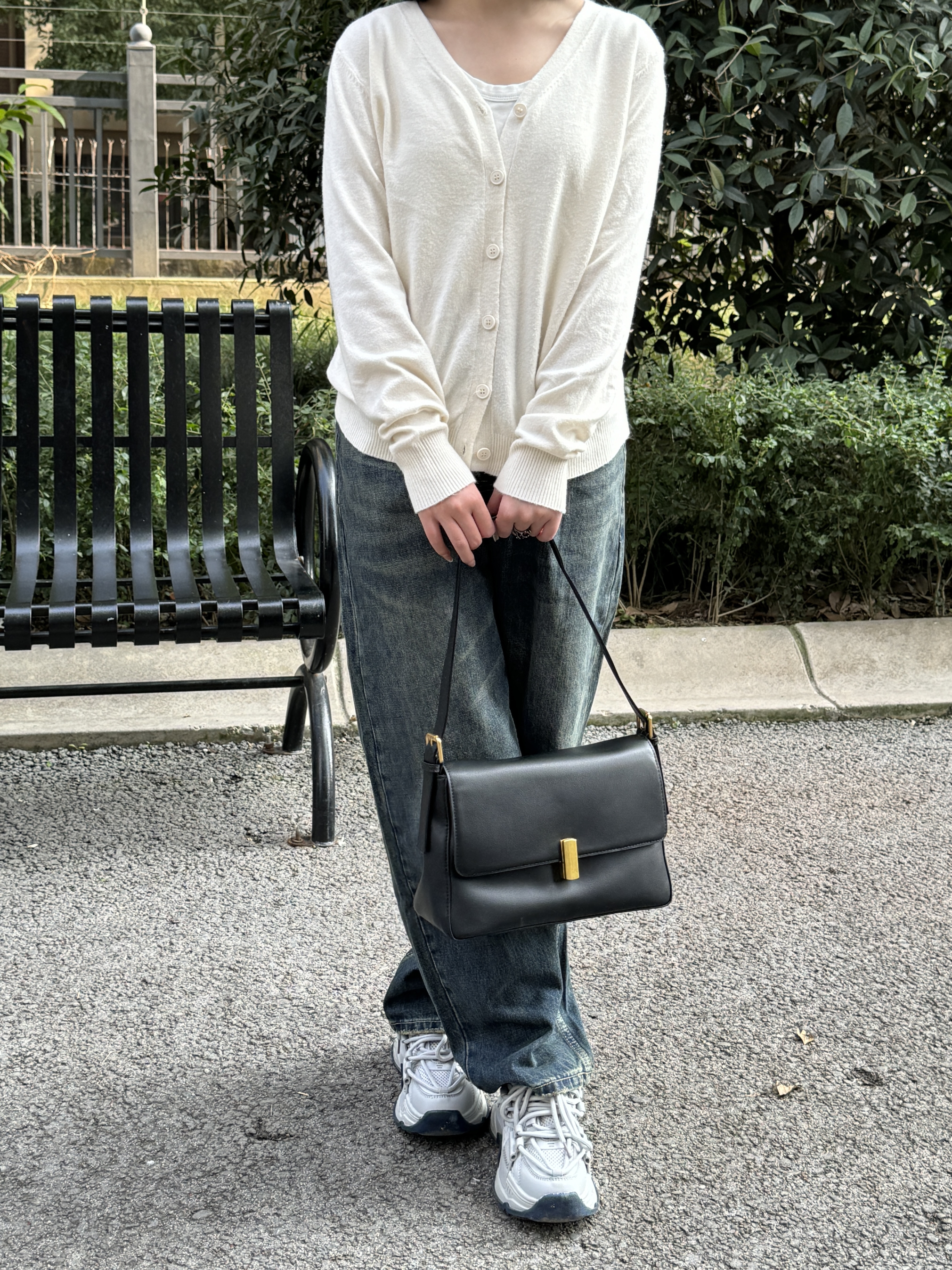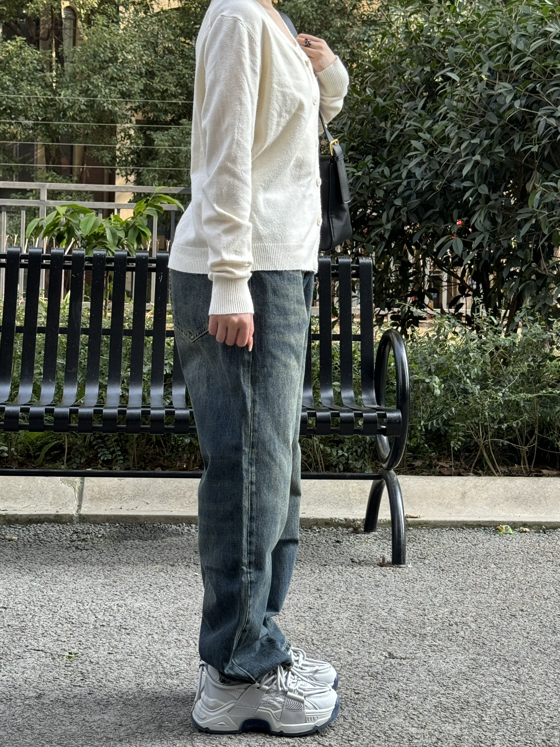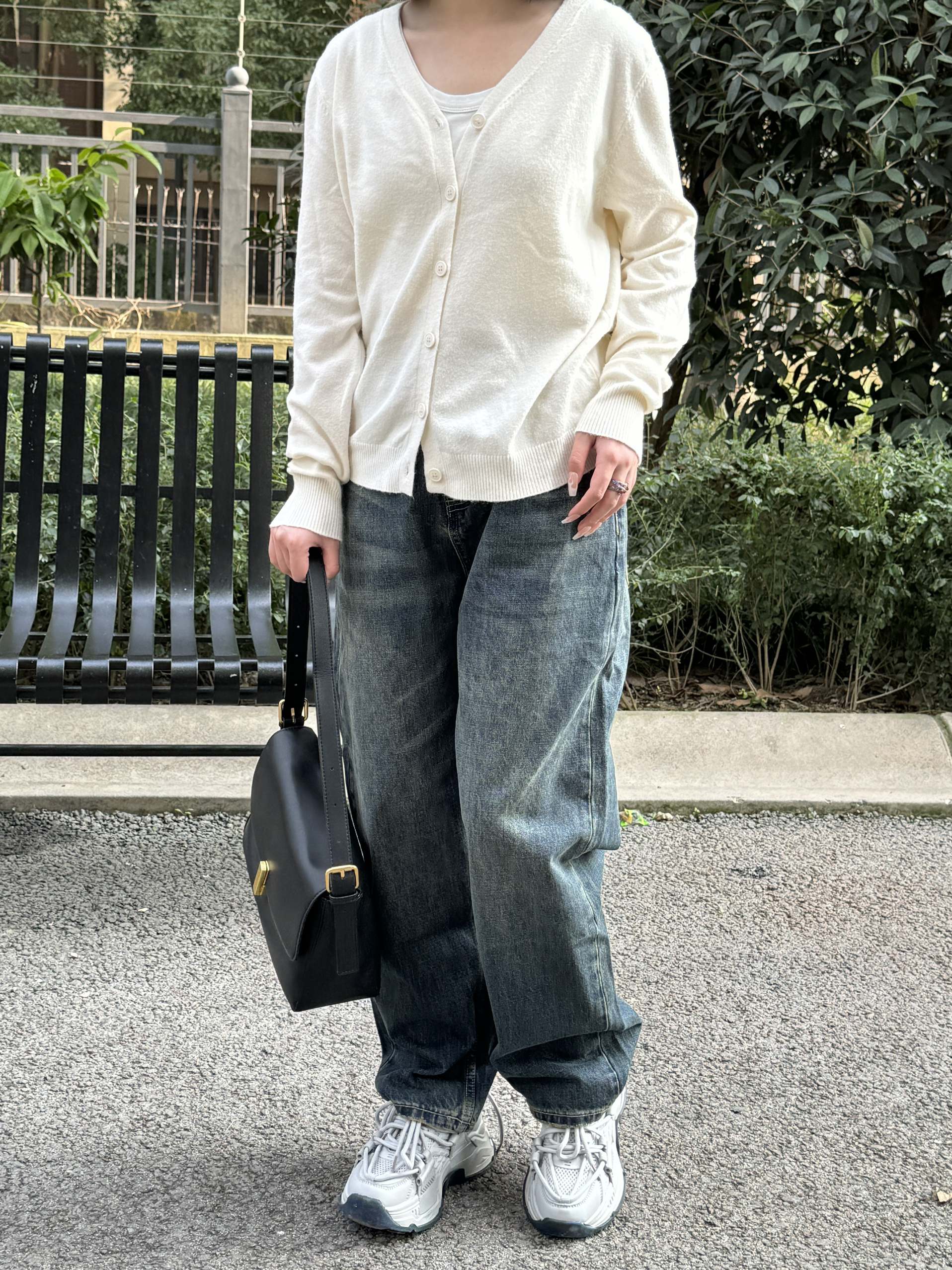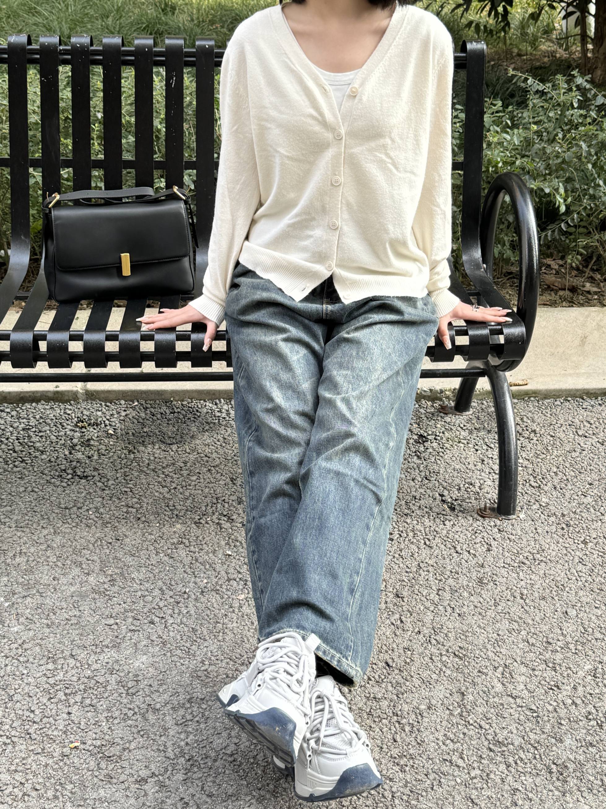 这是入手的 Voguo家的第二条牛仔裤了 真的太好看了这个颜色 敲复古 ~ 面料做工都很ok 而且不会显胯 上身hin有垂感 拖地的长度显得腿也很长诶! 上面搭的毛衣开衫 配上一双老爹鞋👟 慵懒与美式并存嘿嘿!