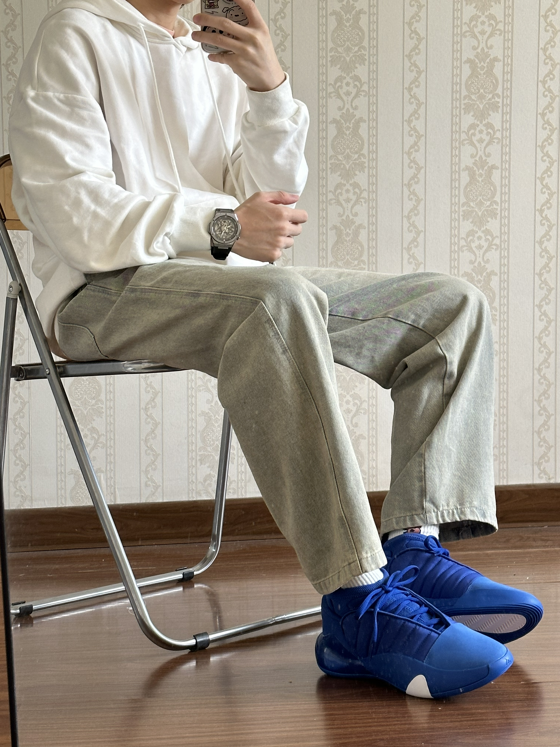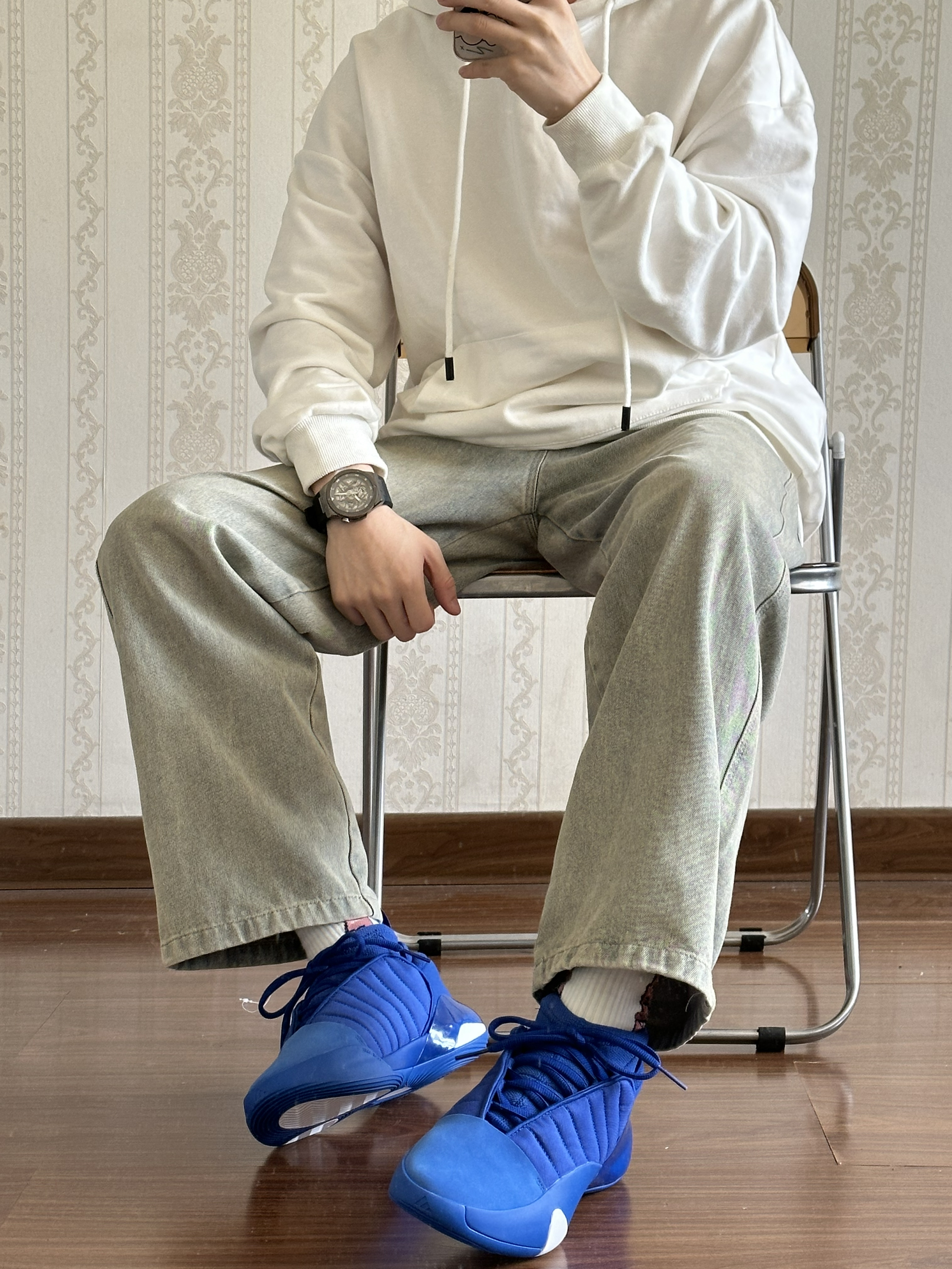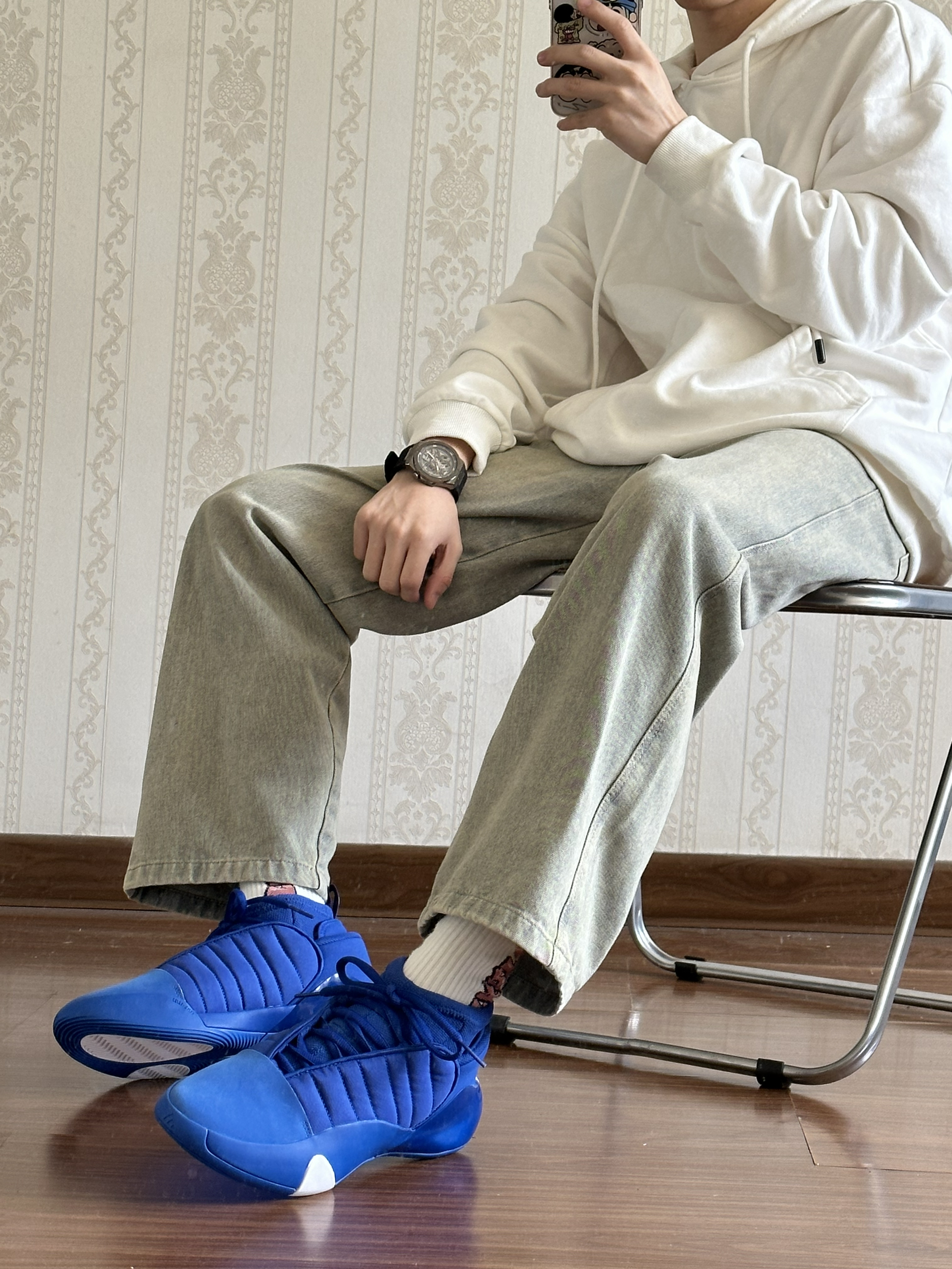 今天分享这双哈登7代 复古味十足 平常上脚穿搭也是很好看 后跟经典三条杠logo 这双白蓝配色一下就被种草了 上脚的感受后掌软弹 前掌场地感优秀 抓地力在各个场地也是完全没问题👌