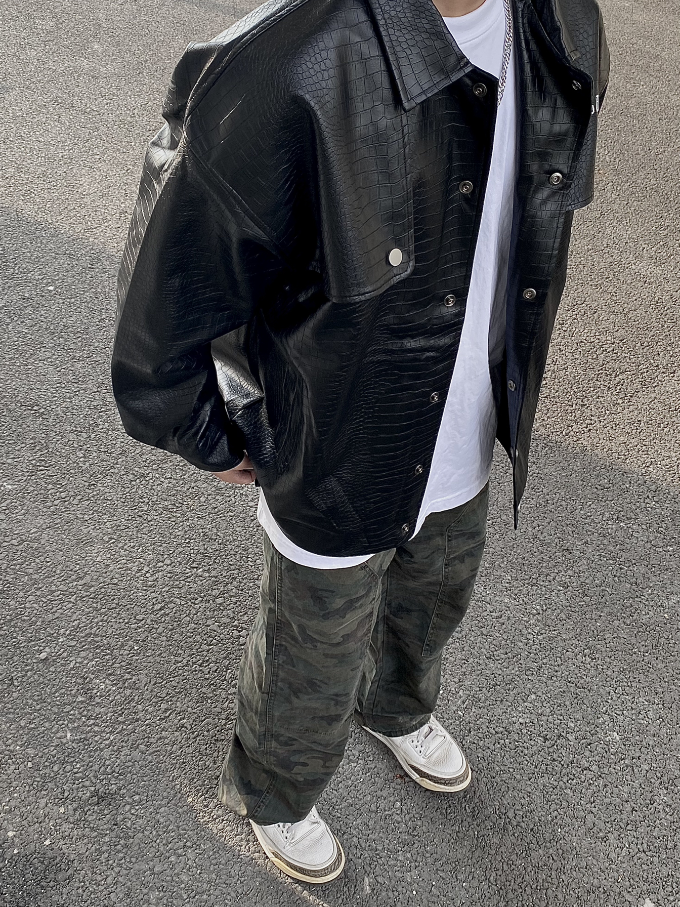 入秋后第一次尝试穿这种外套 见女朋友都夸看起来成熟又稳重 - 皮衣PU的材质 能轻松应对气候变化 鳄鱼纹路的设计 更能凸显男性痞帅感 经典复古版型绝对能让你成为街头焦点🌟 黑色搭迷彩 很难不🆒 简单搭配迷彩裤 直筒版型基本不挑人 水洗做旧面料 复古街头感狠狠拉满 迷彩元素独有魅力真的无法抗拒 - 今天这套简直就是谁穿谁帅系列❕