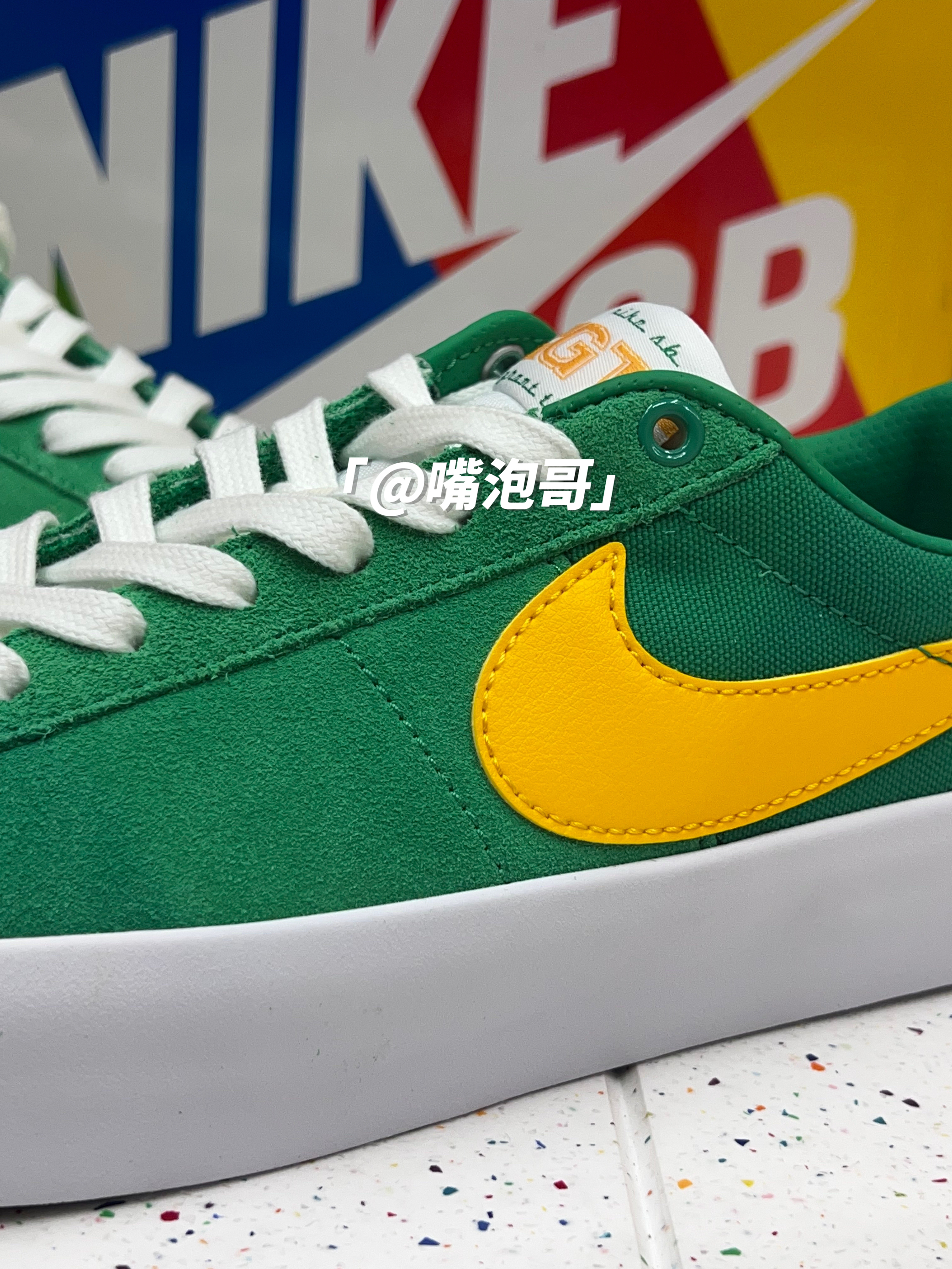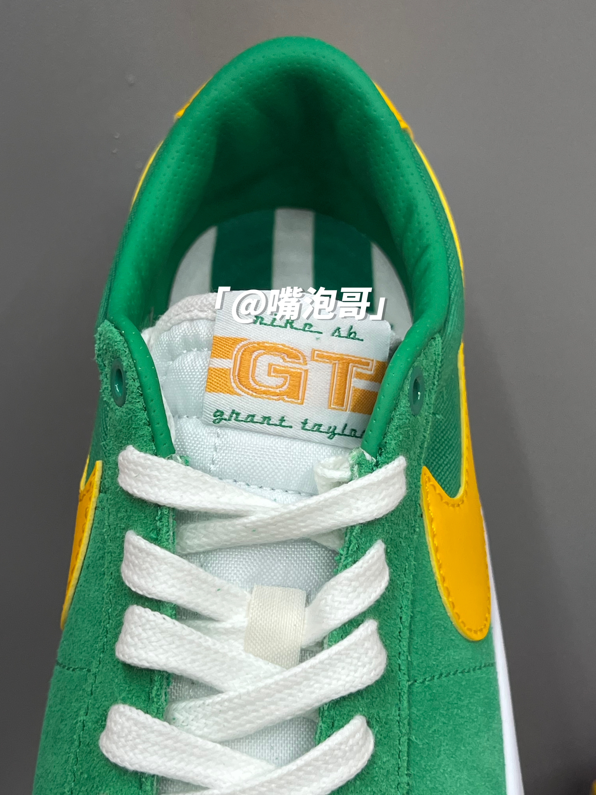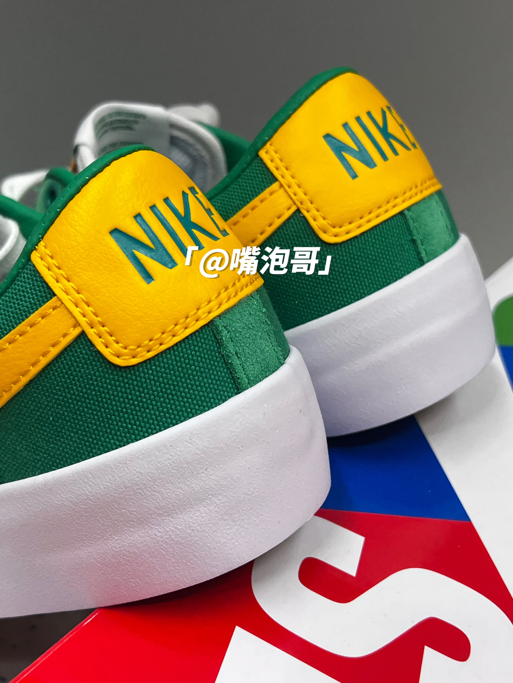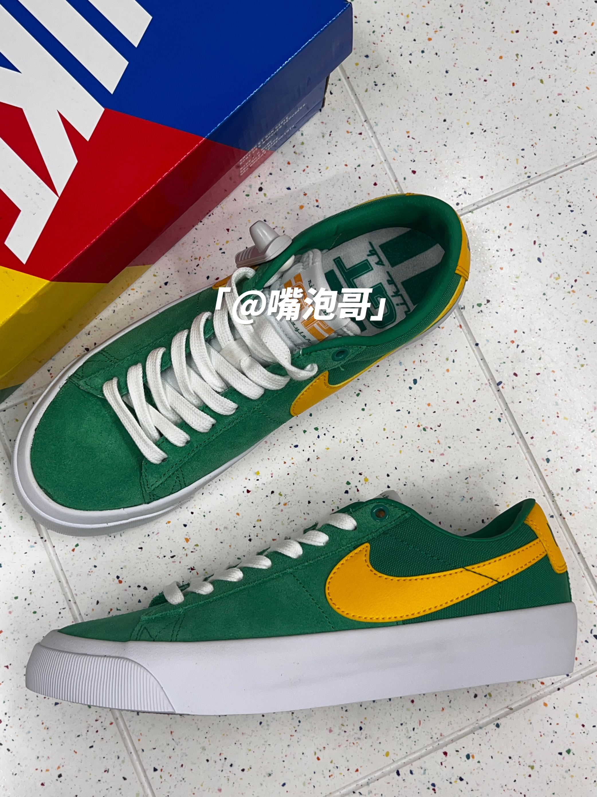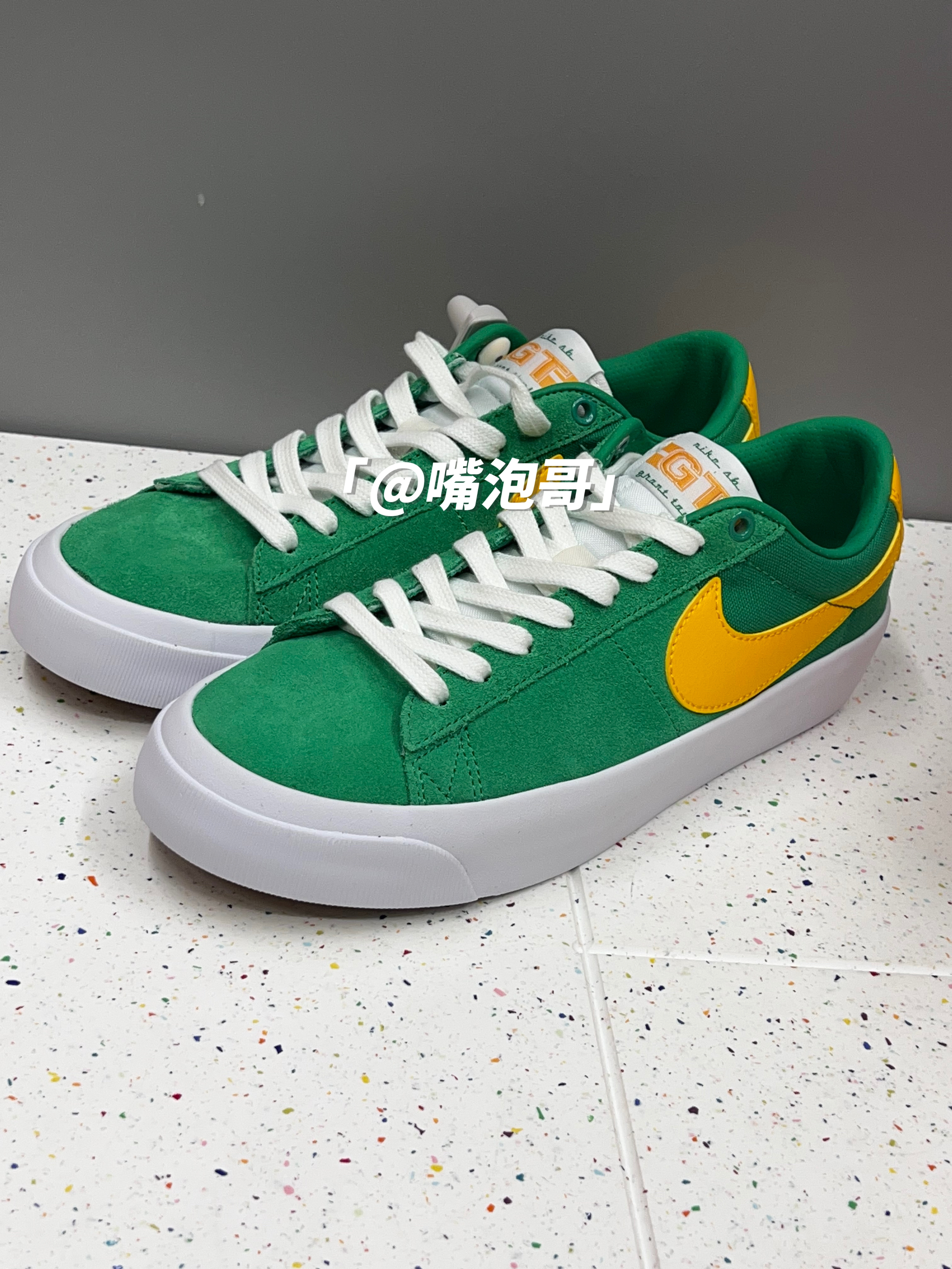 👟:Blazer Low SB Zoom GT 黄绿色 简介: 鞋款是一双低帮的SB系列板鞋,整双选用了绿色来呈现,在穿搭中很是显眼,细节处又加入了黄色装饰,从而使鞋子更有辨识度,麂皮与帆布材料使用,又使鞋子很有质感,搭配上鞋垫里的气垫,使脚感得到提升。 细节: 鞋面选用了麂皮与工程帆布的组合,是鞋面具有良好的耐磨性同时又增加了鞋子的质感,鞋身两侧的swoosh选用了黄色皮革制成,鞋舌...