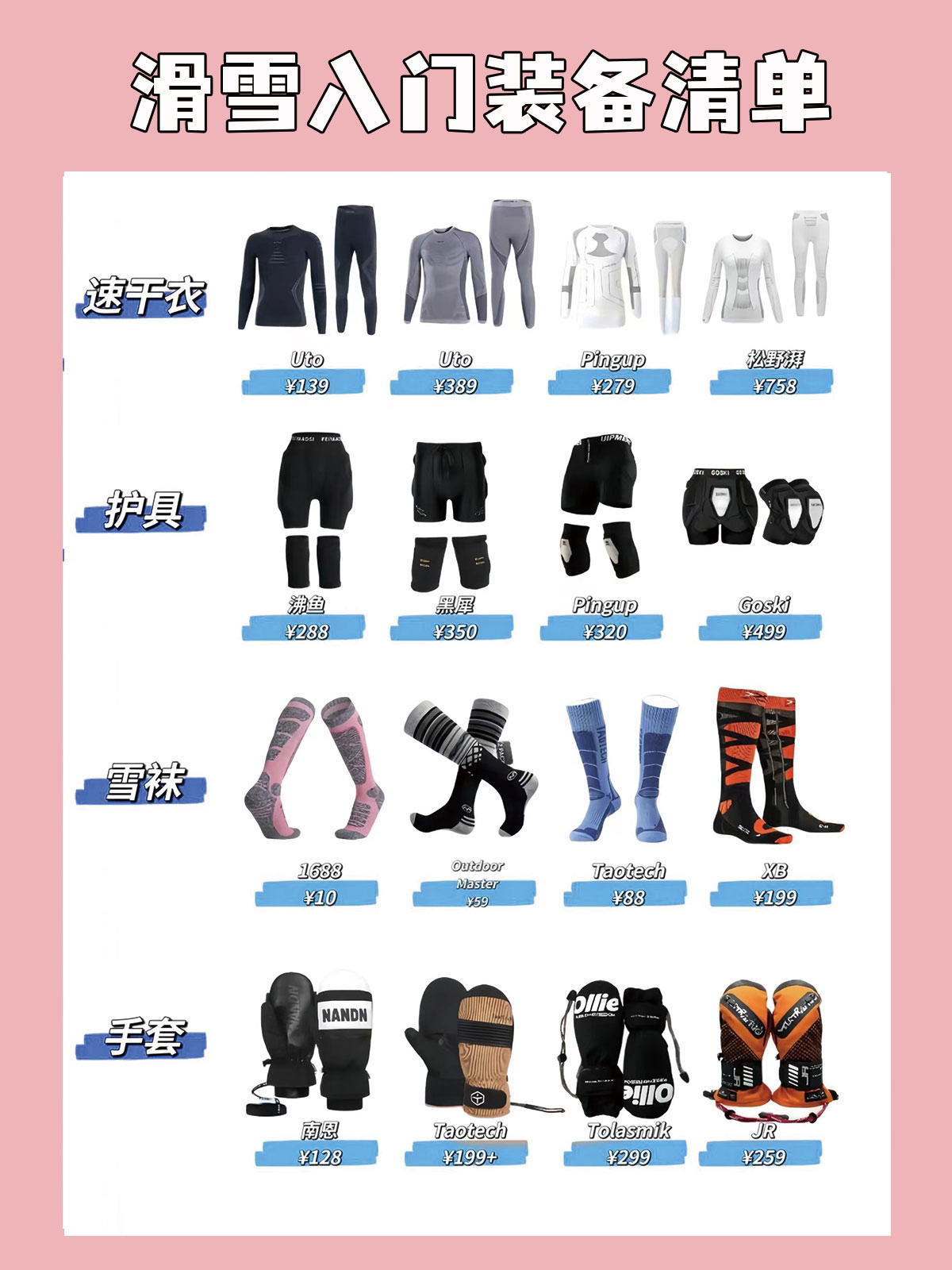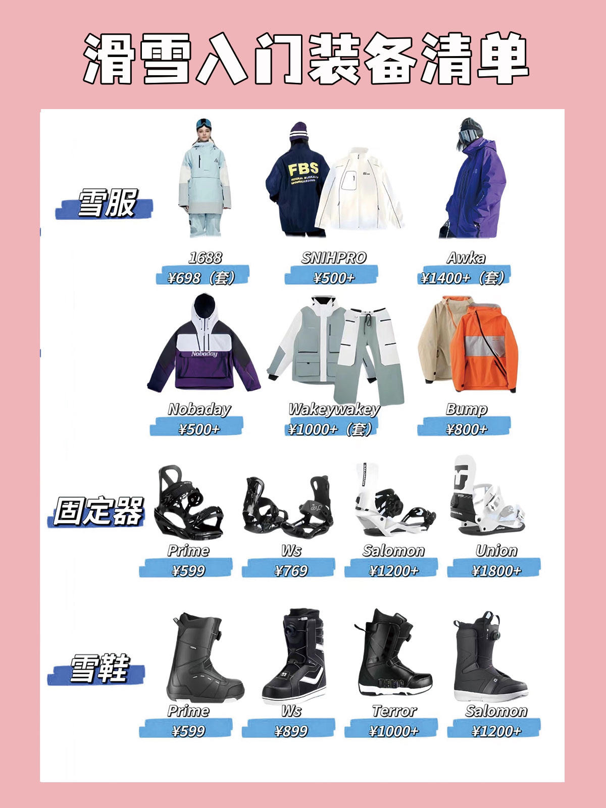滑雪新手必看,基础装备清单在这,雪季来啦,去滑雪要准备什么?今天整理了1⃣️份滑雪新手基础装备清单。 准备入坑滑雪运动的,可以帮助大家更好的选择装备!平价版的入手无压力😌😌😌 ✅雪板: Nobaday小黑板pro、Vamei、Terror ✅雪鞋:(雪鞋就是看价格了,便宜的软贵的硬) Salomon(1.2k+)、Prime(500+)、Terror(1k+) ✅固定器: Union(平花...