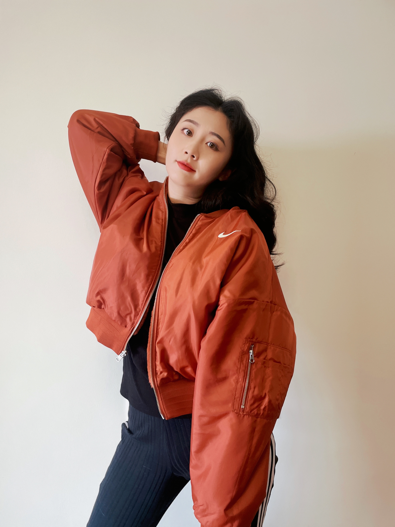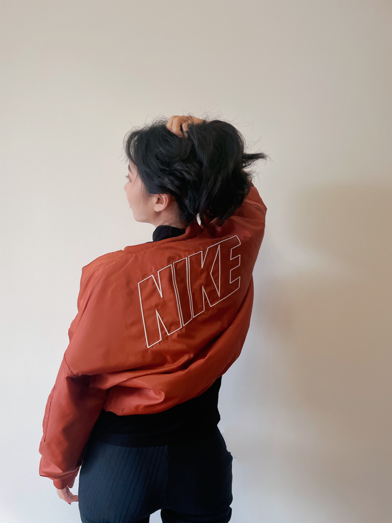 这件外套可双面穿搭,一面是有光泽度的长绒面料 上身效果会显一些富态,另一面是印有NIKE字样的 棒球夹克,会显的更加青春活力些。 双面颜色都为橙红色,在商场一眼看到感觉会很挑人,上身试穿后太显气色了,果断拿下最近天气刚好适合,随便搭了下效果很不错。