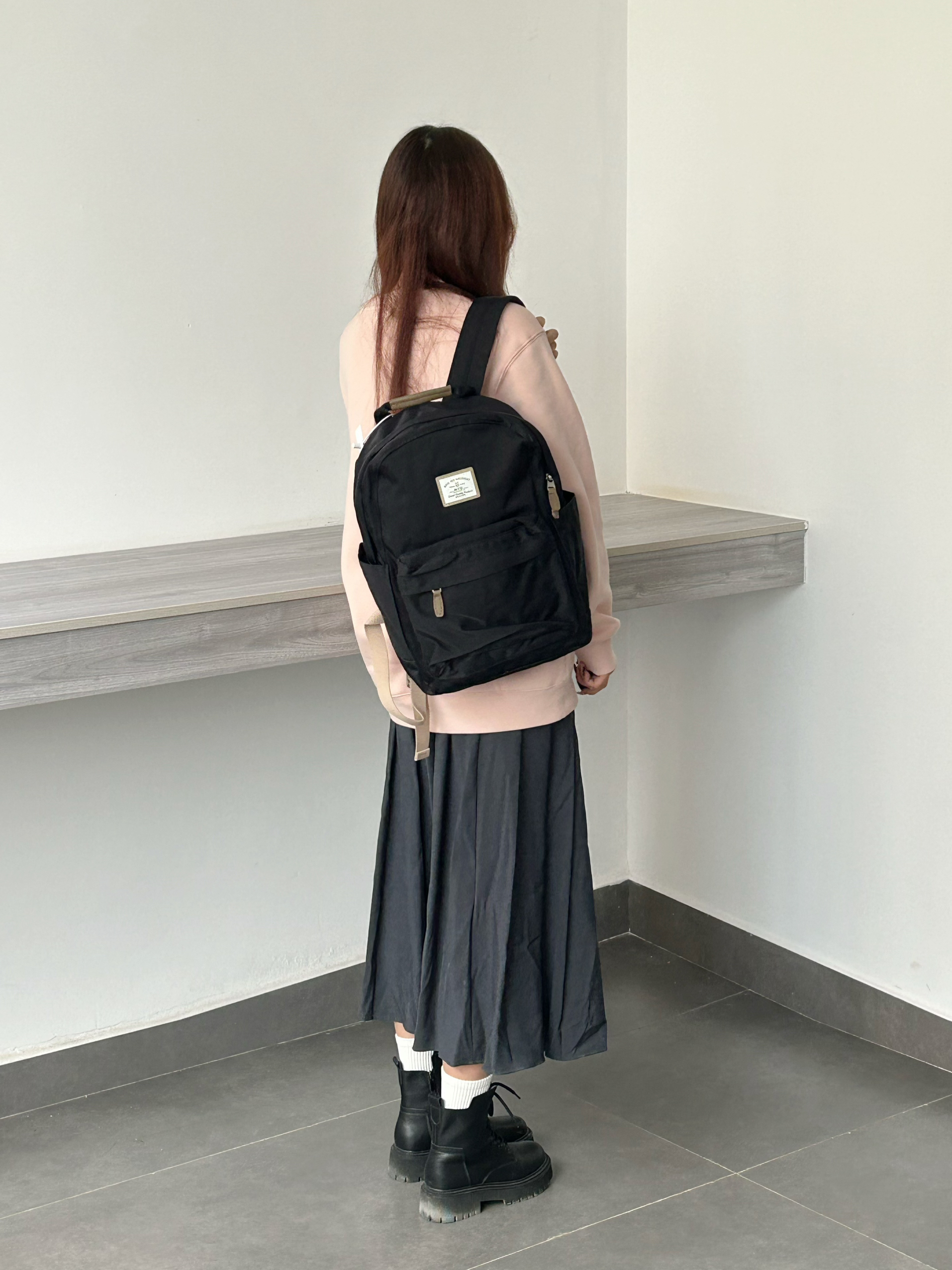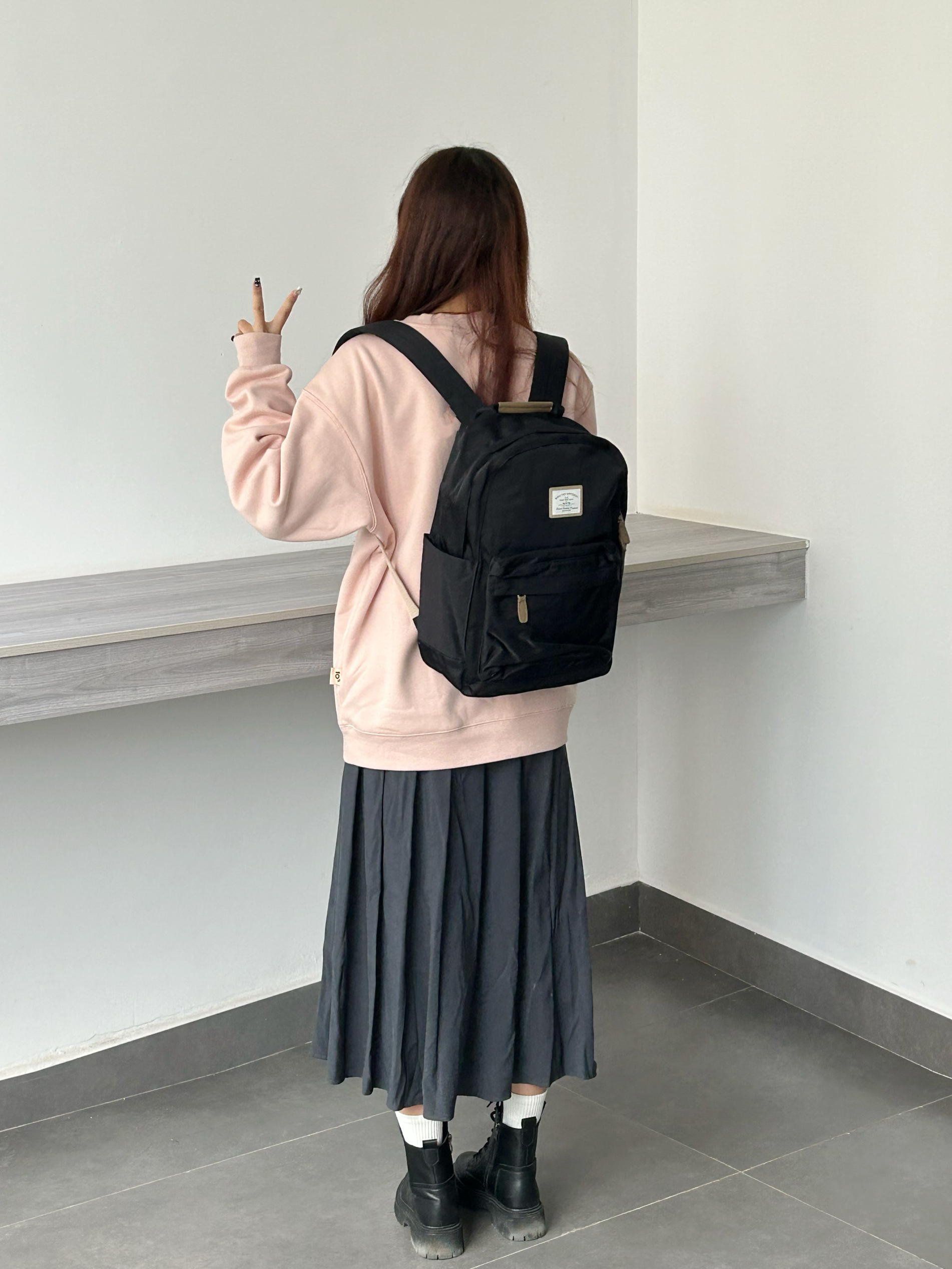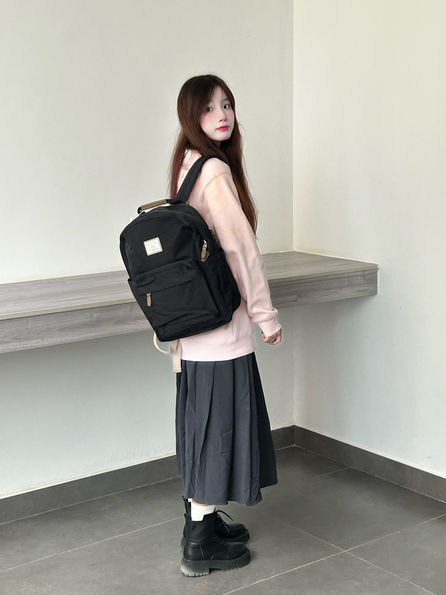 今天穿什么 今天穿 粉嫩嫩卫衣 ➕ 灰色裙子 ➕ MYD 奶茶系列 双肩包 今天是 学院风穿搭 韩里韩气的一款双肩包呀 黑色的颜色 耐看且百搭 里面还🈶隔层很多 属于是大容量包包啦