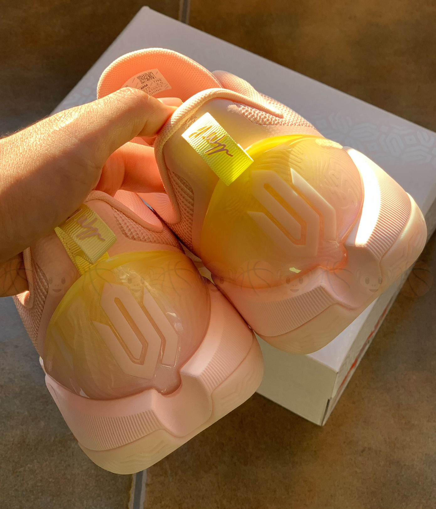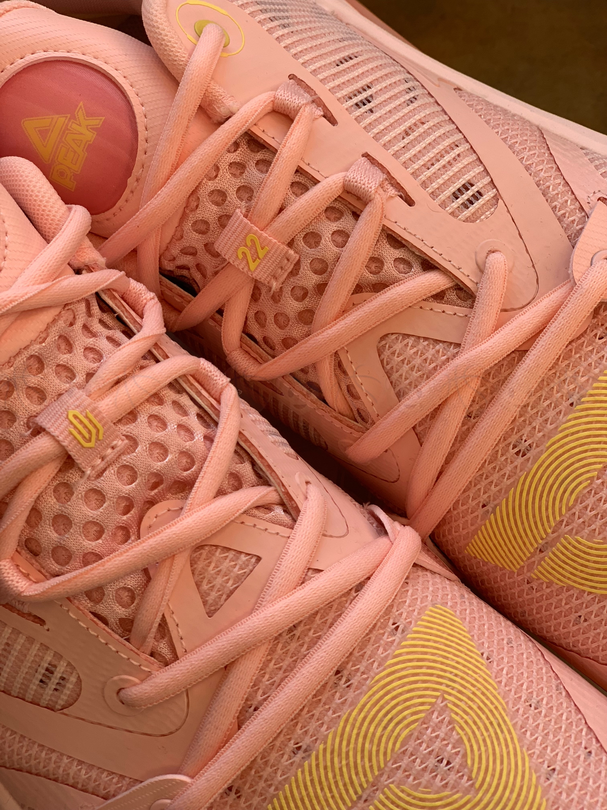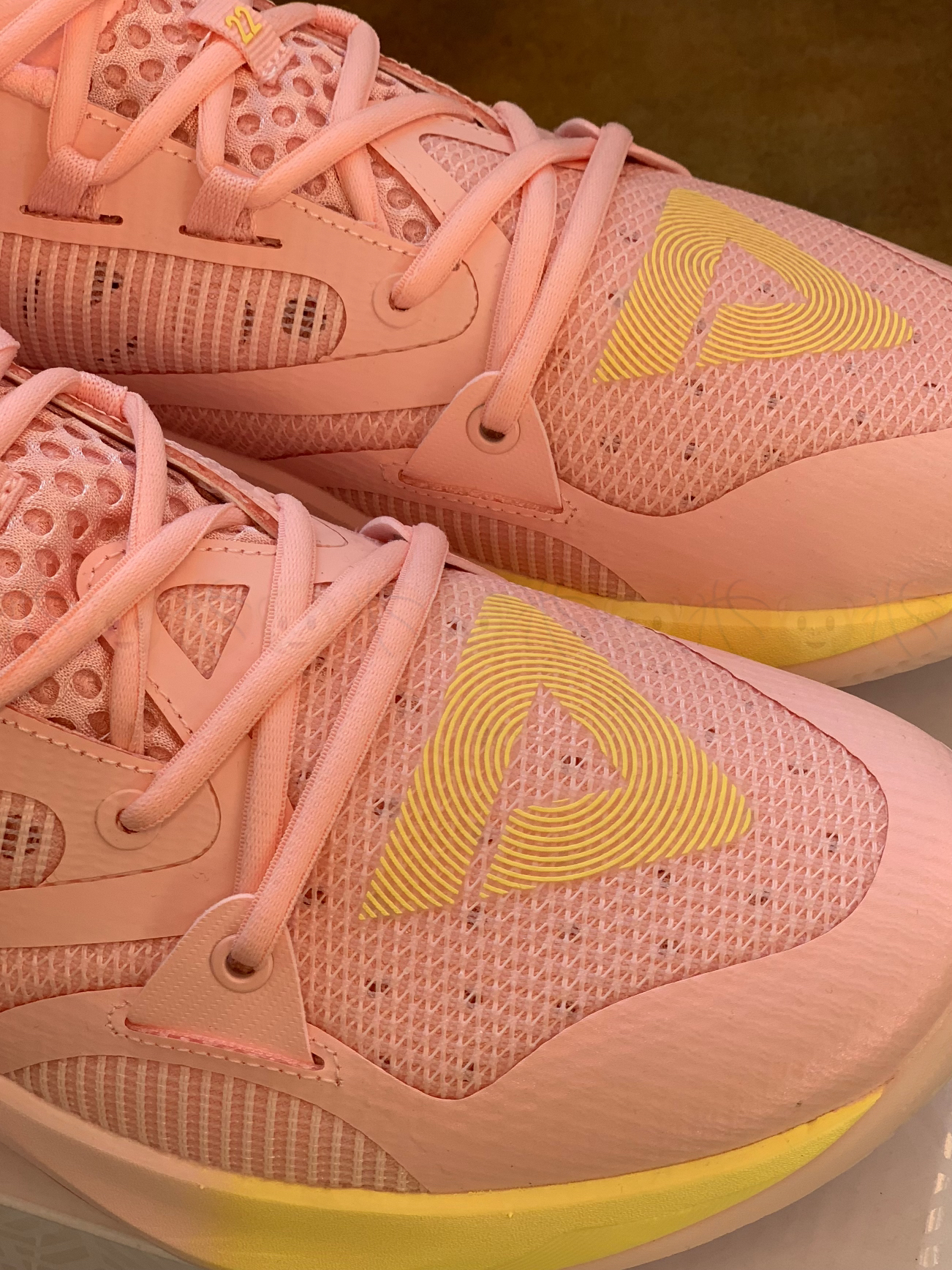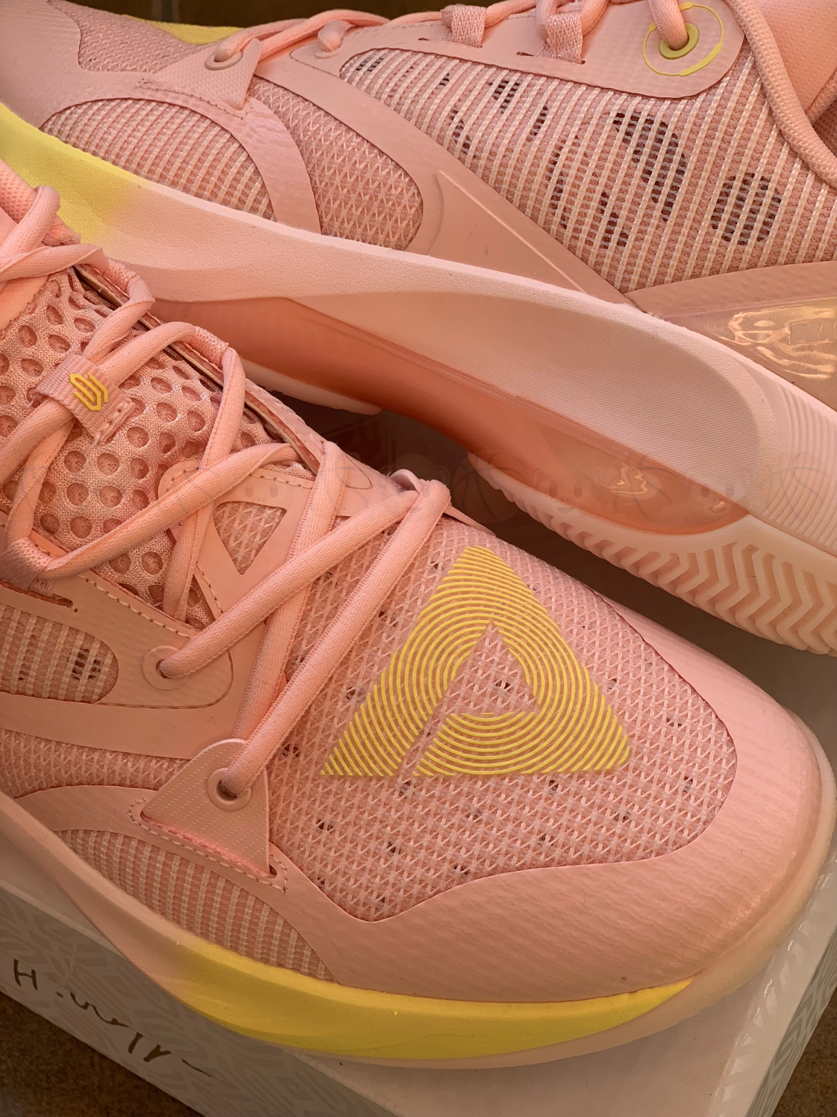 和大家分享这双水蜜桃🍑配色的匹克威金斯天赋1代的开箱 试穿之后第一感觉就是他对宽脚的朋友简直太棒了,可以选择小一码到1.5码都没问题,无论是两侧还是上下的空间,都很足,中底的缓震试穿感觉静态下还不错,看看动起来会怎么样