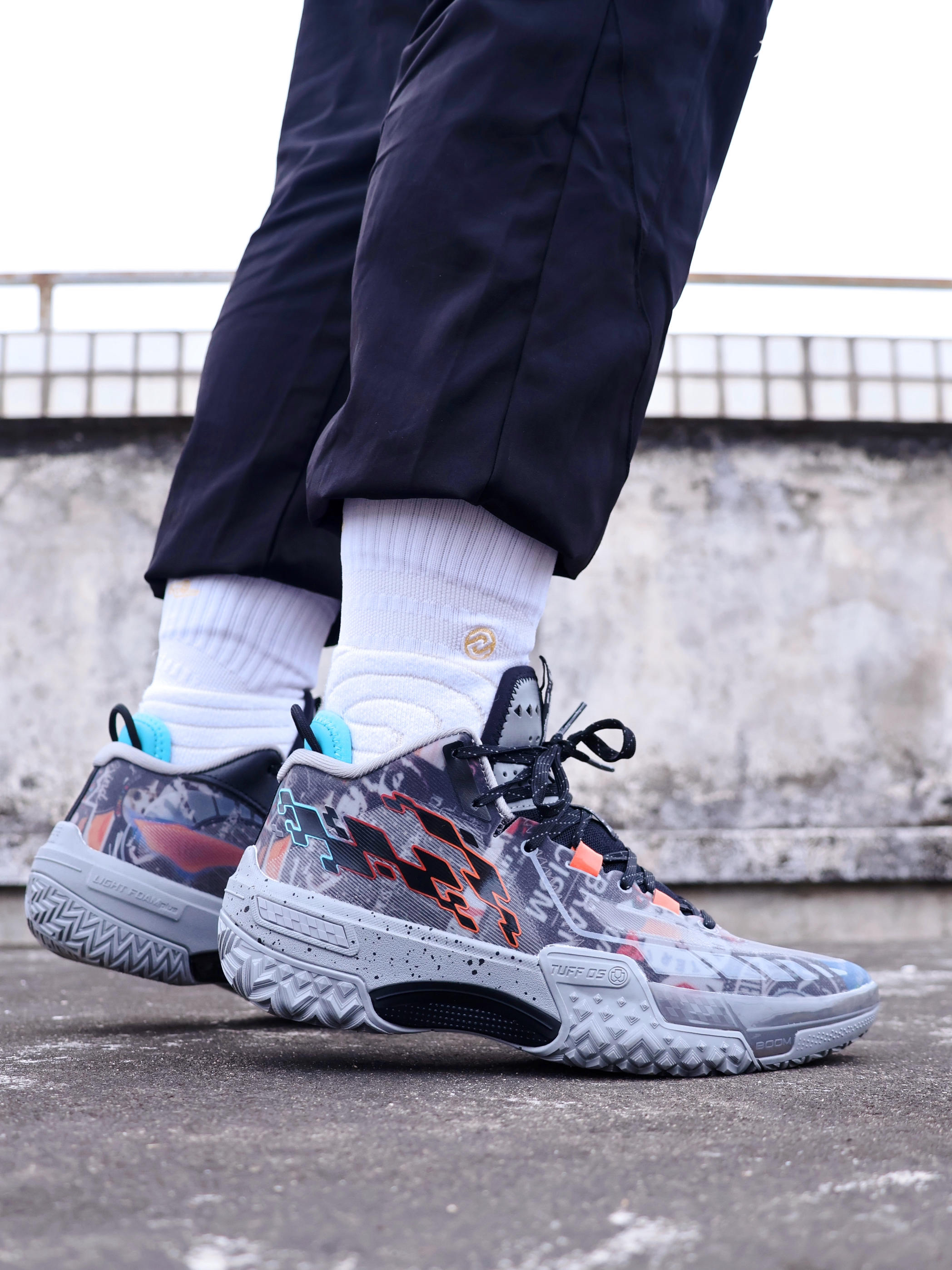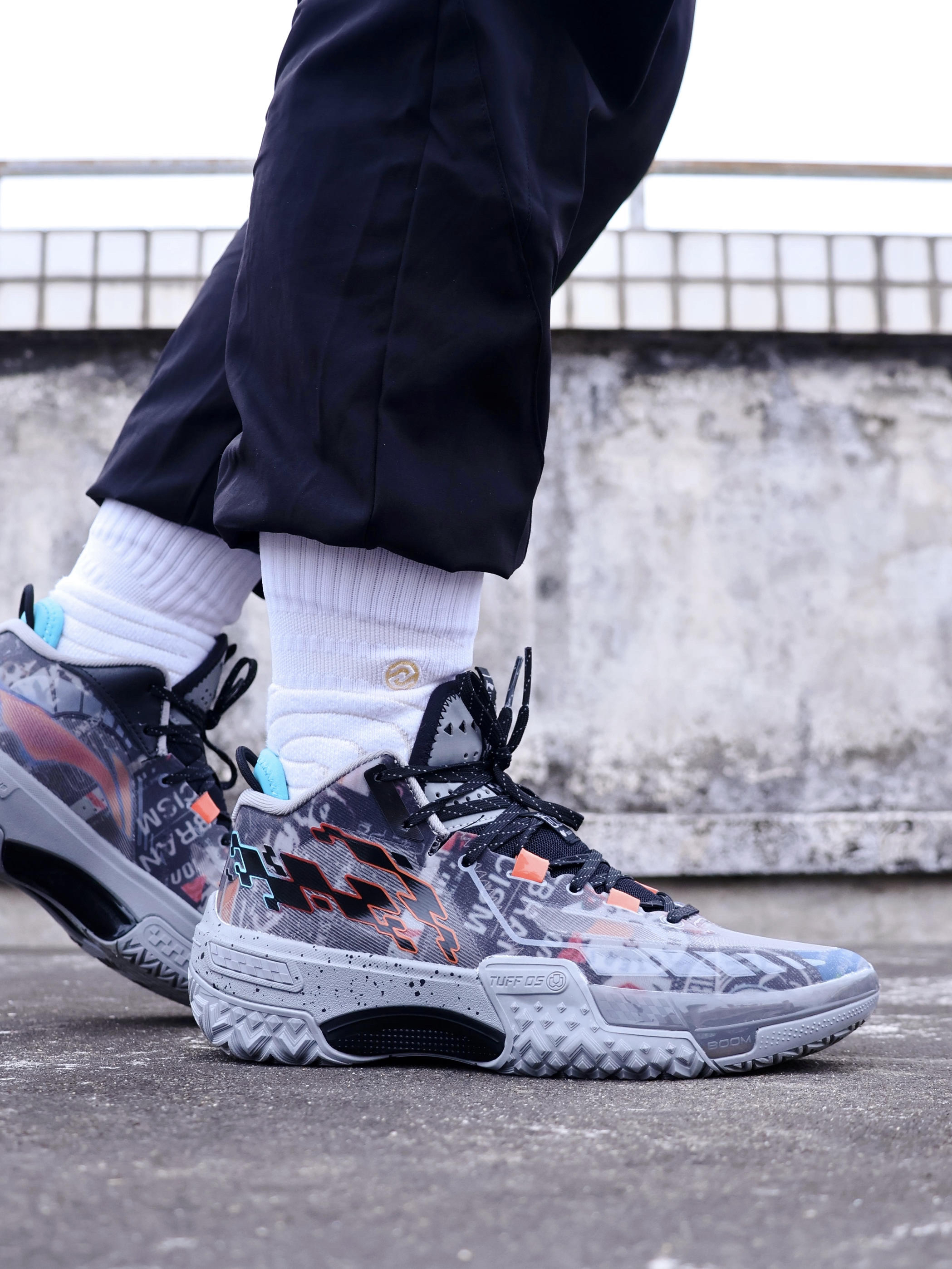 如果你经常打外场,这双桀骜画报配色非常合适!这双鞋的上脚体验如何?有哪些优点和缺点? ✅优点 1、鞋子的重量方面,单只41.5码重367克,这个重量我觉得控制的还是很不错的。 2、画报配色的鞋面很耐脏,鞋面类似涂鸦的风格,接近水泥灰的颜色。 3、鞋子的包裹和舒适度非常好,不需要磨合,拿到就能穿去实战,而且这双鞋的鞋带孔两端离得很近,加上它有两组动态飞线,这套绑缚系统能把鞋面收的很紧,牢牢的把脚锁...